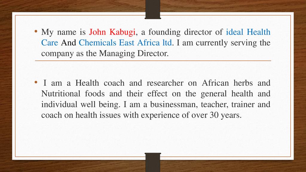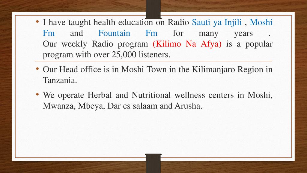 Biographical information: John Kabuge, Founding and Managing Director of Ideal Health Care and Chemicals East Africa Ltd. is a health coach and researcher on African herbs and nutritional foods. A businessman, teacher, trainer and coach on health issues for over 30 years he has taught health education on radio for many years by a weekly radio program (Kilimo Na Afya ), a popular program with over 25,000 listeners. His company operates Herbal and Nutritional wellness centers in Moshi, Mwanza, Mbeya, Dar es Salaam and Arusha. The company is committed to God’s word and work and with our sister organization, Chuo cha Elimu kwa wote, educational seminars are given on nutrition, good eating habits, hygiene, food quality and good agricultural practices incorporating conservation of the soil and food security.