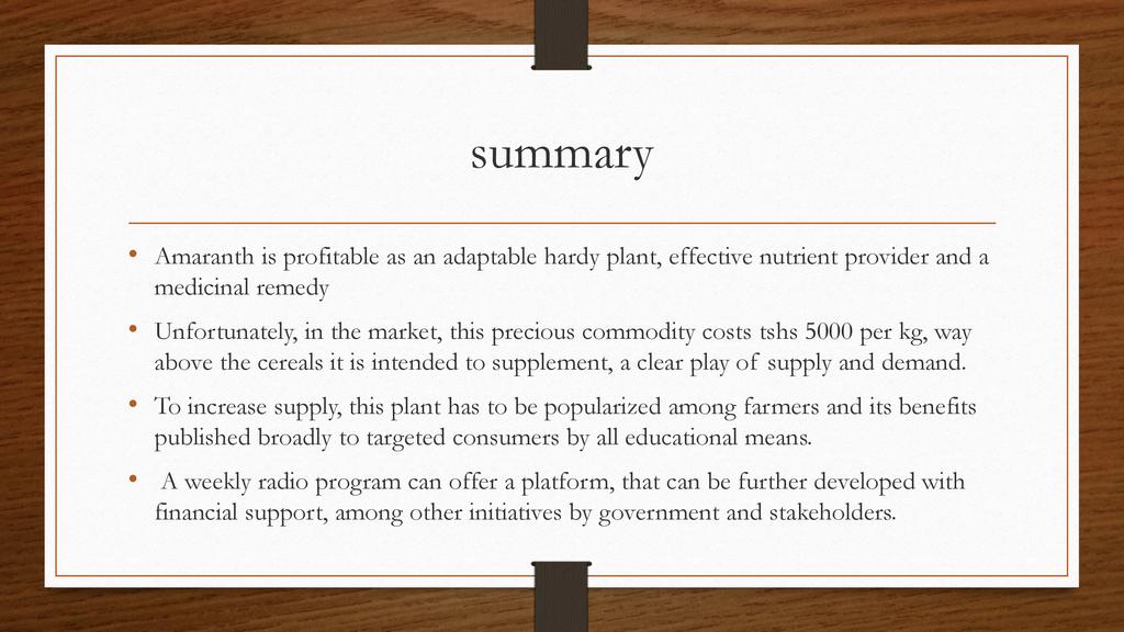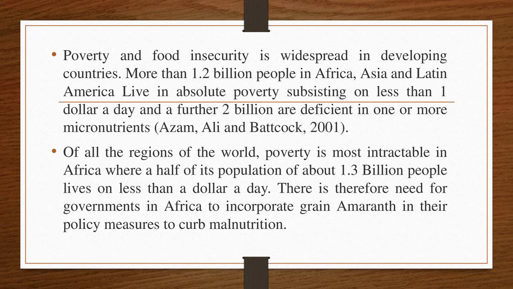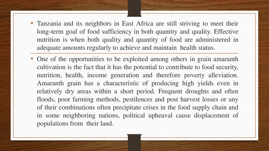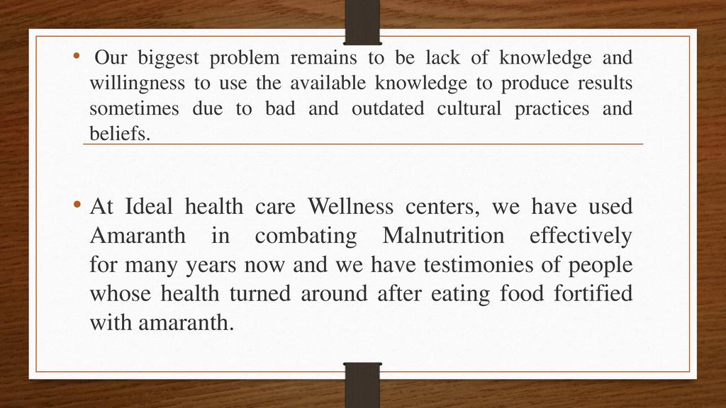 Session: Africa has the capacity to feed its children affordably and cost effectively if its vast resources are well harnessed and developed bringing and end to the continents constant food shortages and the shameful food handouts from other continents which do not enjoy the same kind of resources as Africa. We have used Amaranth in combating malnutrition effectively for many years and we have testimonies of people whose health turned around after eating food fortified with amaranth. We have the necessary resources in Africa that can turn the continent into a major food exporter and bread basket of the world within a short space of time. Our biggest problem remains to be lack of knowledge and willingness to use available knowledge to produce results sometimes due to bad and outdated cultural practices and beliefs.