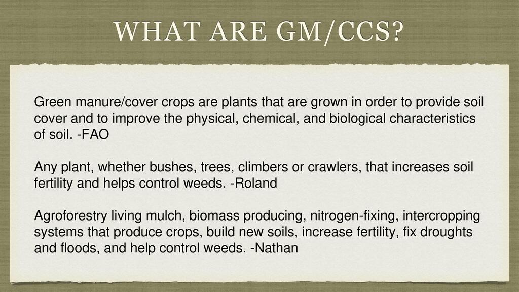 According to the FAO, "Green manure/cover crops are plants that are grown to provide soil cover and to improve the physical, chemical, and biological characteristics of soil."