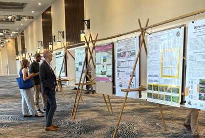 Research posters displayed on bamboo “A frames.”