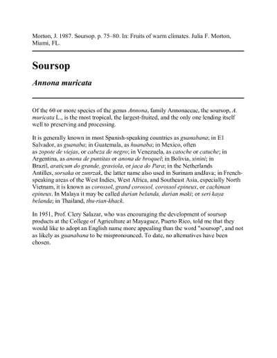 Morton, J. 1987. Soursop. p. 75–80. In: Fruits of warm climates. Julia F. Morton, Miami, FL.