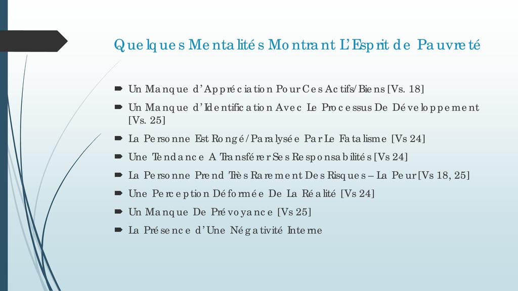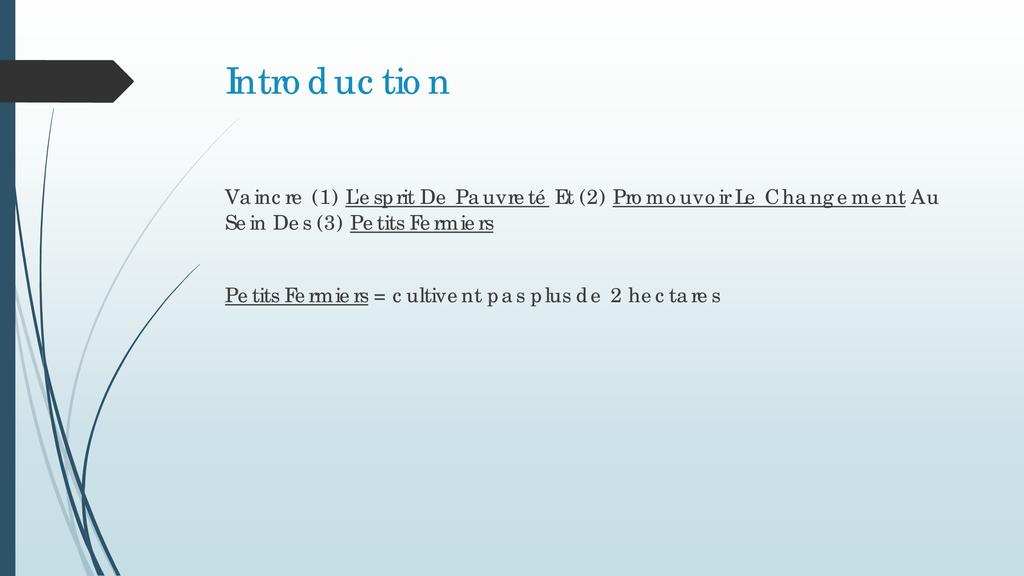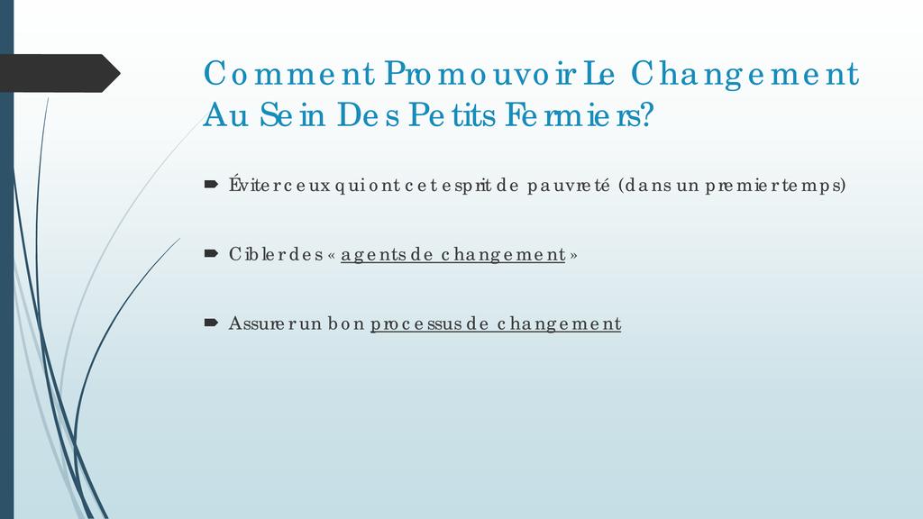 Les petits fermiers sont dans un cycle infernal de pauvreté. Bien sûr leurs conditions de travail y est pour quelque chose, mais force est de reconnaitre que la pauvreté pourrait être aussi psychologique. Il s'agira donc dans cet exposé de proposer une série d'activité et de conduite à mesure d'aider les petits fermiers à rompre définitivement avec le cycle de la pauvreté.