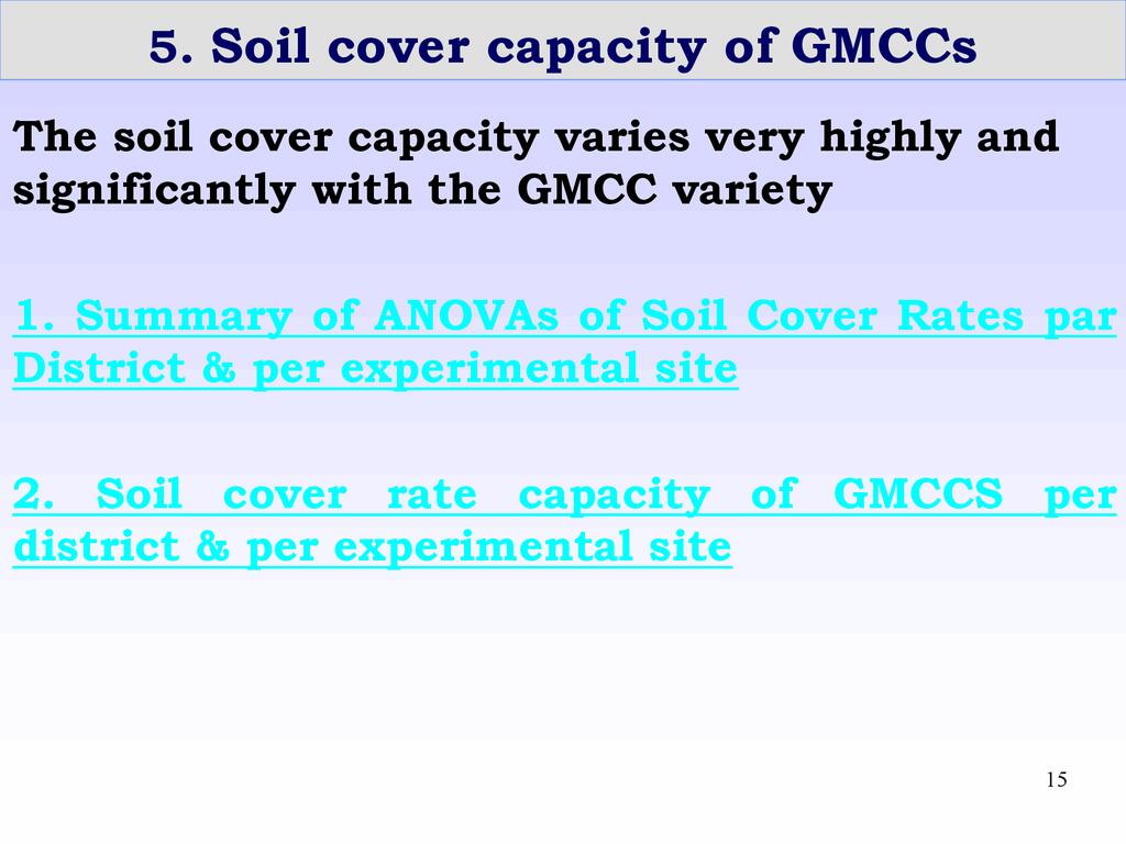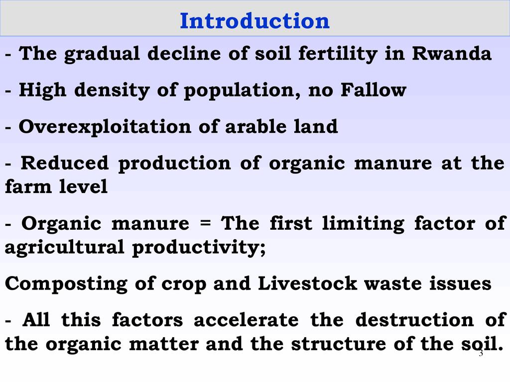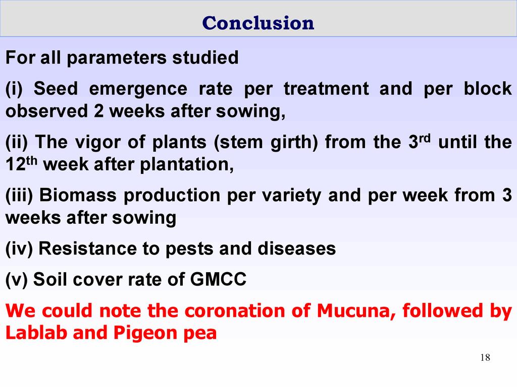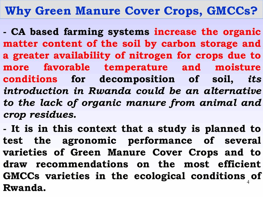 Session: Permanent ground cover is one of the fundamental principles of conservation agriculture. This coverage can be achieved by keeping crop residues on the ground, but if the time between harvest and installation of the next crop is large, it may be necessary to install other cover plants during this interval. The agronomic performance of four varieties of green manure cover crops (Lablab p., Pigeon pea, Cowpea and Velvet bean) was compared to the control in six representative Districts of Rwanda for physical growth, resistance to pests & diseases, soil cover capacity, biomass production and soil fertility. For all analyzed parameters, Velvet bean (Mucuna) was significantly superior over the others on all the experimental sites. This soil cover crop offers the best benefits for (i) soil protection during the fallow period, (ii) mobilization and recycling of nutrients, (iii) improvement of soil structure, i.e., de-compaction of encrusted layers, and (iv) control of weeds and pests.