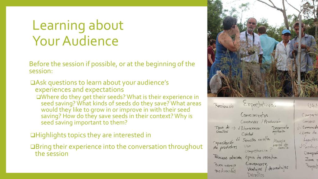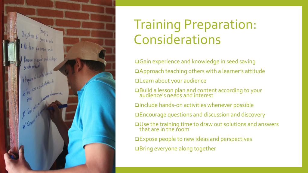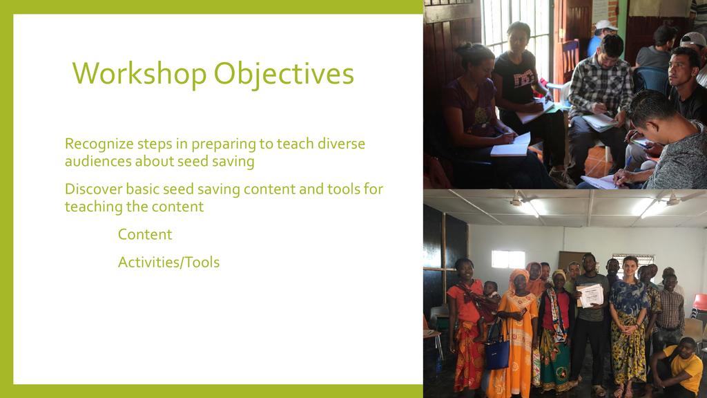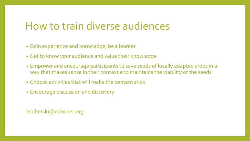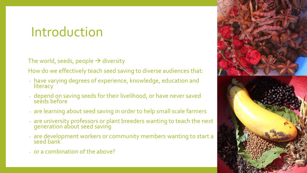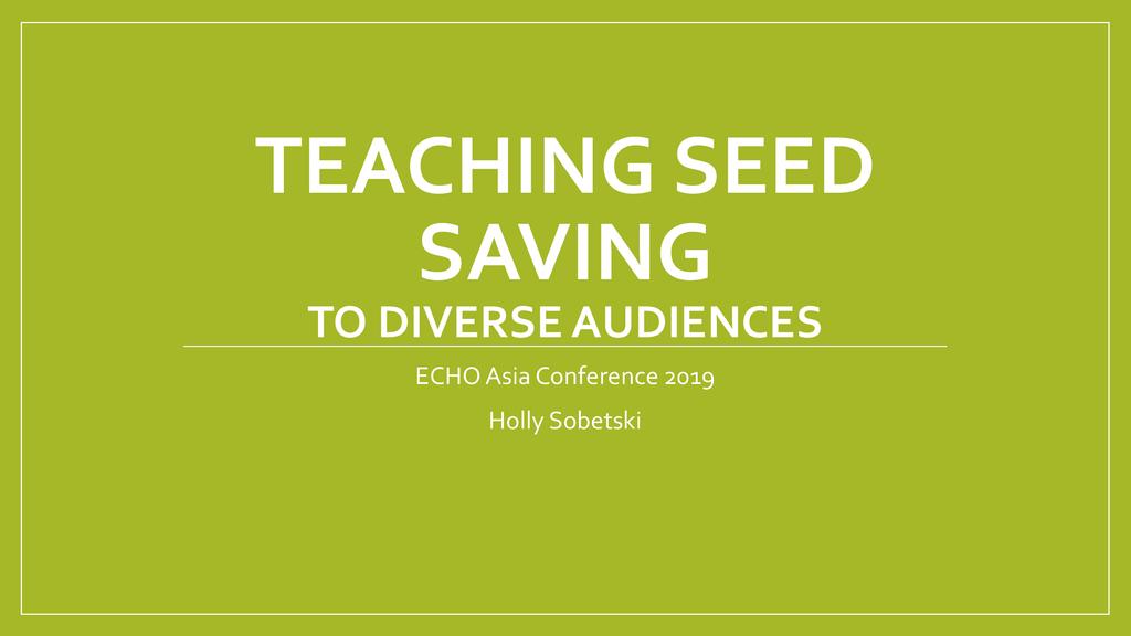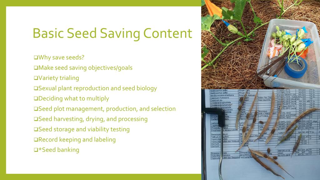 How do you teach and equip an audience of rural farmers, development workers, or seasoned professors, or all three audiences at the same time about saving seeds?  Come learn and share tips and tools in training diverse audiences about the basics of seed saving and seed banking.