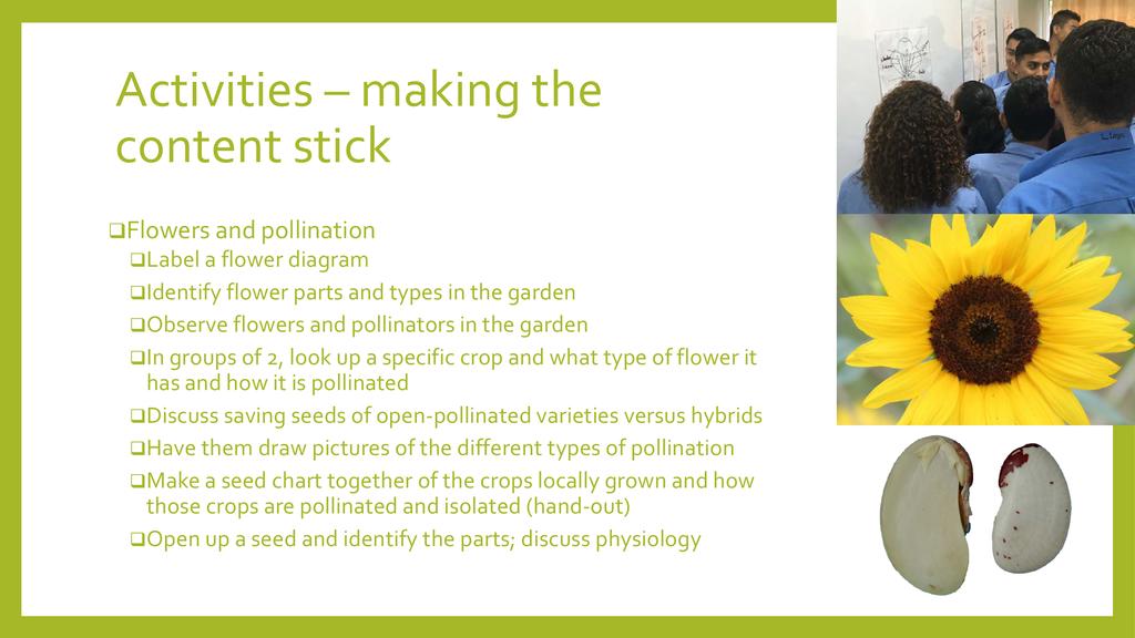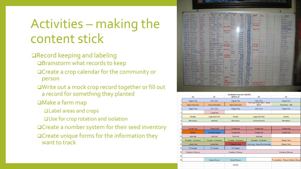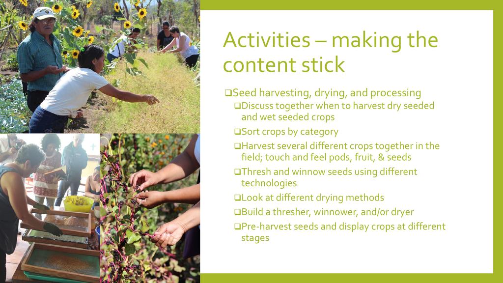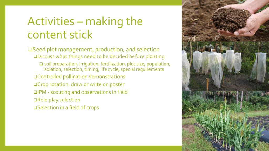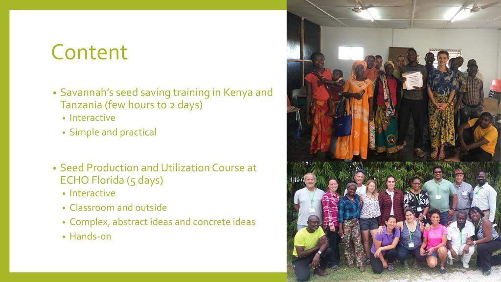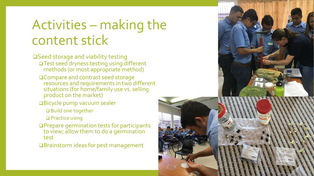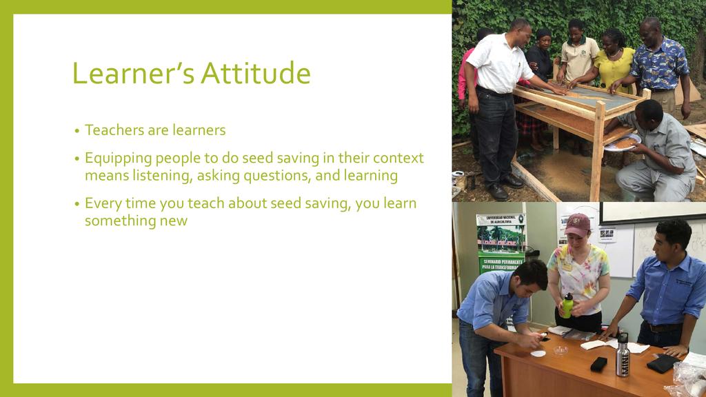 How do you teach and equip an audience of rural farmers, development workers, or seasoned professors, or all three audiences at the same time about saving seeds?  Come learn and share tips and tools in training diverse audiences about the basics of seed saving and seed banking.