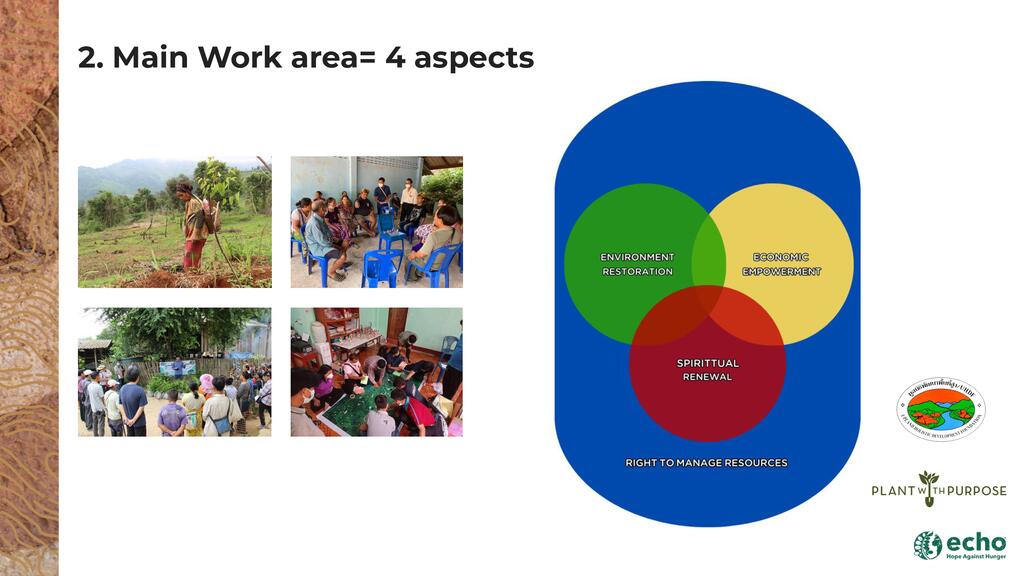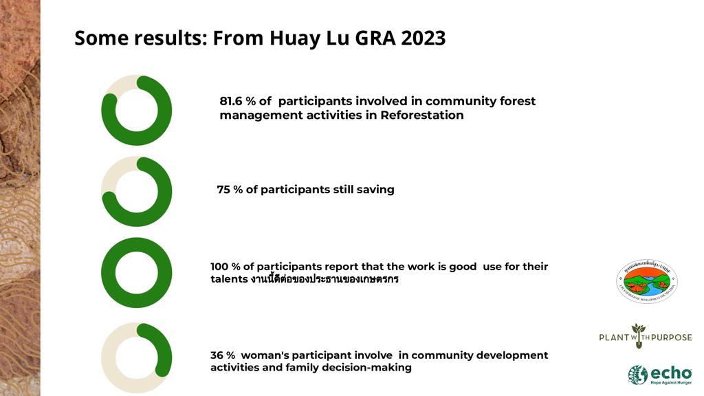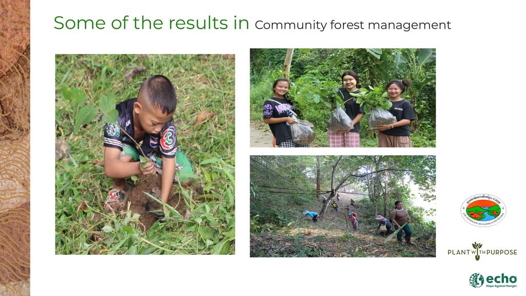 Smallholder farmers across the globe are 'on the frontlines' of environmental, economic, and social challenges in their communities. While they face the most adverse effects, they also play the most pivotal role in driving solutions. We will share Plant With Purpose’s proven strategy for holistic development, refined over the past 35 years. Our strategy involves equipping thousands of farming families in nine countries to reverse deforestation and poverty and catalyze further social change. Our presentation will particularly focus on Thailand and the impact seen throughout the watersheds where we work.
