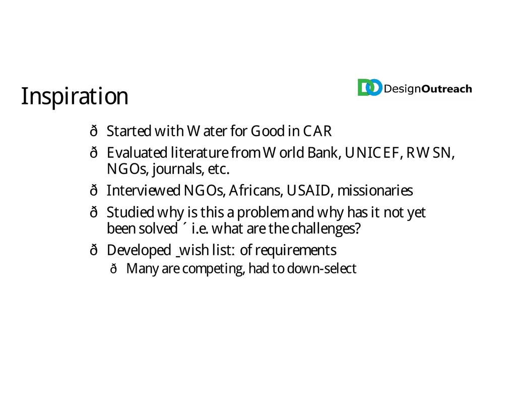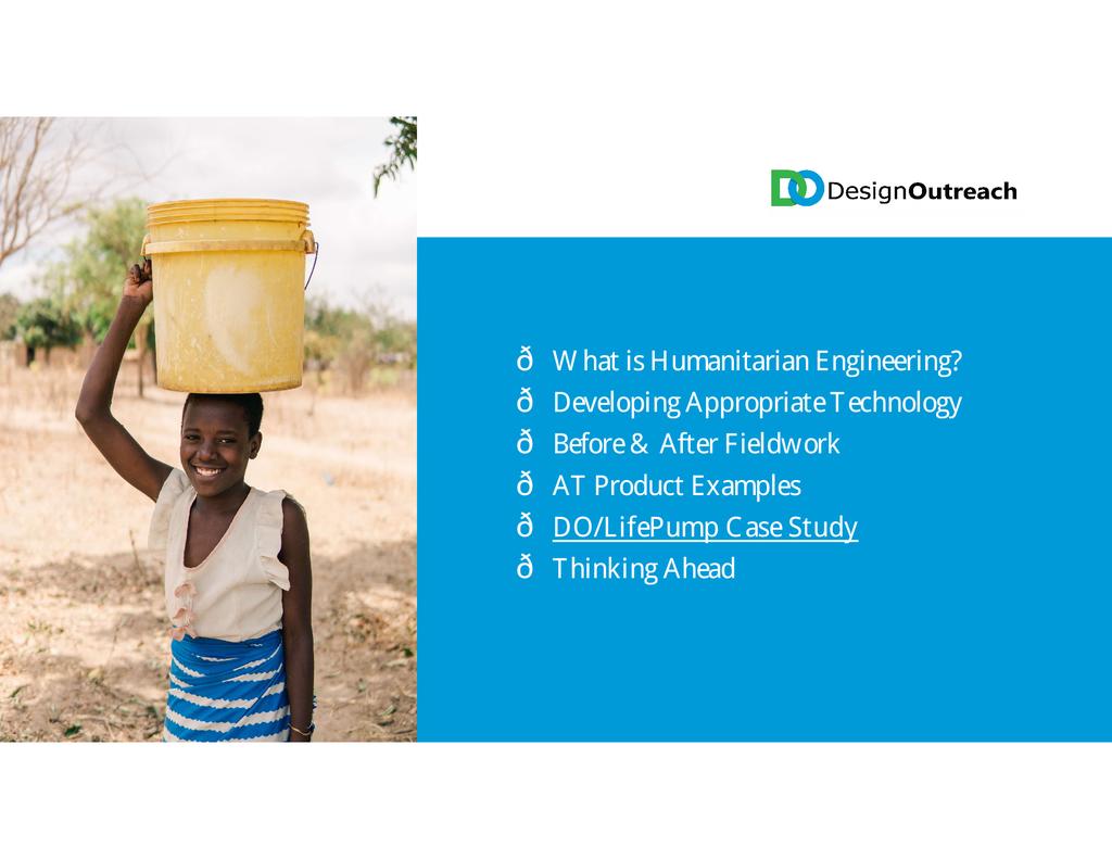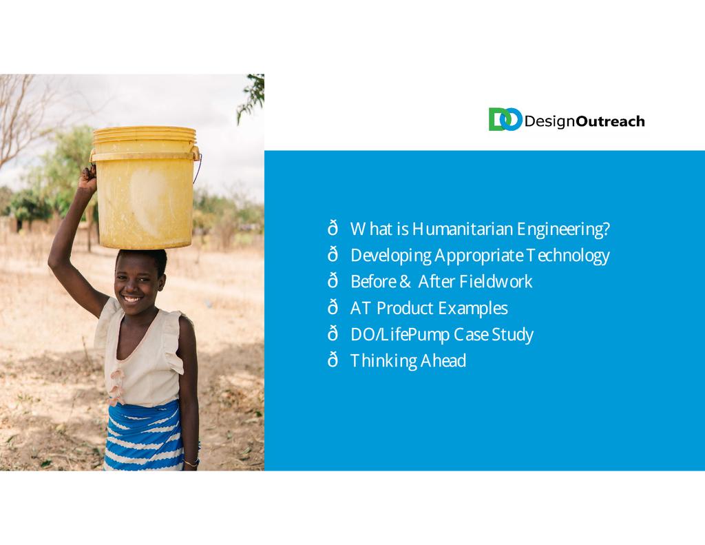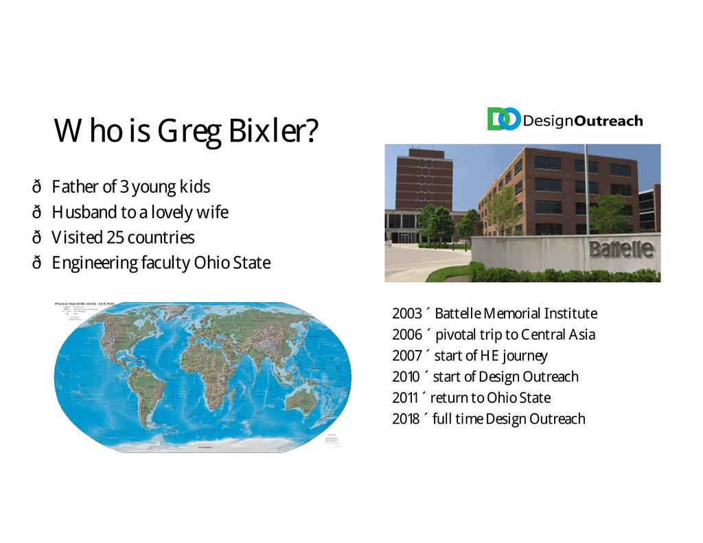 Presenter : Greg Bixler, Ph.D., P.E., is the CEO and co-founder of Design Outreach (DO). He also teaches an engineering course at The Ohio State University on appropriate technology for developing countries. Dr. Bixler came up with the idea for DO in 2007 after seeing extreme poverty up close and personal in Central Asia and realizing that he could help alleviate suffering using his engineering talents. In 2010, he co-founded Design Outreach. His endeavors have led him to 23 countries—all while serving as CEO of DO, resident director for the OSU servicelearning program, and advisor for the OSU student chapter of Engineers Without Borders.