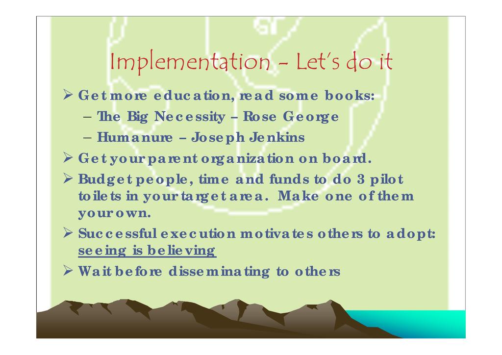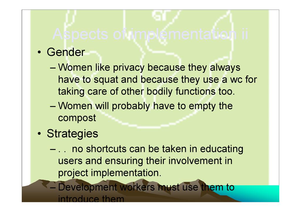 There are many appropriate building technologies available. How environmentally friendly are they? Earthquake resistant? Typhoon resistant? How can we introduce new materials to a traditional construction culture? Why would we want to produce our own materials? How can we make production accessible to women? In what cases does it make sense to use a new technology? We’ll consider interlocking compressed earth blocks, micro concrete roofing tiles, rice husk ash cement, bamboo, and more.