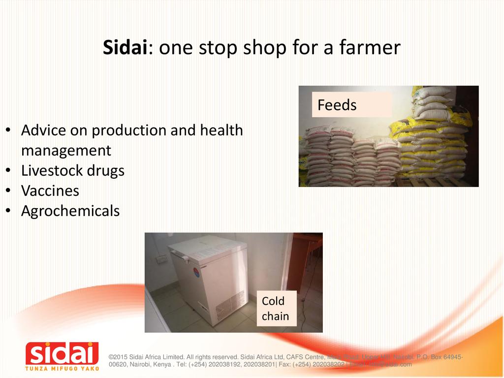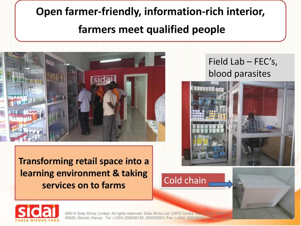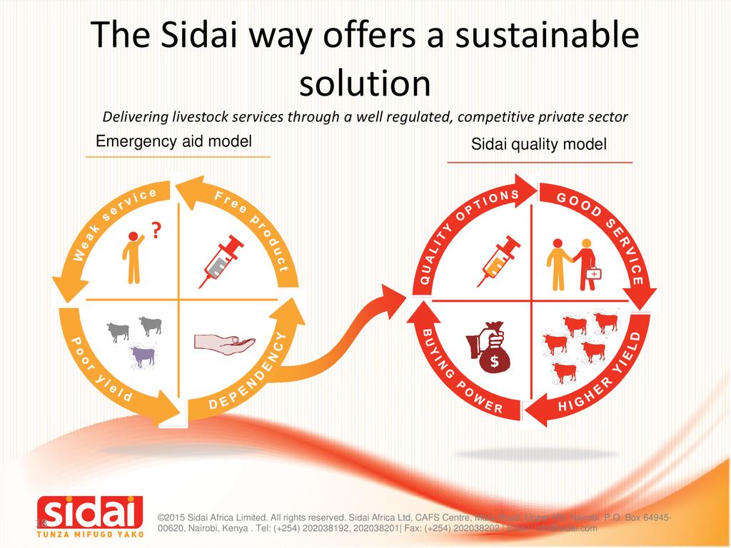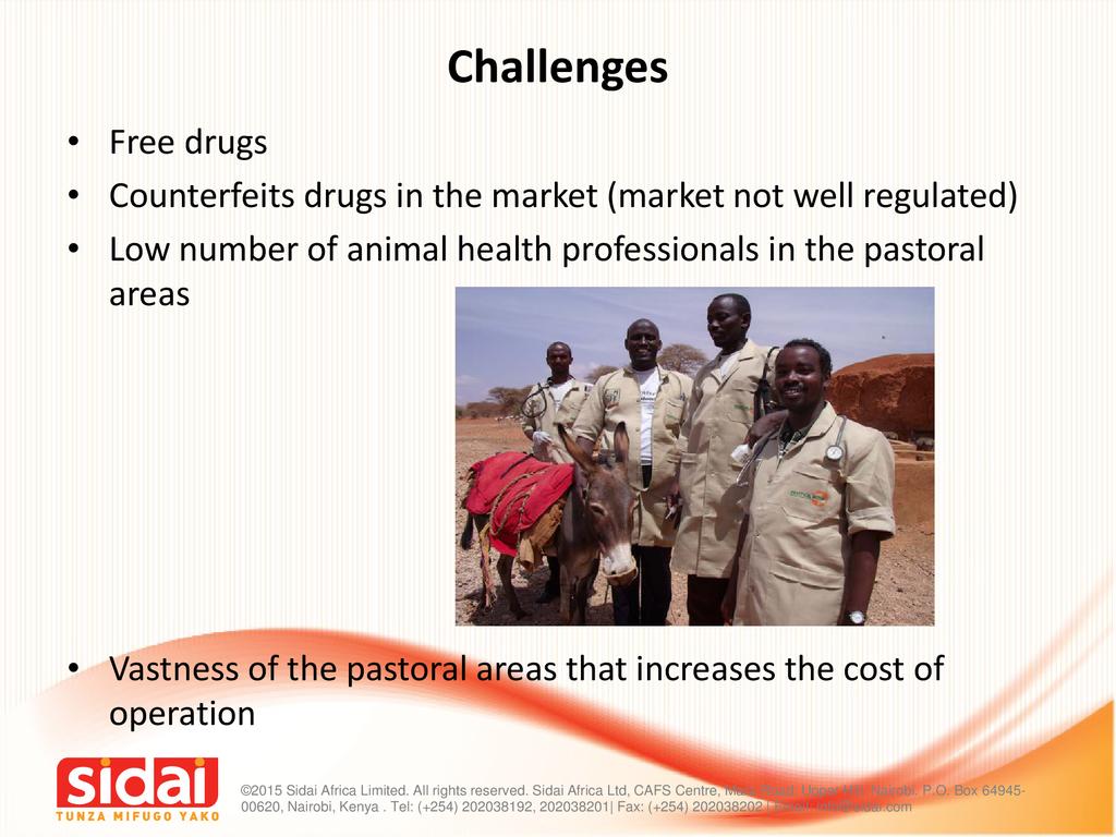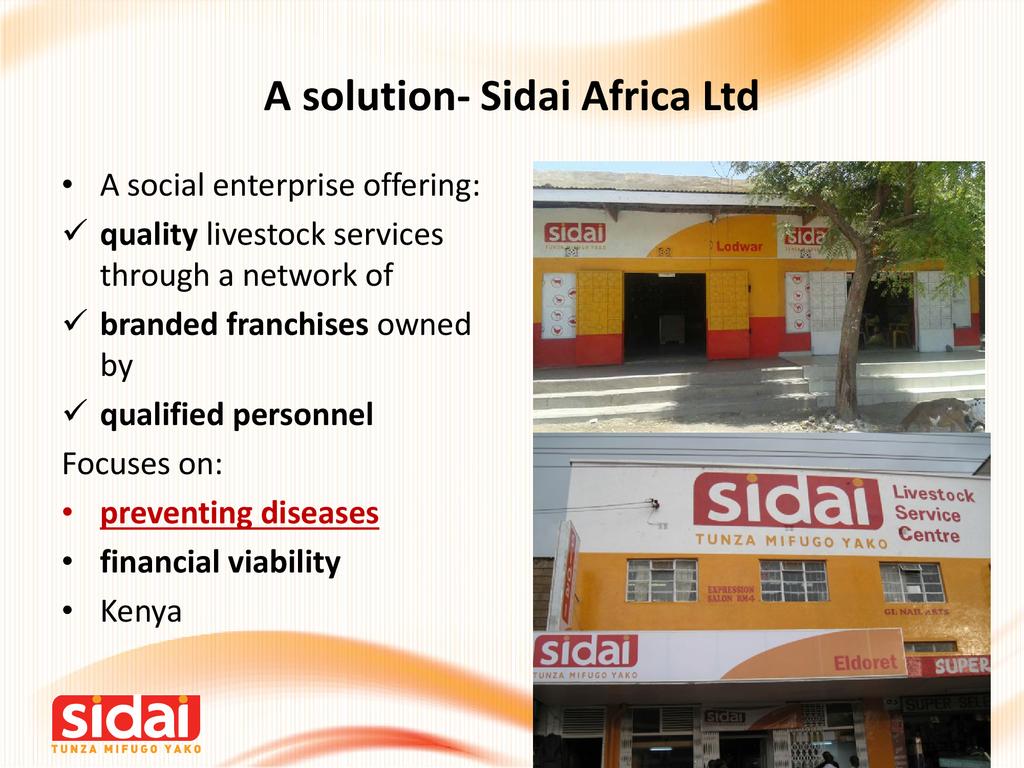 Session: The pastoral areas of Kenya are characterised by poor access to quality livestock services. Consequently the pastoralists are forced to purchase sub-standard and/or counterfeit veterinary drugs - often from unqualified people - to meet their animal health needs. They also treat their livestock by themselves due to the shortage of animal health professionals in the area. These factors lead to poor animal health management resulting in substantial livestock losses and expose the consumers to public health risks. It is in response to these gaps that Sidai, a social enterprise, was started in 2011. The company has set up a national network of over 100 branded franchised Livestock Service Centres across Kenya with the aim of delivering quality products and services to livestock keepers through a sustainable business model. A total of 48 such centres are providing livestock services in the pastoral areas of Kenya.