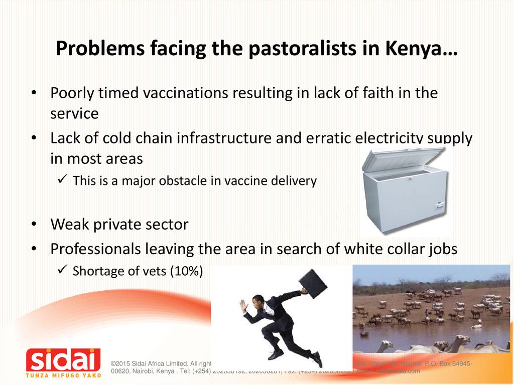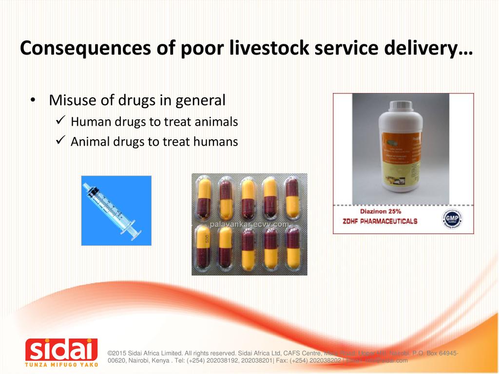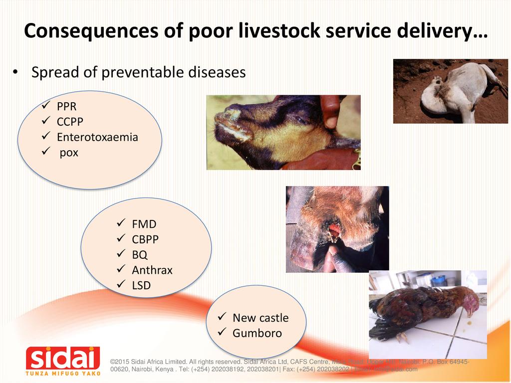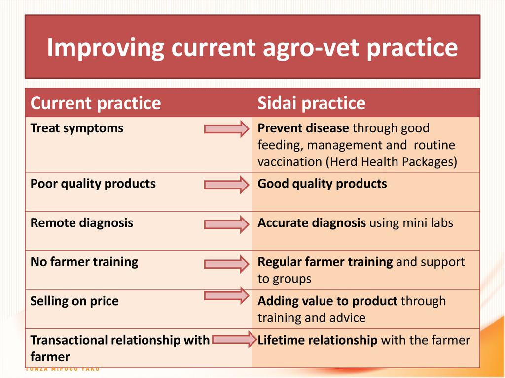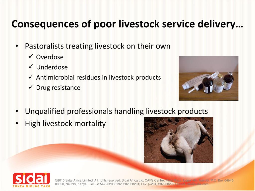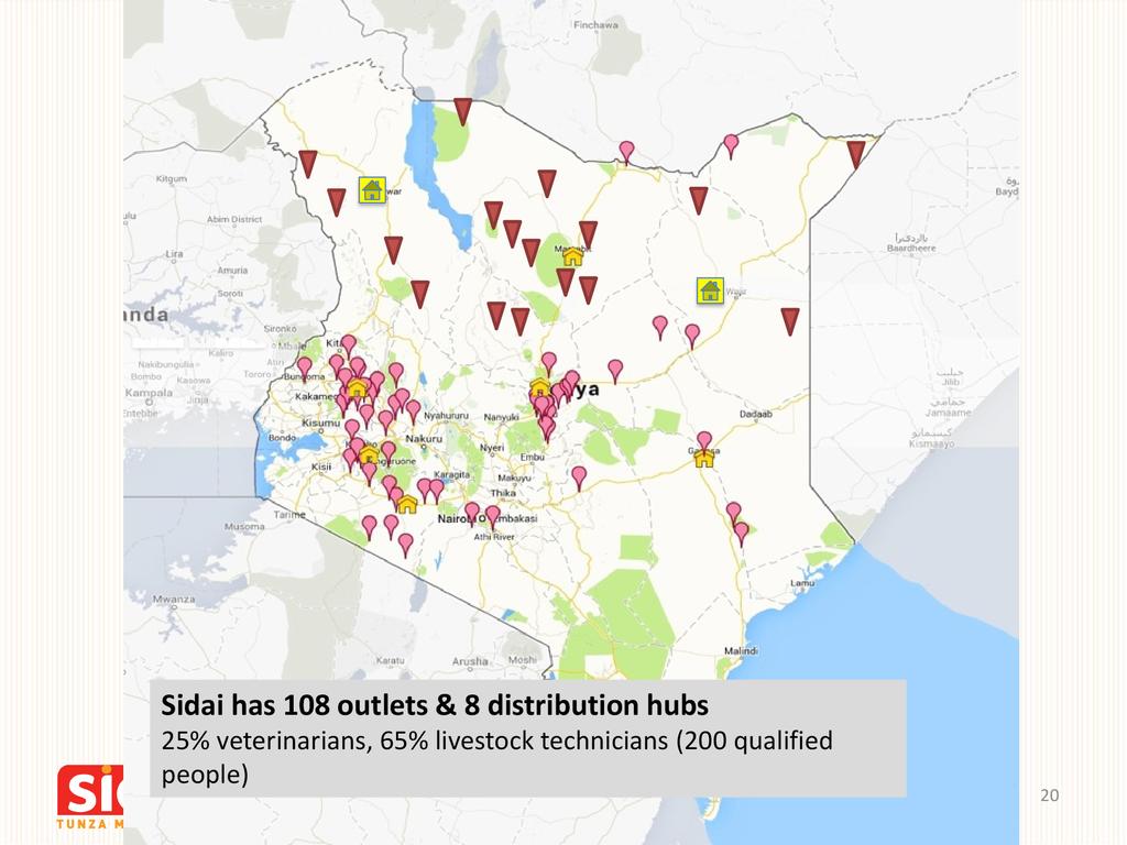 Session: The pastoral areas of Kenya are characterised by poor access to quality livestock services. Consequently the pastoralists are forced to purchase sub-standard and/or counterfeit veterinary drugs - often from unqualified people - to meet their animal health needs. They also treat their livestock by themselves due to the shortage of animal health professionals in the area. These factors lead to poor animal health management resulting in substantial livestock losses and expose the consumers to public health risks. It is in response to these gaps that Sidai, a social enterprise, was started in 2011. The company has set up a national network of over 100 branded franchised Livestock Service Centres across Kenya with the aim of delivering quality products and services to livestock keepers through a sustainable business model. A total of 48 such centres are providing livestock services in the pastoral areas of Kenya.