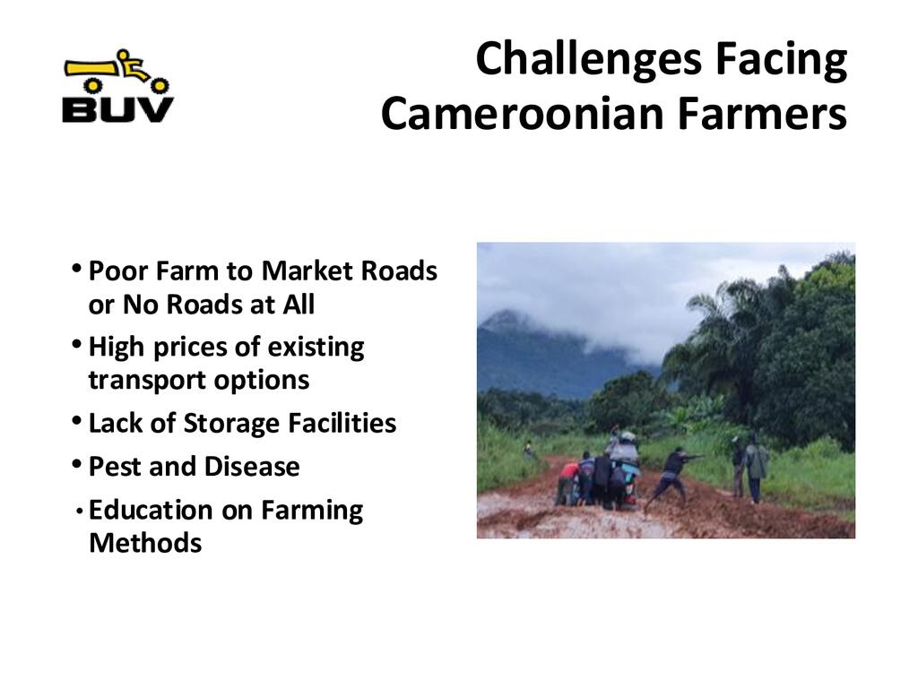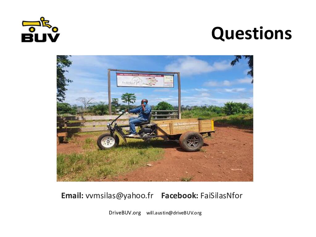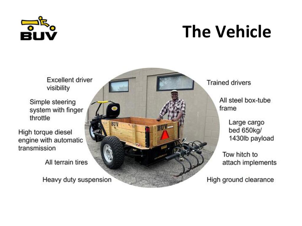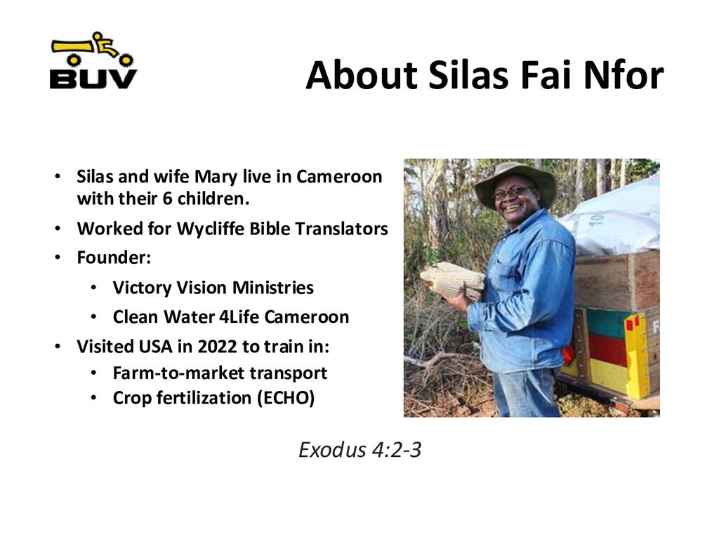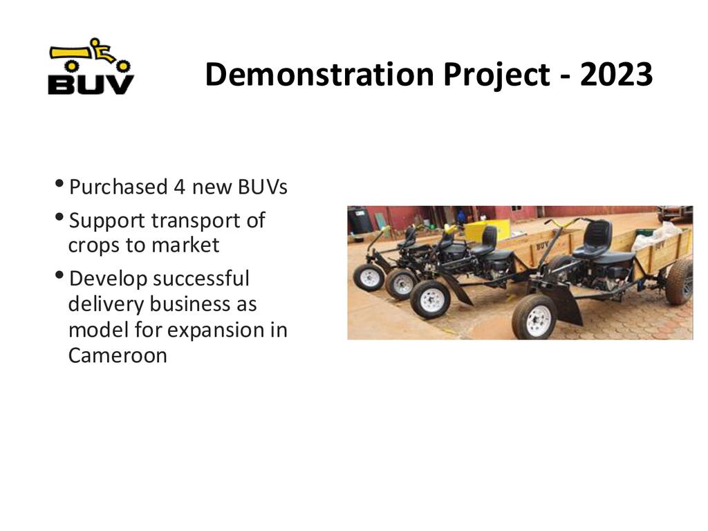 Basic Utility Vehicle (BUV). Reflections and learnings from the field. The speaker is from Cameroon and has owned and operated BUVs since 2016. He primarily uses them for farm-to-market transport and as a platform to share the Gospel. He intends to make many more BUVs available in Cameroon in 2024.