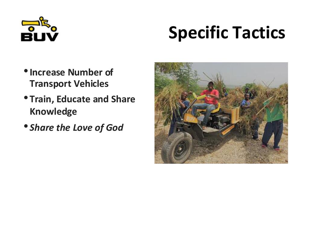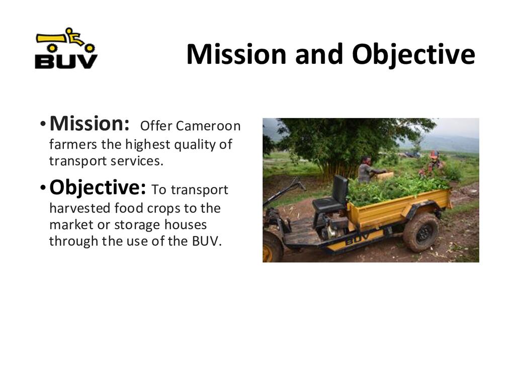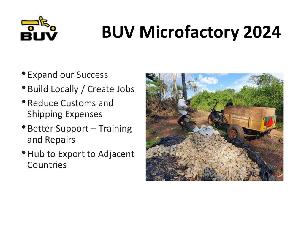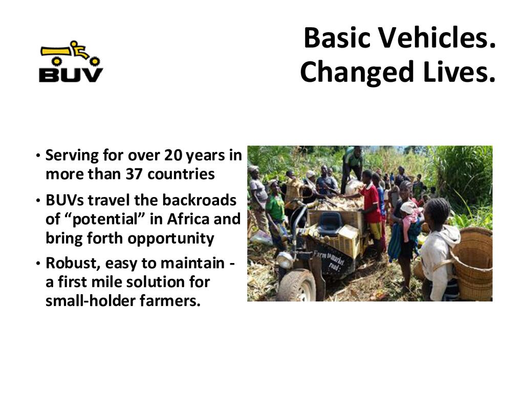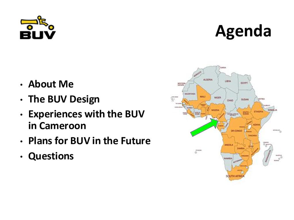 Basic Utility Vehicle (BUV). Reflections and learnings from the field. The speaker is from Cameroon and has owned and operated BUVs since 2016. He primarily uses them for farm-to-market transport and as a platform to share the Gospel. He intends to make many more BUVs available in Cameroon in 2024.