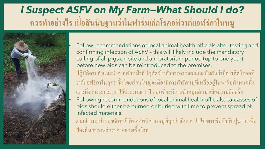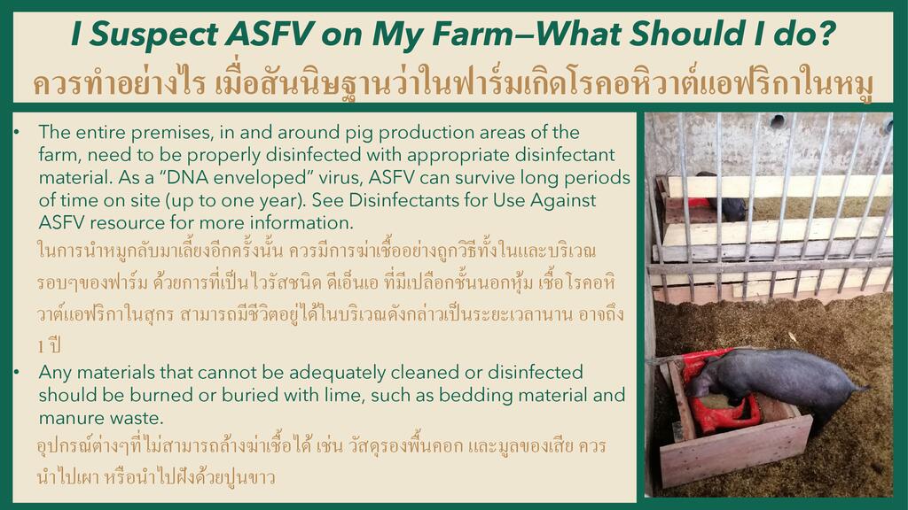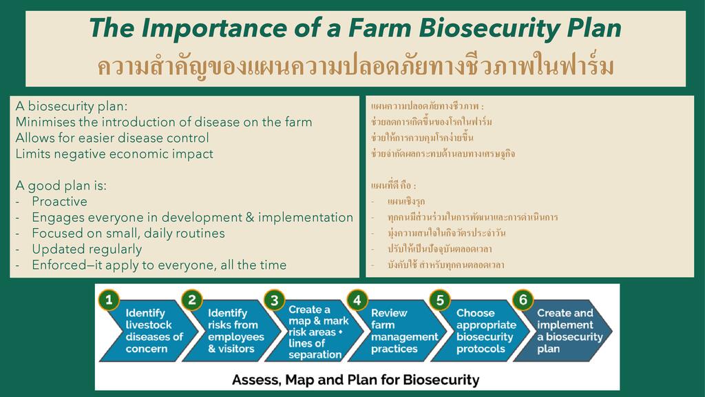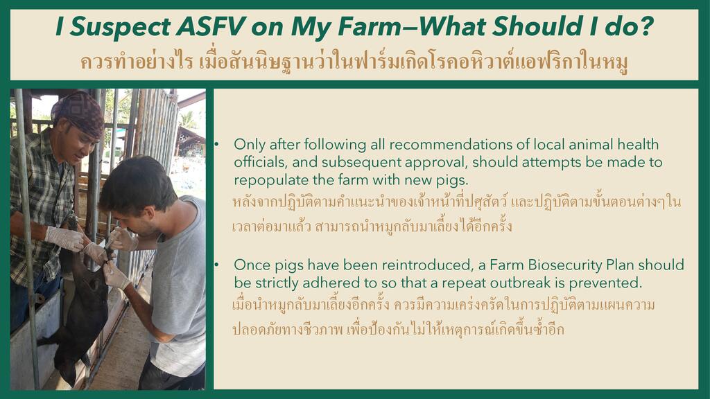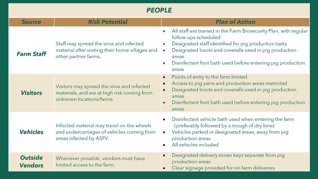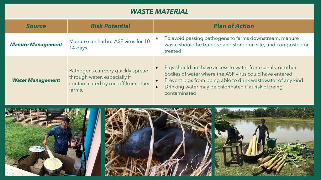 This presentation helps to help prevent the spread of the African Swine Fever Virus and other illnesses that can impact livestock. Good planning and consistent execution of biosecurity measures can help reduce the risk to livelihoods dependent on livestock.