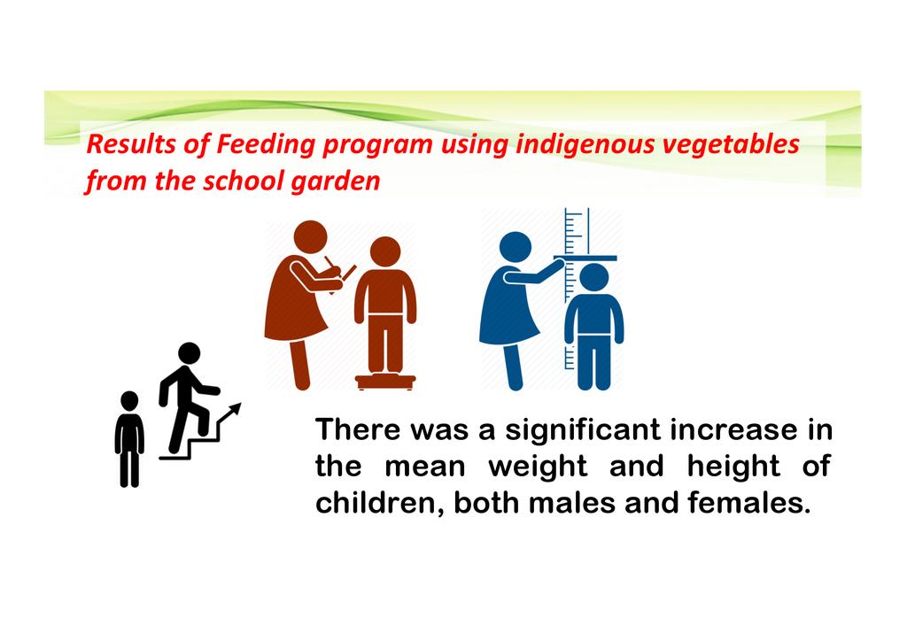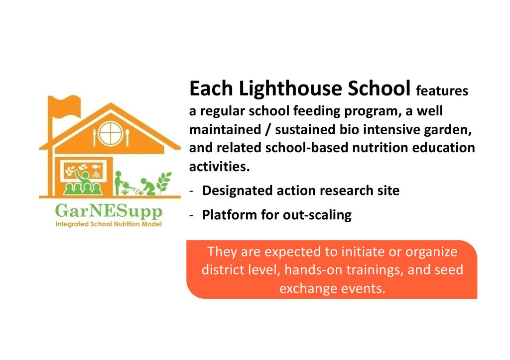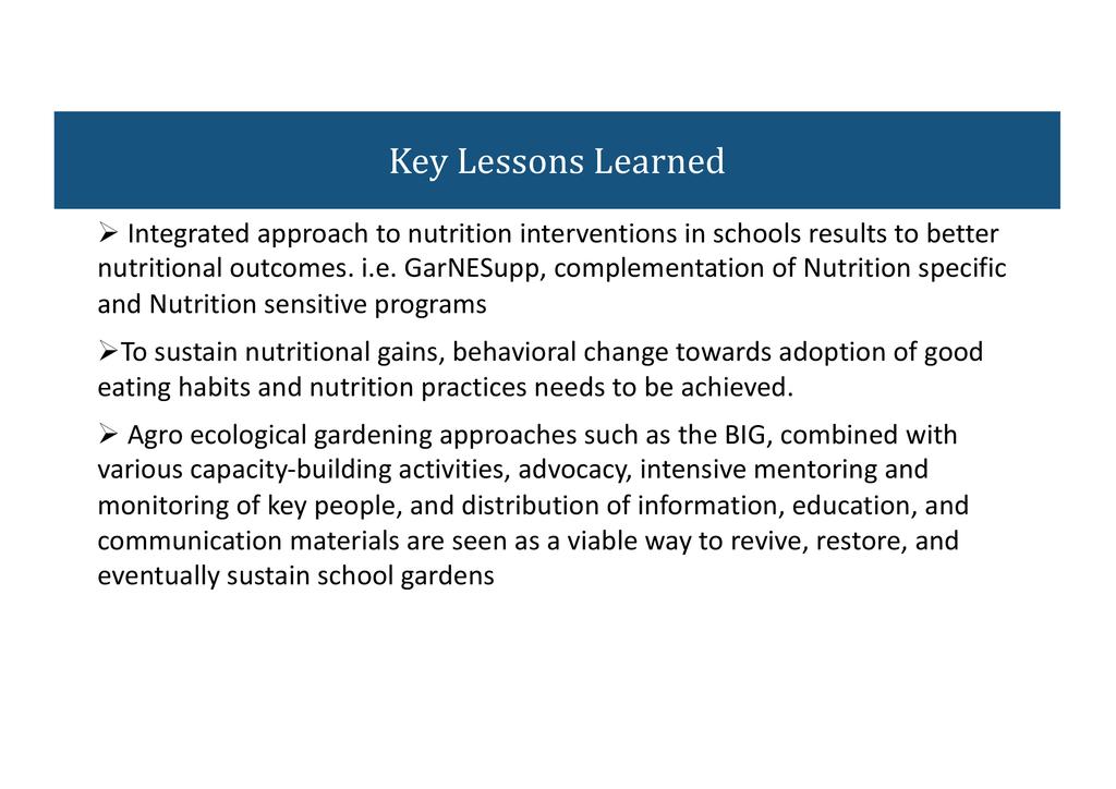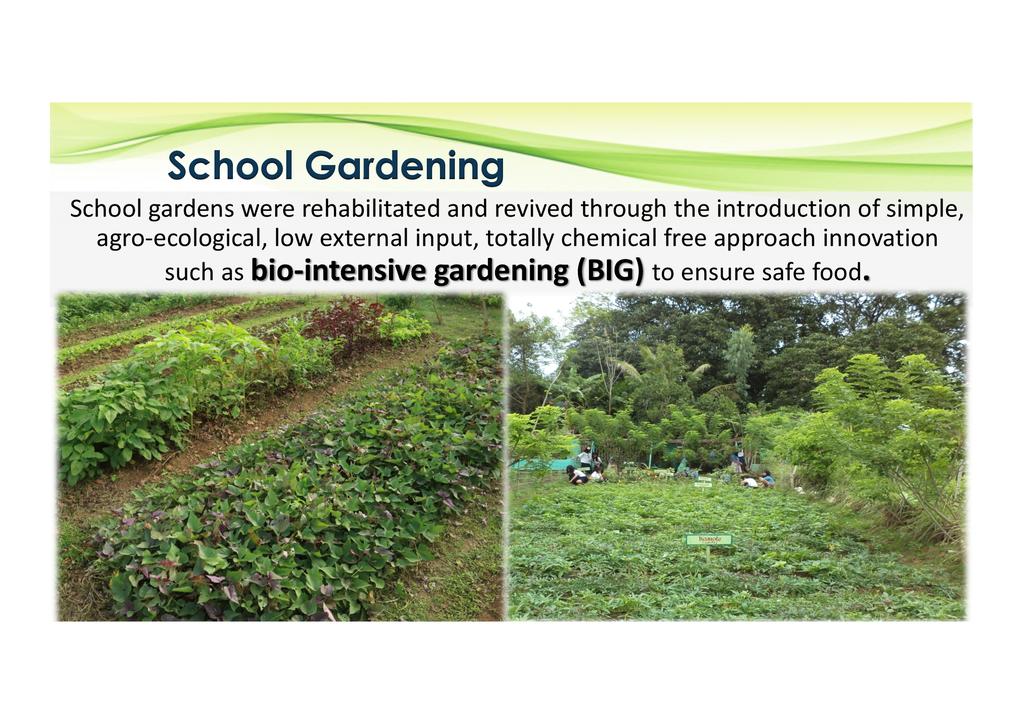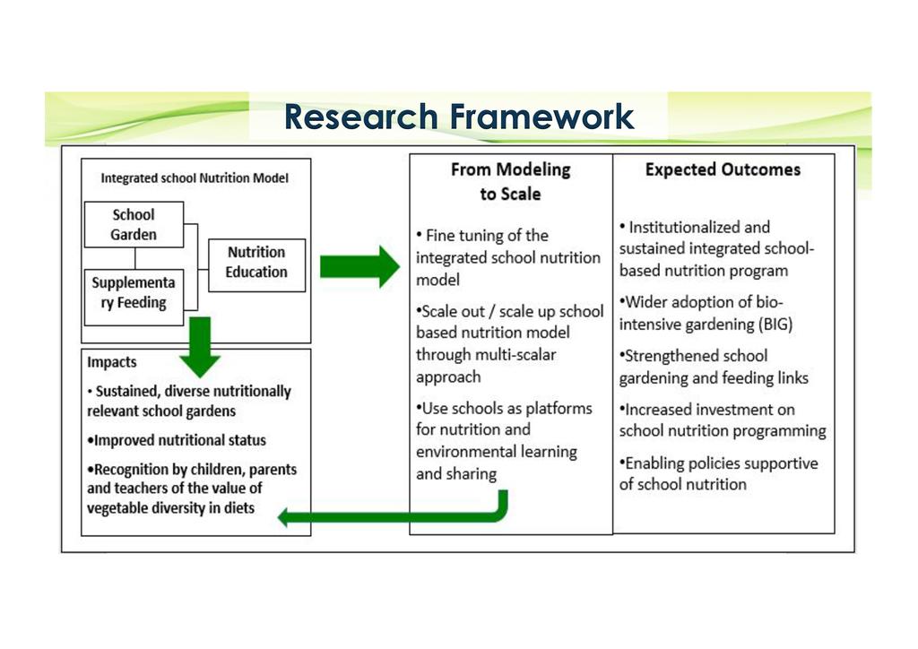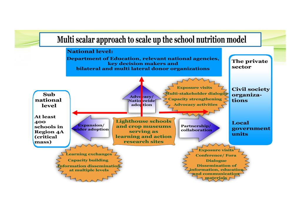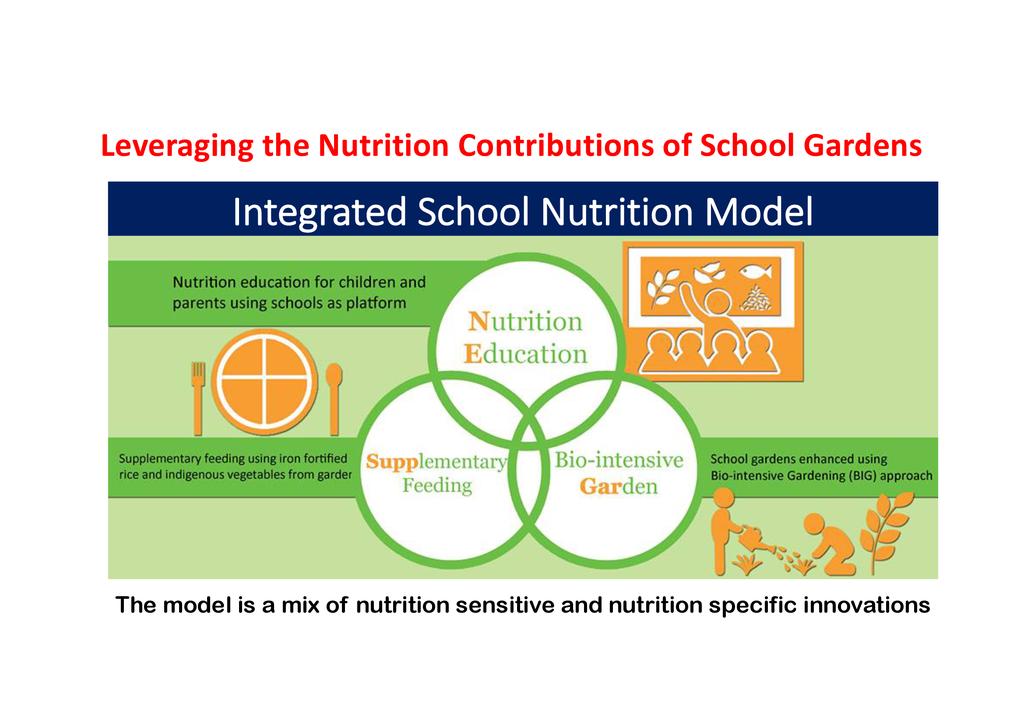 Malnutrition posed a big challenge for development and children are most vulnerable. School children can only maximize their potentials and educational outcomes if their nutrition is given attention. The integrated school nutrition model is an approach that looks at leveraging the nutrition contributions of Bio-intensive school gardens to ensure access and sustainable supply of fresh, nutrient dense, safe and totally chemical free indigenous vegetables which can be used for school feeding programs. Nutrition education of both children and parents, is key to achieve and sustain improved nutrition status of school age children. Scaling the integrated school nutrition model, bringing it to each and every school can generate the needed nutrition and development outcomes.