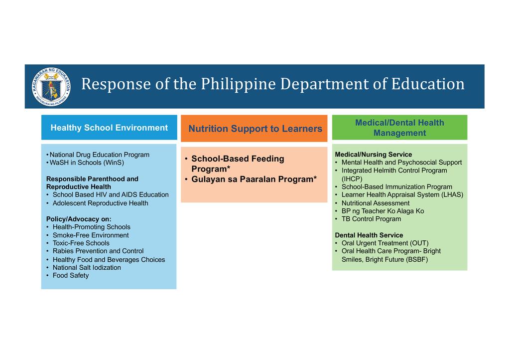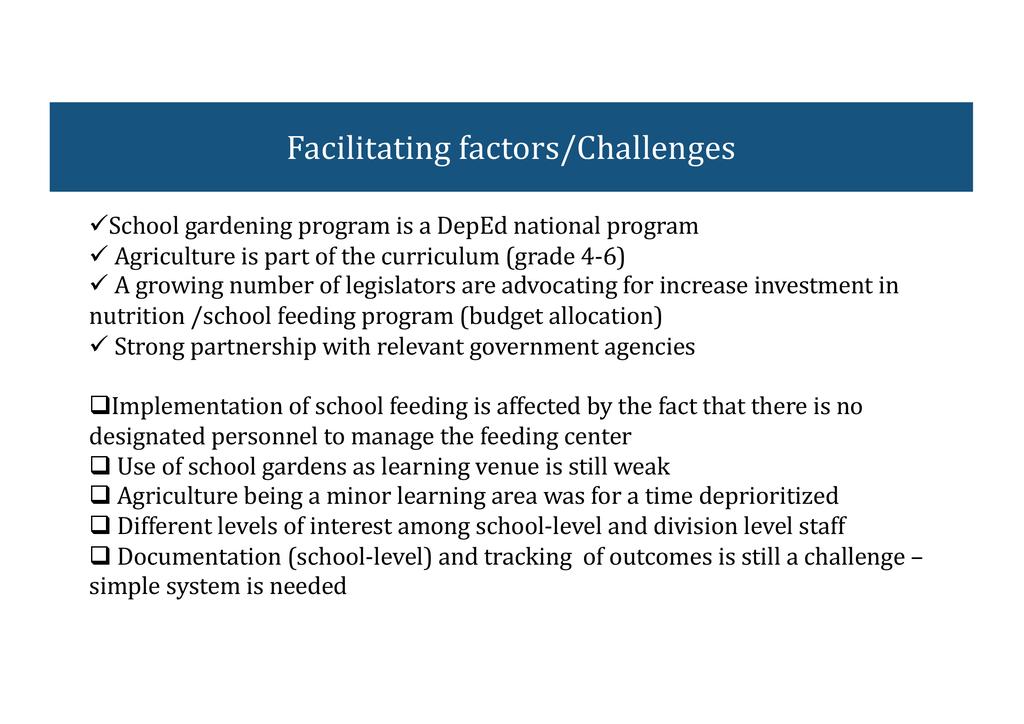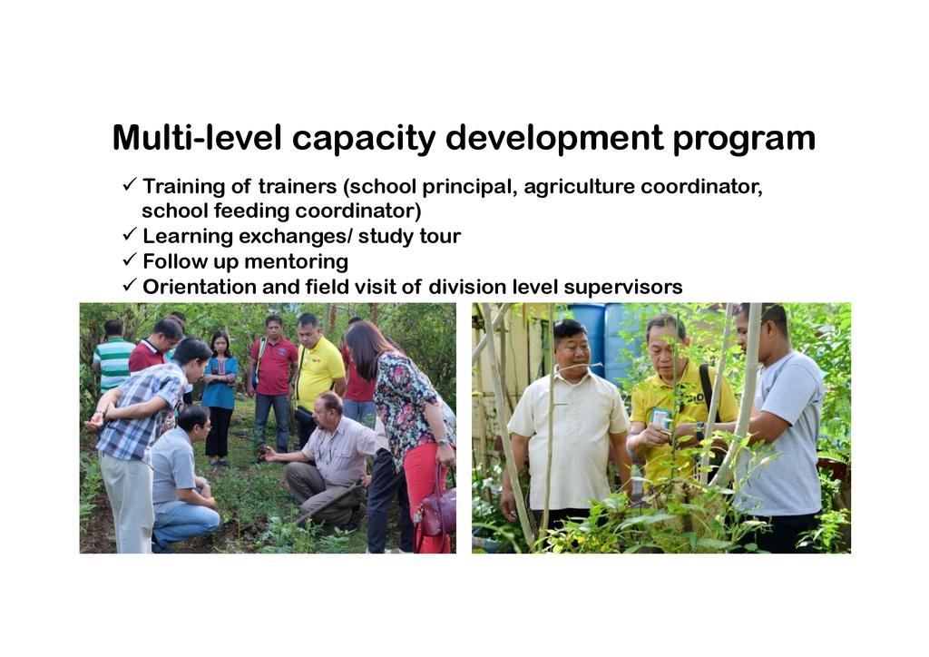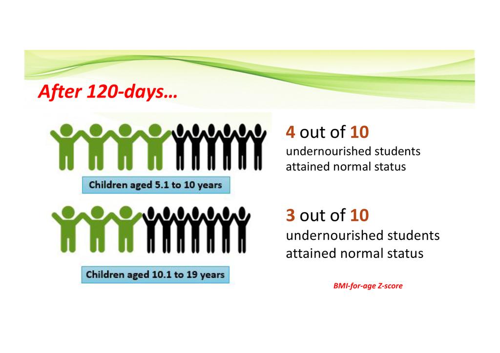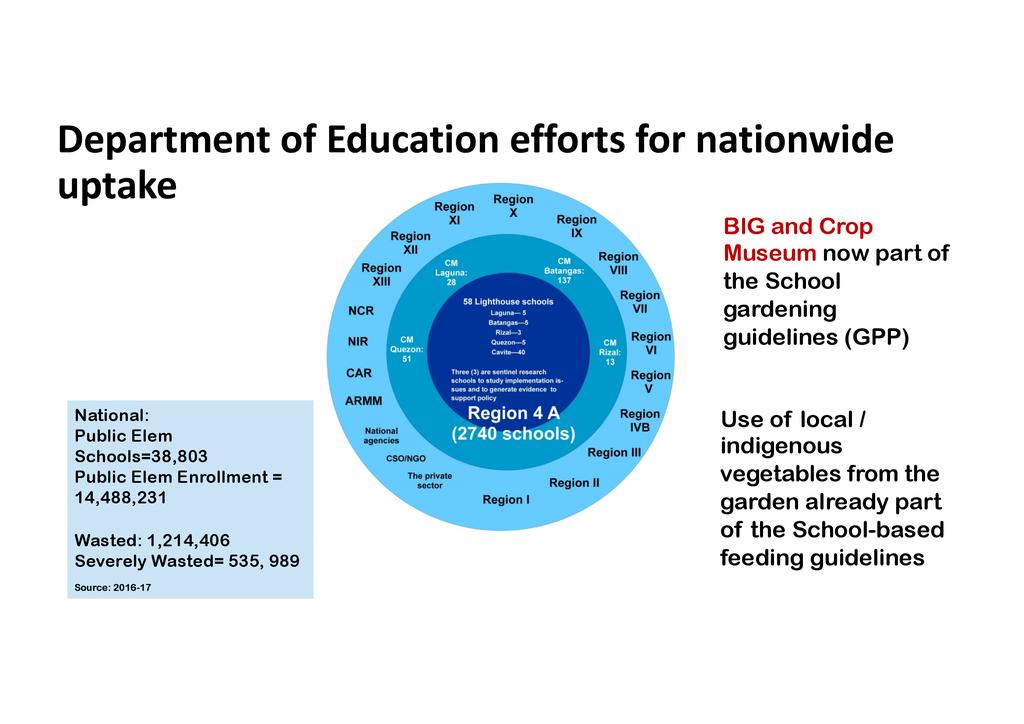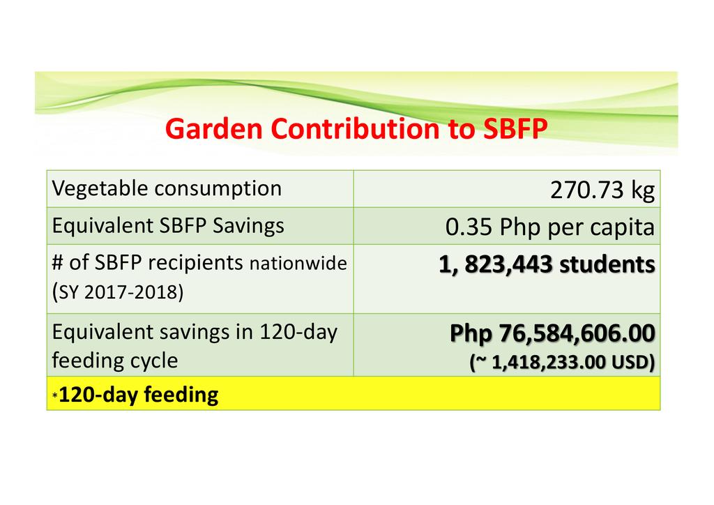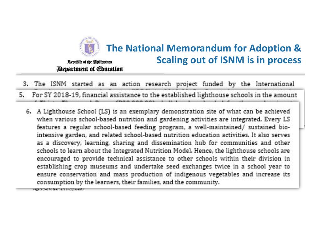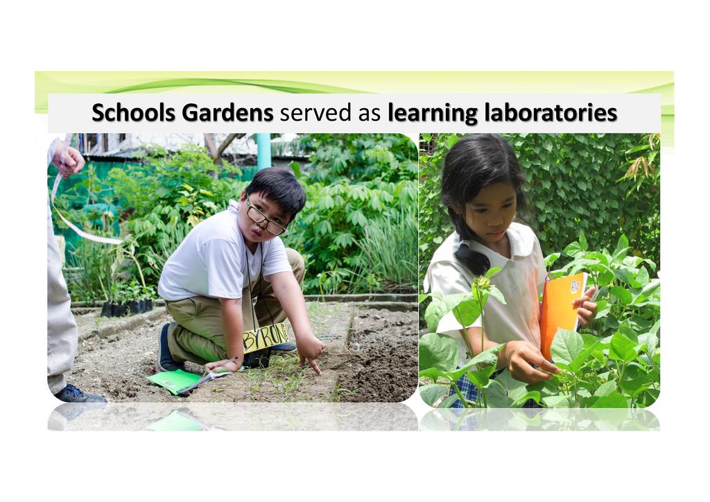 Malnutrition posed a big challenge for development and children are most vulnerable. School children can only maximize their potentials and educational outcomes if their nutrition is given attention. The integrated school nutrition model is an approach that looks at leveraging the nutrition contributions of Bio-intensive school gardens to ensure access and sustainable supply of fresh, nutrient dense, safe and totally chemical free indigenous vegetables which can be used for school feeding programs. Nutrition education of both children and parents, is key to achieve and sustain improved nutrition status of school age children. Scaling the integrated school nutrition model, bringing it to each and every school can generate the needed nutrition and development outcomes.