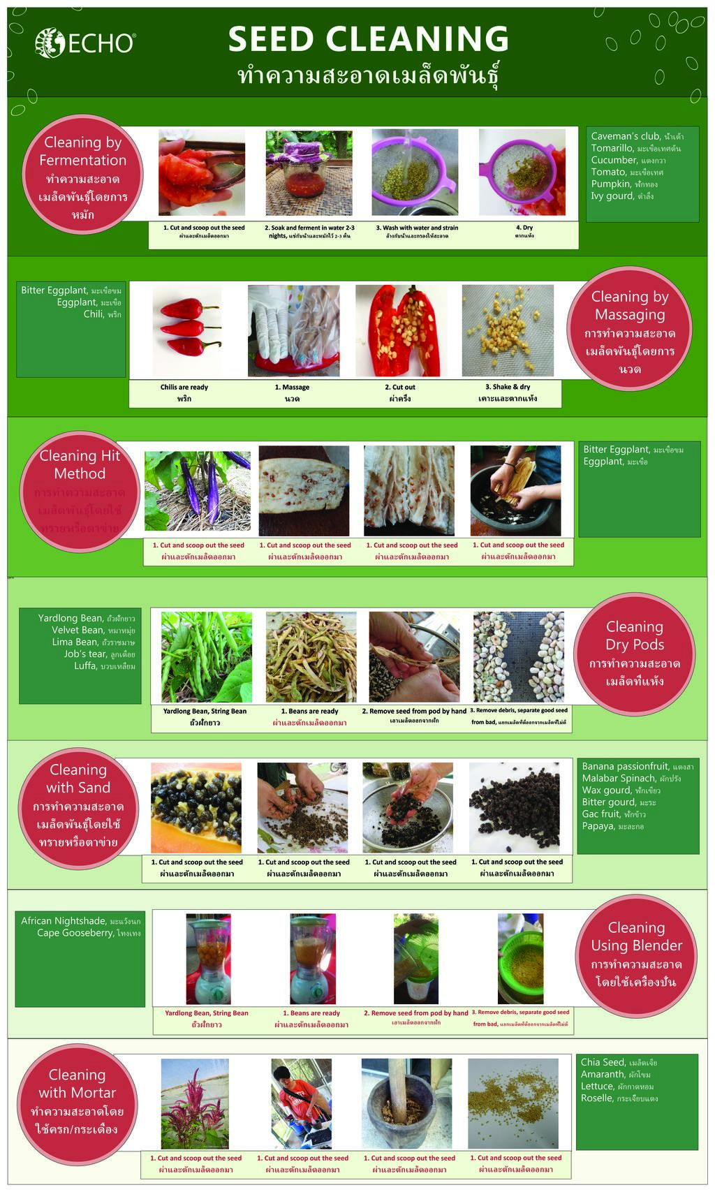 Seed saving is an important pratice for small-scale farmers. Each crop is unique, and therefore each seed needs to be cleaned in a different way. In this workshop, Khun Wah will share her years of experience cleaning and saving seed of underutilized edible crop varieties that are important to SE Asia. She will cover seed cleaning methods such as fermentation, massage, hitting, sand treatment, screen cleaning, blending. Before the ECHO Asia Seedbank developed these techniques, they spent time experimenting to find which technique fit each crop. We invite you to share your experience with seed cleaning as you learn what has been working for us here in Thailand.