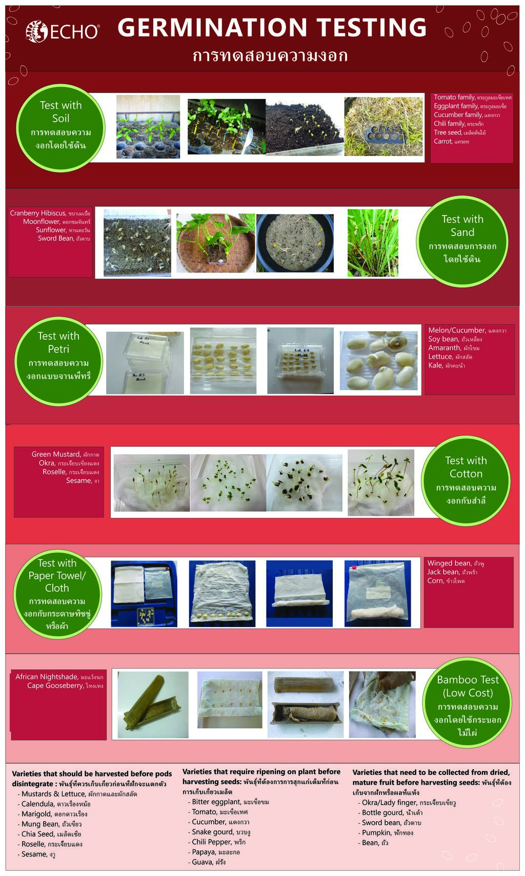 Viable seed is crucial to the success of small-scale farmers. This workshop will teach techniques to evaluate seed viability through germination testing. You will benefit from Khun Paw's years of experience with the ECHO Asia Seedbank. Each seed is unique, and therefore needs a unique method of germination testing. In this workshop, you will learn how to germinate seeds using the petri dish, sand, soil, paper towel, and cotton methods- as well as how to experiment and determine the appropriate germination method for each seed.