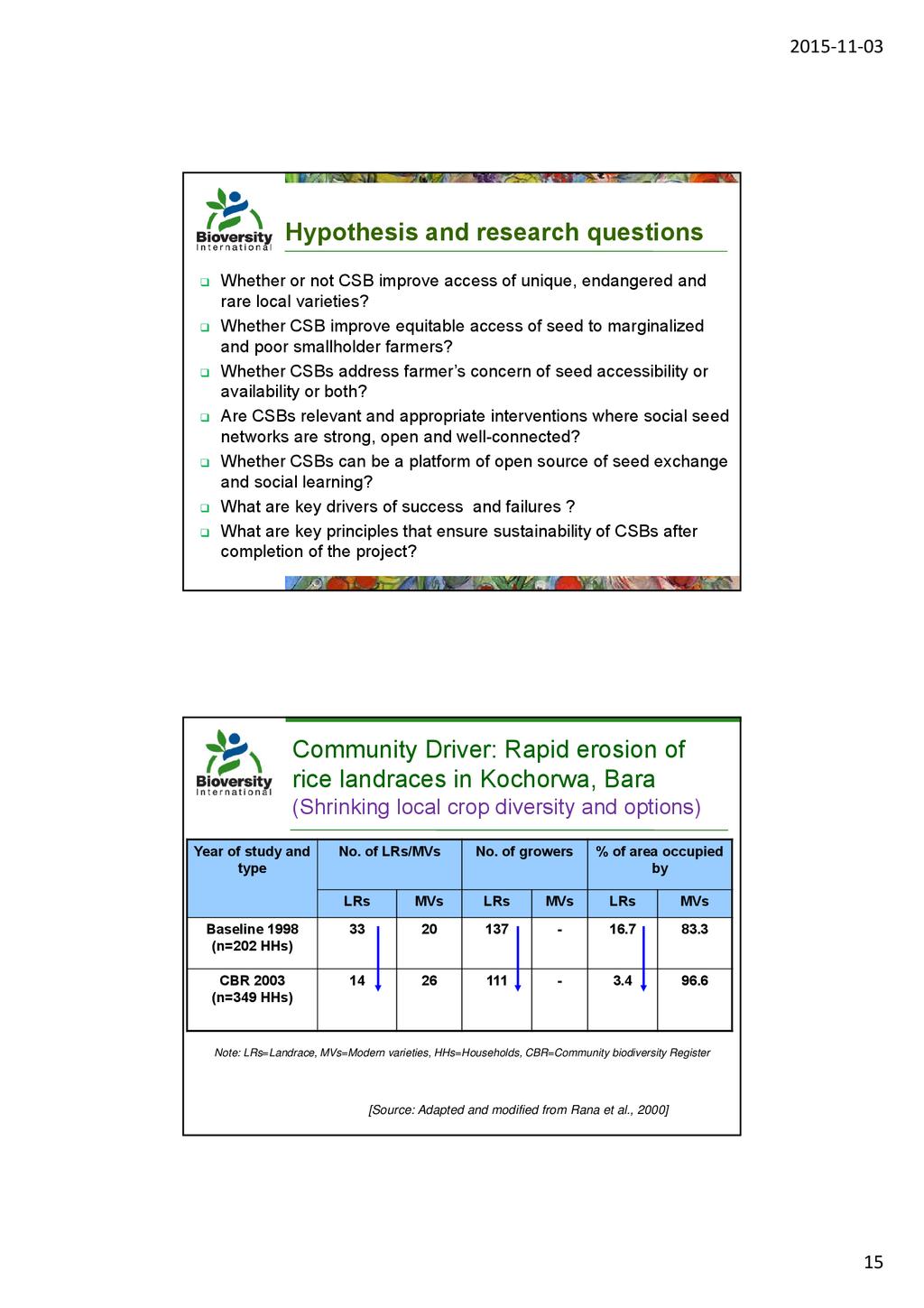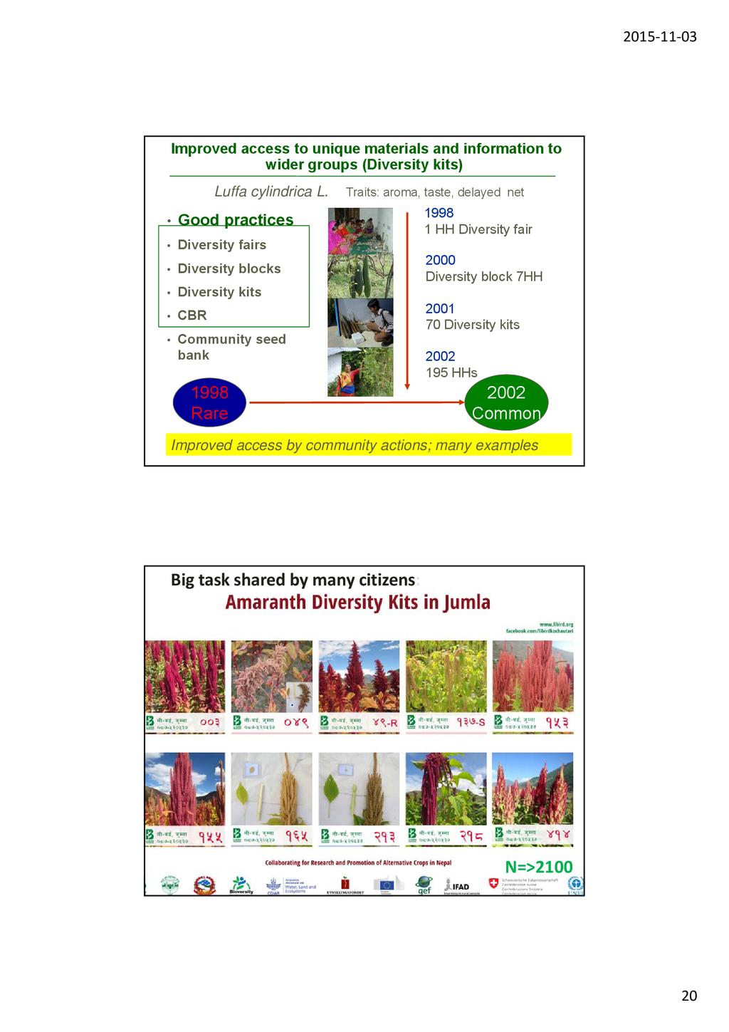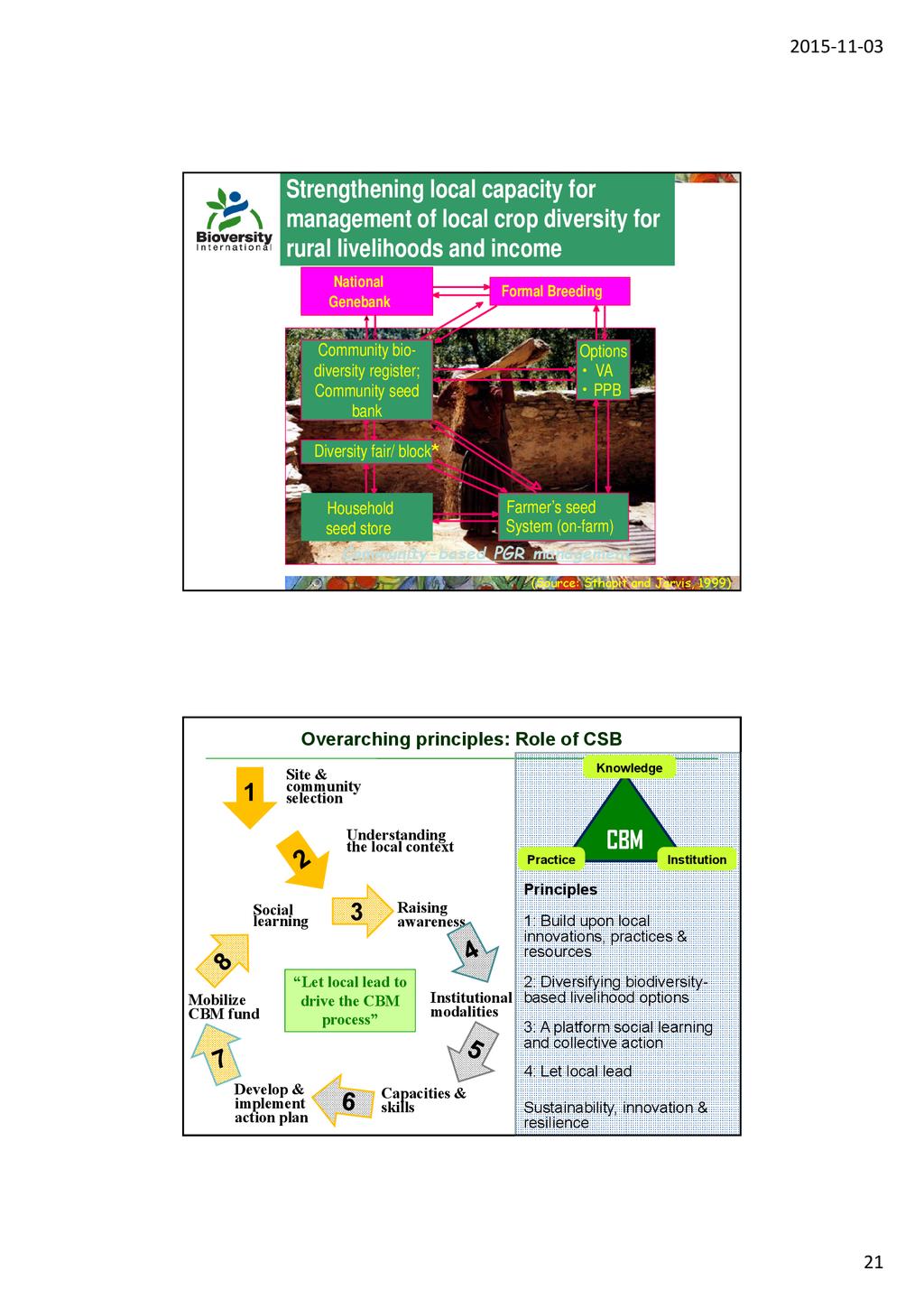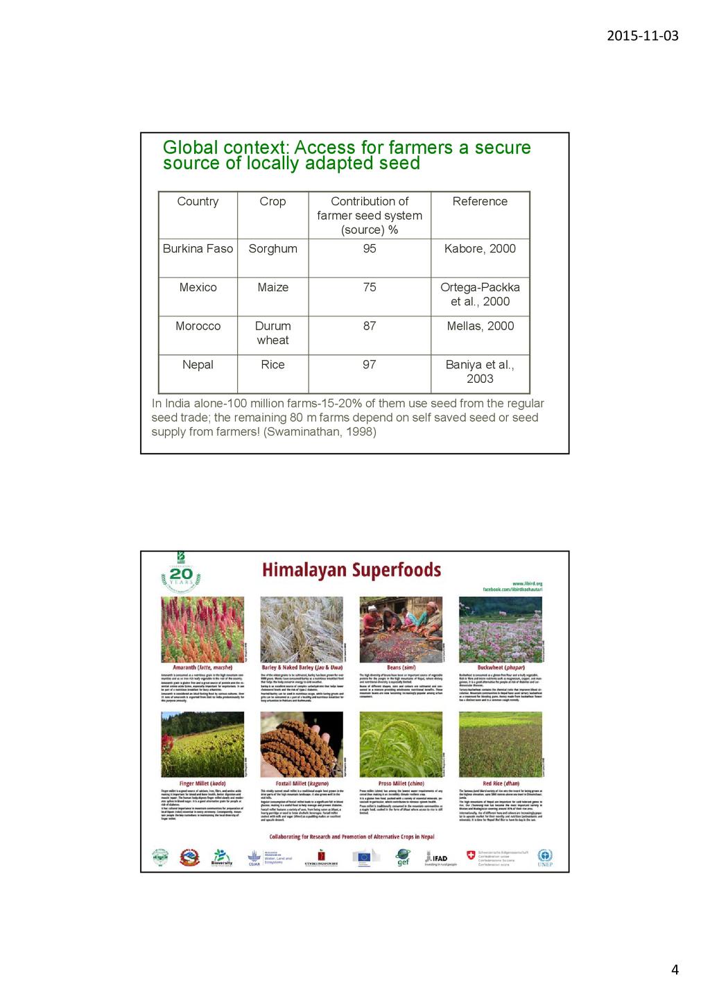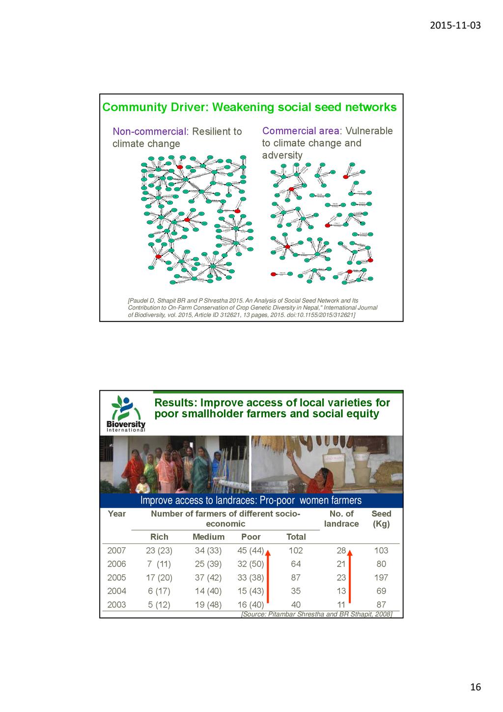 Speaker Bio: Bhuwon Sthapit is the Senior Scientist at Bioversity International. He earned a Ph.D. in Plant Breeding from the University of Wales, UK, and is a pioneer in participatory crop improvement methods. He has over 30 years of experience in implementing biodiversity related projects in Brazil, China, India, Indonesia, Malaysia, Nepal, South Africa, Sri Lanka, Thailand, Vanuatu, and Vietnam. His major research themes include: participatory methods to assess and use agricultural biodiversity, participatory crop improvement, in situ and on-farm conservation, home gardens, community-based biodiversity management, tropical fruits, and community seed banks. Bhuwon is currently coordinating two UNEP GEF Projects on Tropical Fruit Tree Diversity in India, Indonesia, Malaysia, and Thailand, and on GEF Project Integrating Traditional Mountain Crop Genetic Diversity for Food Security and Resilience in Nepal. He is also a founder member of the NGO, Local Initiatives for Biodiversity, Research and Development (LI-BIRD) in Nepal. He has been with Bioversity International since 1997 as in situ conservation specialist and is currently based in the Nepal Of ce as country representative. He has authored/co-authored over 320 publications.