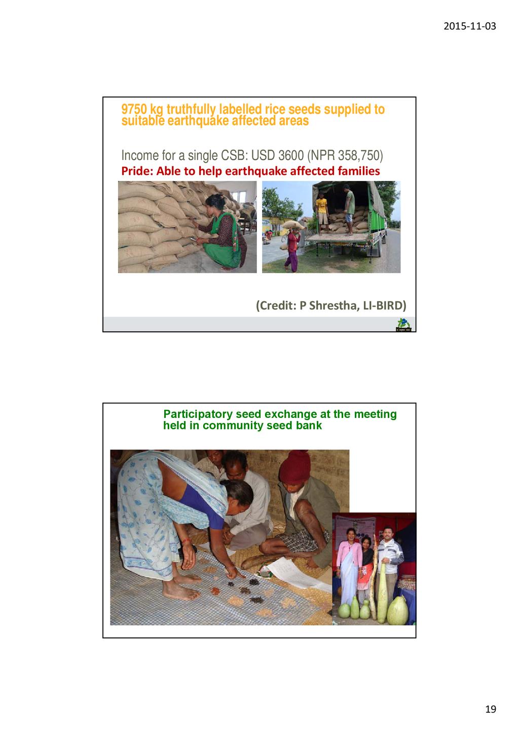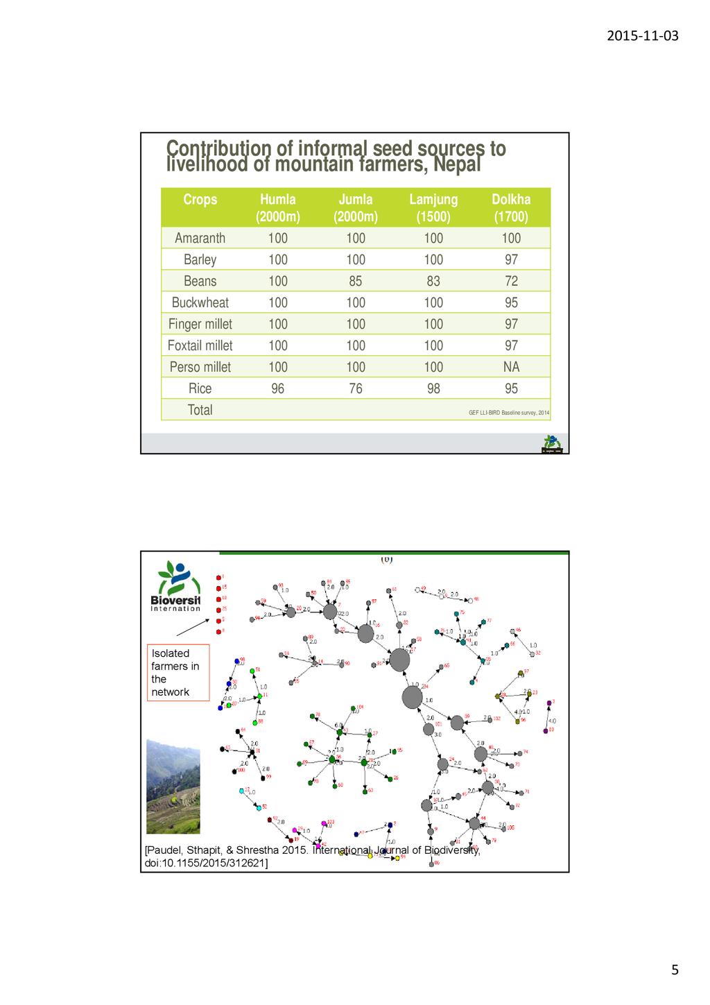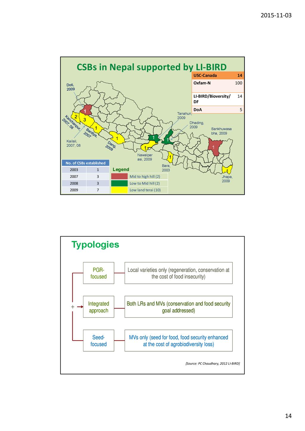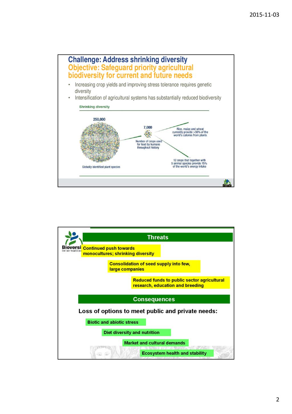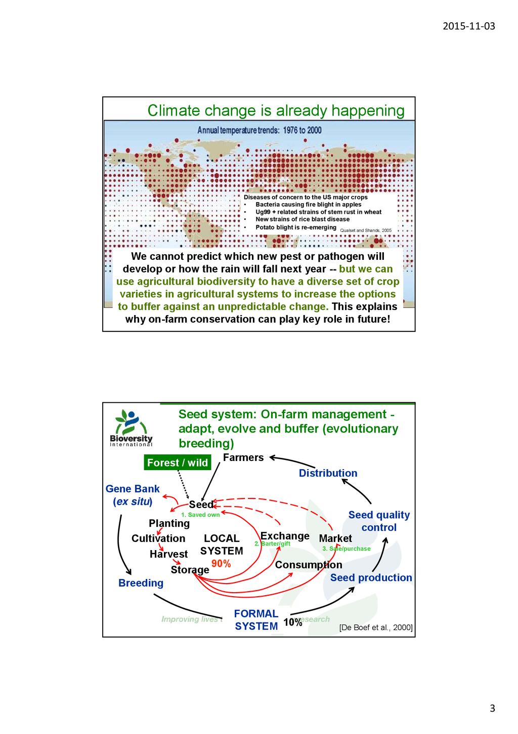 Speaker Bio: Bhuwon Sthapit is the Senior Scientist at Bioversity International. He earned a Ph.D. in Plant Breeding from the University of Wales, UK, and is a pioneer in participatory crop improvement methods. He has over 30 years of experience in implementing biodiversity related projects in Brazil, China, India, Indonesia, Malaysia, Nepal, South Africa, Sri Lanka, Thailand, Vanuatu, and Vietnam. His major research themes include: participatory methods to assess and use agricultural biodiversity, participatory crop improvement, in situ and on-farm conservation, home gardens, community-based biodiversity management, tropical fruits, and community seed banks. Bhuwon is currently coordinating two UNEP GEF Projects on Tropical Fruit Tree Diversity in India, Indonesia, Malaysia, and Thailand, and on GEF Project Integrating Traditional Mountain Crop Genetic Diversity for Food Security and Resilience in Nepal. He is also a founder member of the NGO, Local Initiatives for Biodiversity, Research and Development (LI-BIRD) in Nepal. He has been with Bioversity International since 1997 as in situ conservation specialist and is currently based in the Nepal Of ce as country representative. He has authored/co-authored over 320 publications.