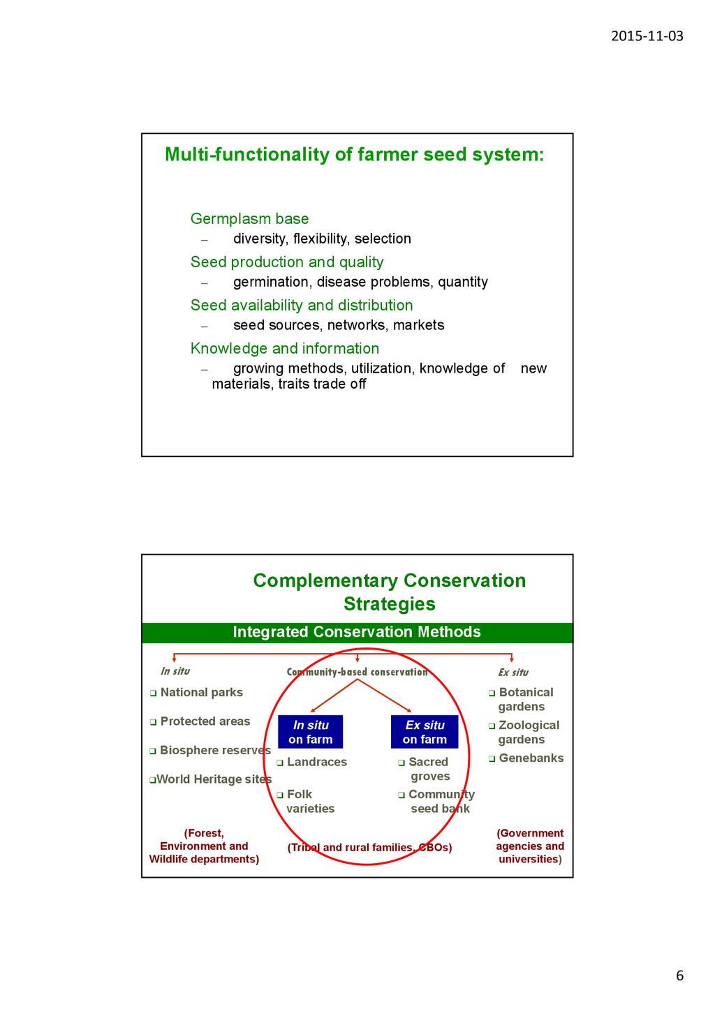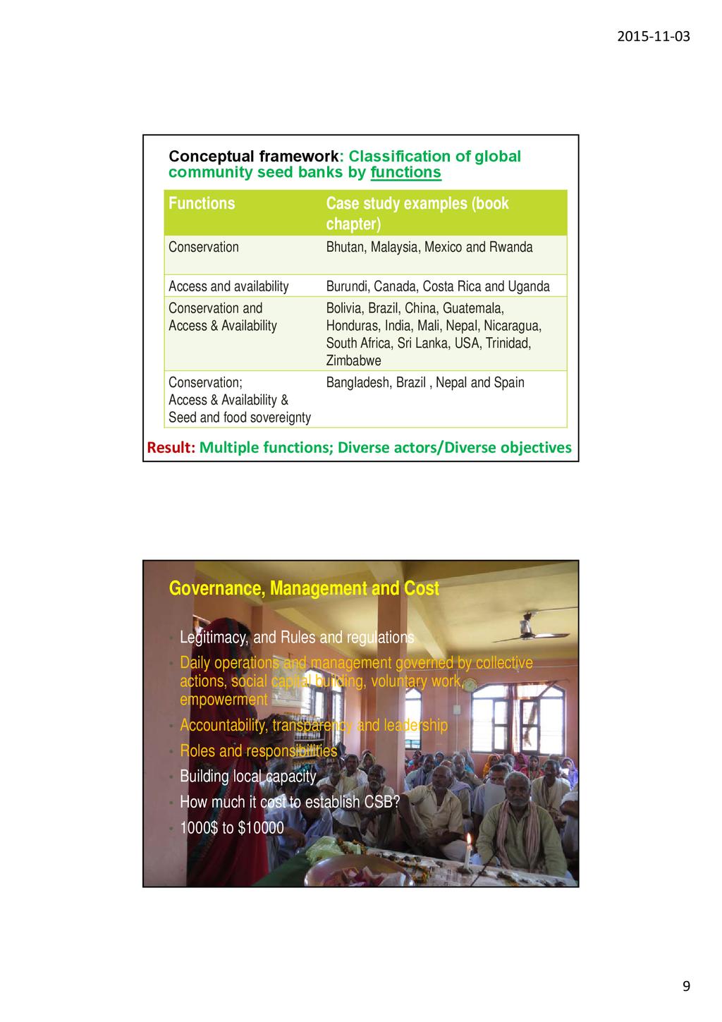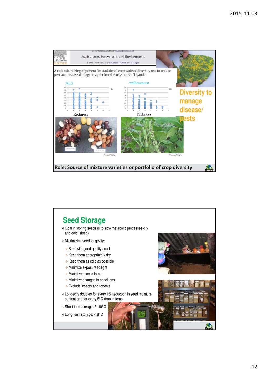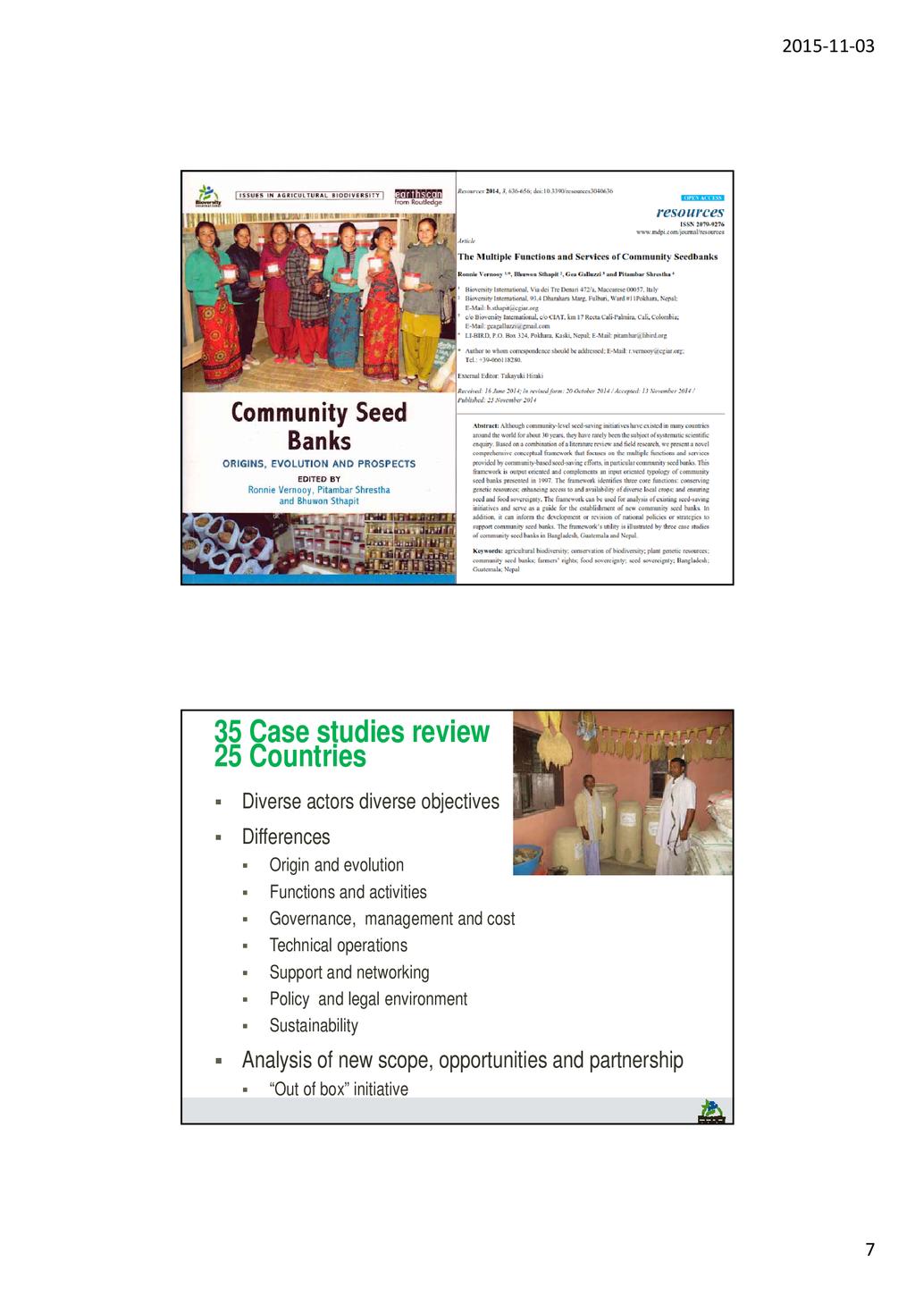 Abstract: The farmer seed system is currently under stress and is surrounded by many misconceptions that are scientifically not evident. Community seed banks have been around for about 30 years but they have not been systematically reviewed to analyze their strengths, weaknesses/gaps, and opportunities. They have been designed and implemented to conserve, restore, revitalize, strengthen, and improve resilient local seed systems in order to address a number of challenges: food insecurity, malnutrition, poverty, and climate change. Bioversity International has reviewed the history, evolution, experiences, successes and failures, challenges, and prospects of 35 community seed banks from 25 countries. They have also studied functions and activities, governance and management, technical operations, support and networking, policy and legal environment, and sustainability of these community seed banks. Of these, a critical analysis of a few successful community seed banks was undertaken to understand main drivers for successful operations and meeting the goals. Key principles and good practices of successful community seed banks are illustrated as scalable practices and solutions.