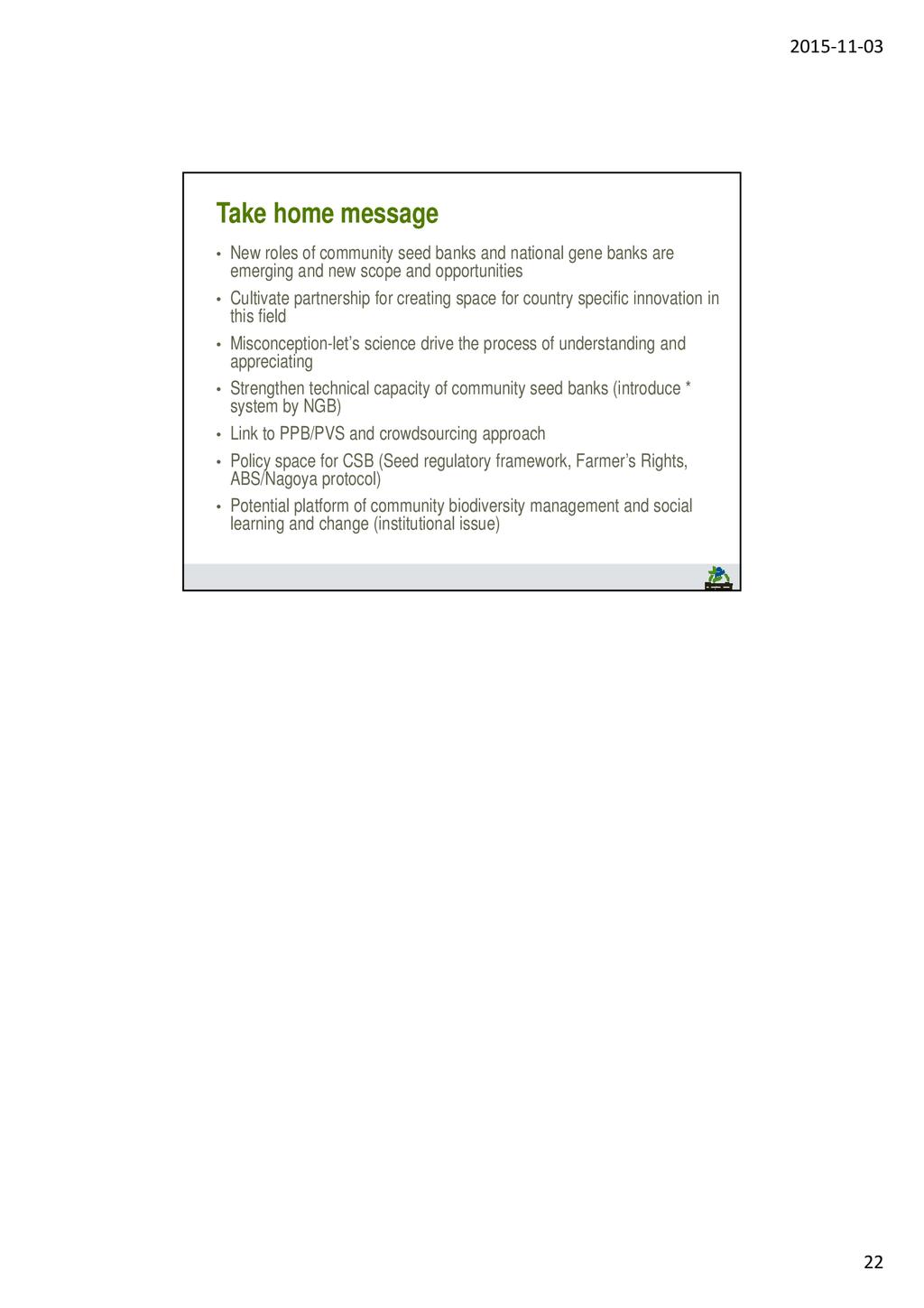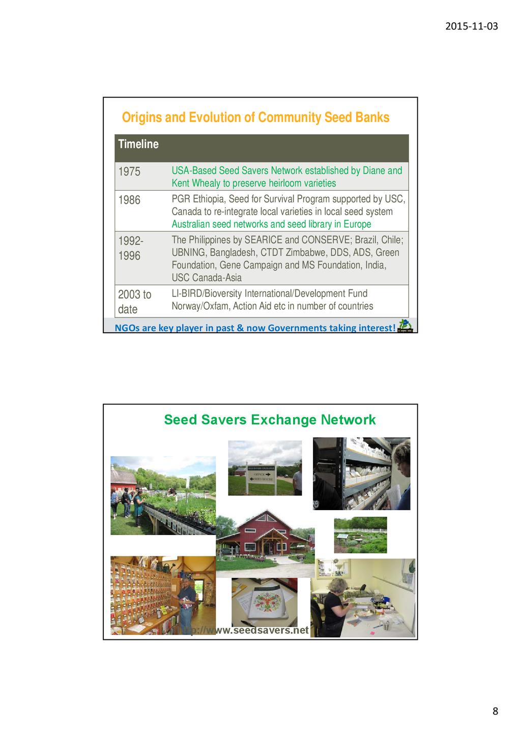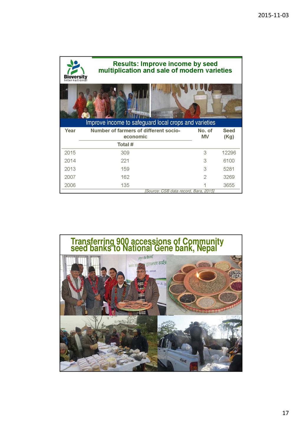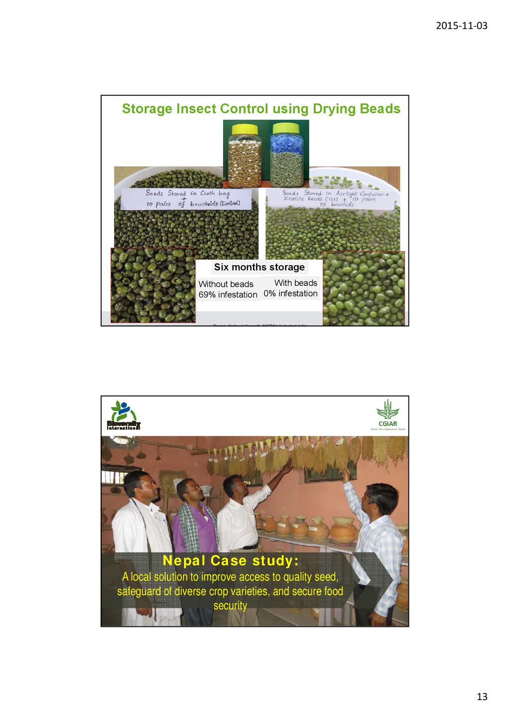 Abstract: The farmer seed system is currently under stress and is surrounded by many misconceptions that are scientifically not evident. Community seed banks have been around for about 30 years but they have not been systematically reviewed to analyze their strengths, weaknesses/gaps, and opportunities. They have been designed and implemented to conserve, restore, revitalize, strengthen, and improve resilient local seed systems in order to address a number of challenges: food insecurity, malnutrition, poverty, and climate change. Bioversity International has reviewed the history, evolution, experiences, successes and failures, challenges, and prospects of 35 community seed banks from 25 countries. They have also studied functions and activities, governance and management, technical operations, support and networking, policy and legal environment, and sustainability of these community seed banks. Of these, a critical analysis of a few successful community seed banks was undertaken to understand main drivers for successful operations and meeting the goals. Key principles and good practices of successful community seed banks are illustrated as scalable practices and solutions.