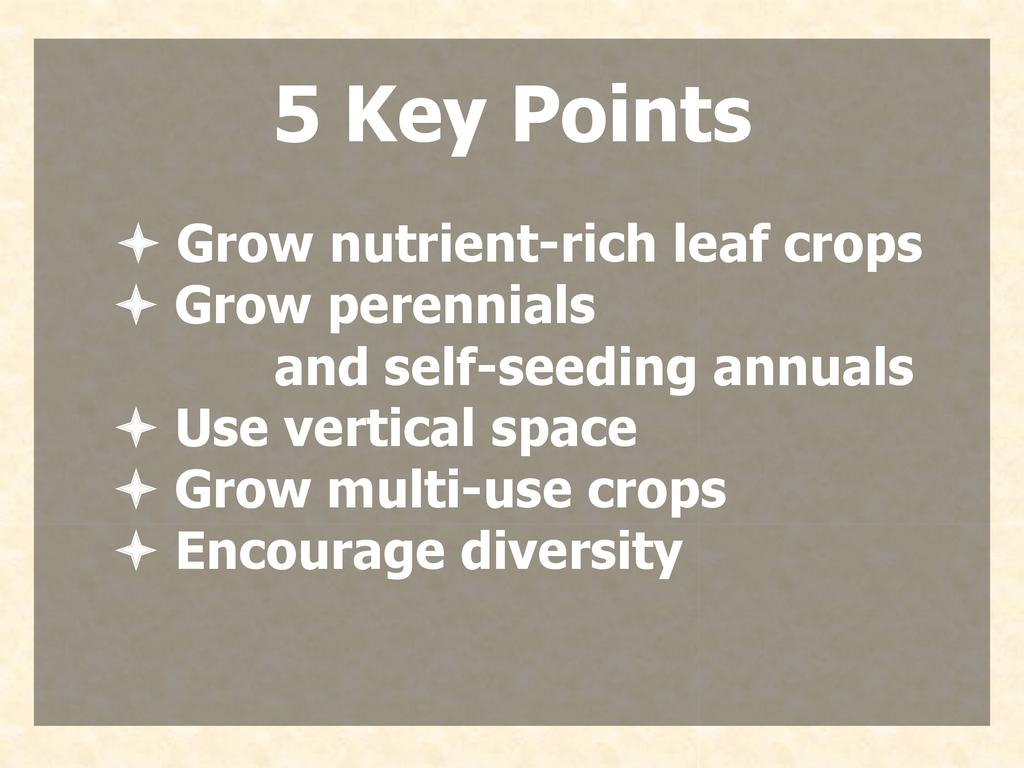 Grow a small poly-culture garden that addresses both nutritional and ecological shortcomings of our food systems. Focusing on some of the most nutritious of the more than 1000 species of plants with edible leaves can maximize the value of the garden to improve your family’s health. Supporting a wide diversity of plant and animal life above and below the soil offers many environmental and economic advantages.