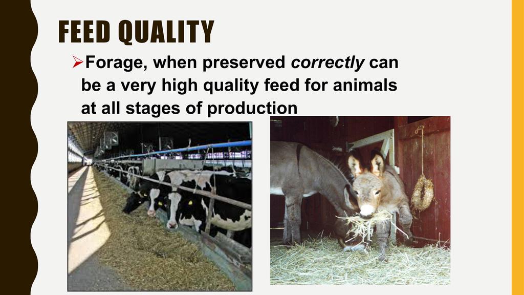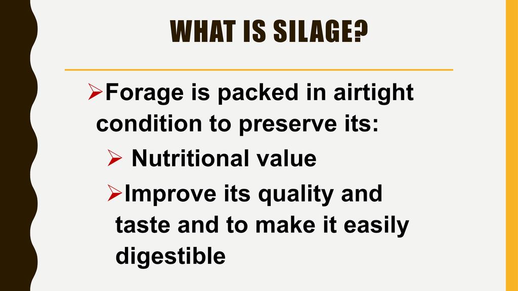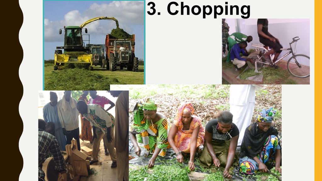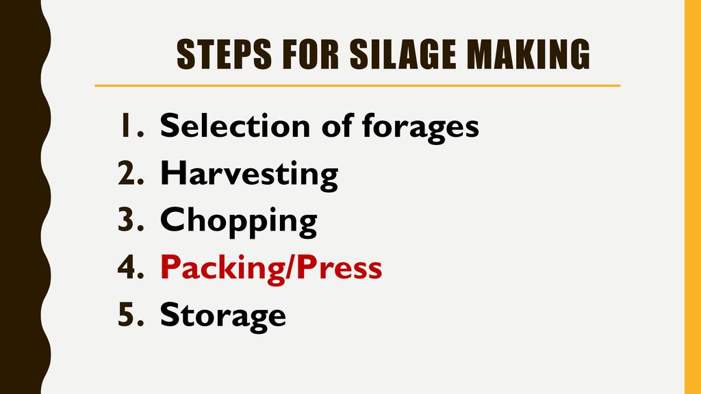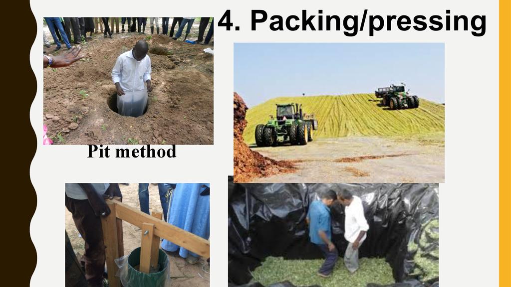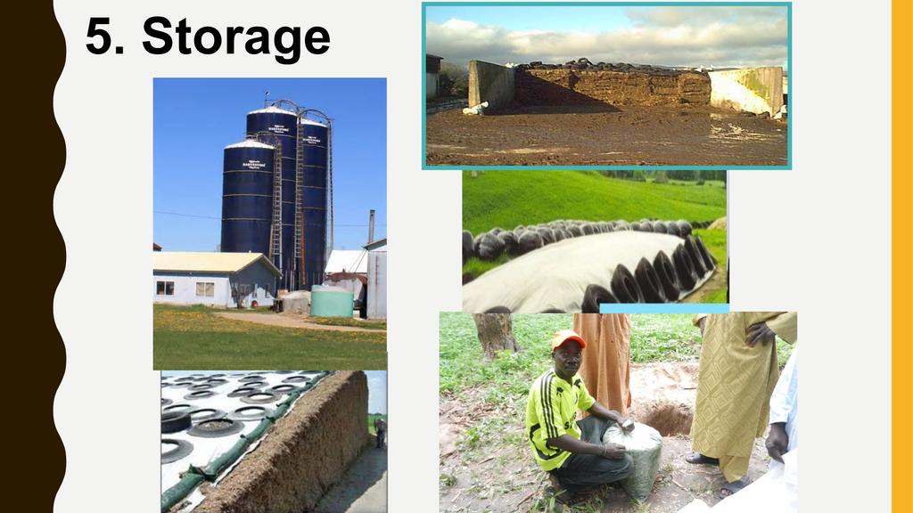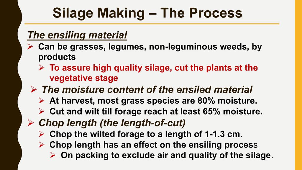 The goal of silage preservation is the conversion of moist, chopped forage with a short storage life to preserved forage that can be fed to livestock as needed. Most legume and grass crops can be ensiled successfully. The key to good silage management is air exclusion to obtain the best preservation of forage as silage. The production process of silage can be divided into four stages: forage harvesting, wilting, chopping, compacting and sealing (for air-tightness). The proper execution of these stages has a big impact on the success or failure of the fermentation and the quality of the silage. The silage concept is more prevalent in temperate regions, with their distinct seasons, than in the tropics. Nevertheless, silage production in the tropics has become more relevant to fulfill the forage needs of smallholder farmers (FAO, 2000).