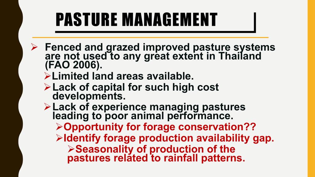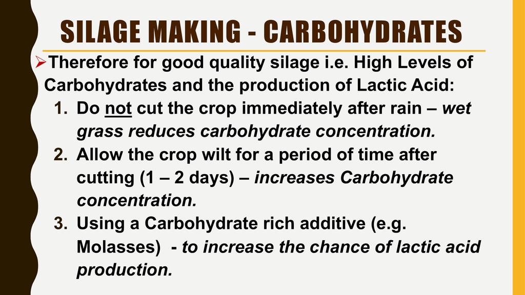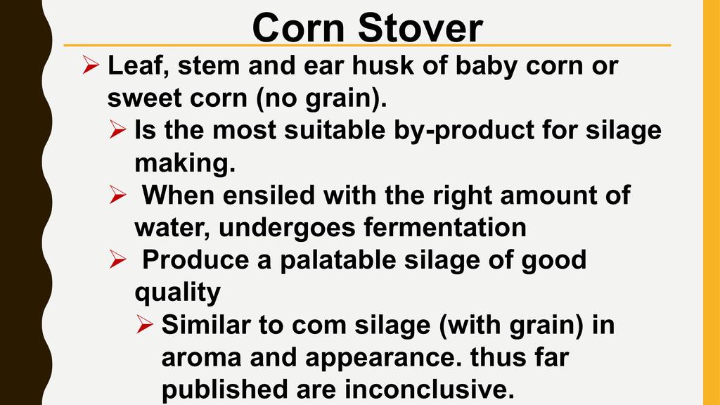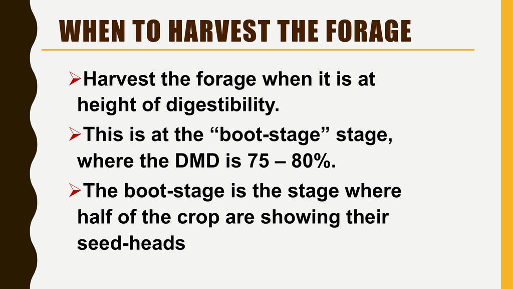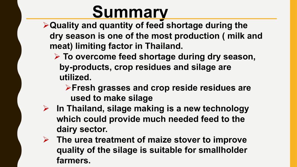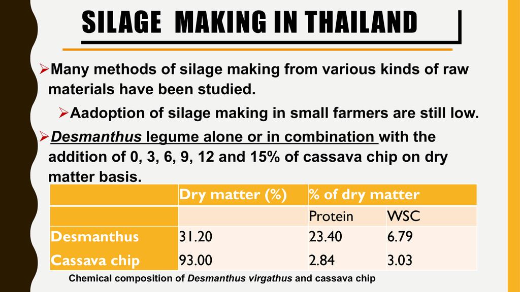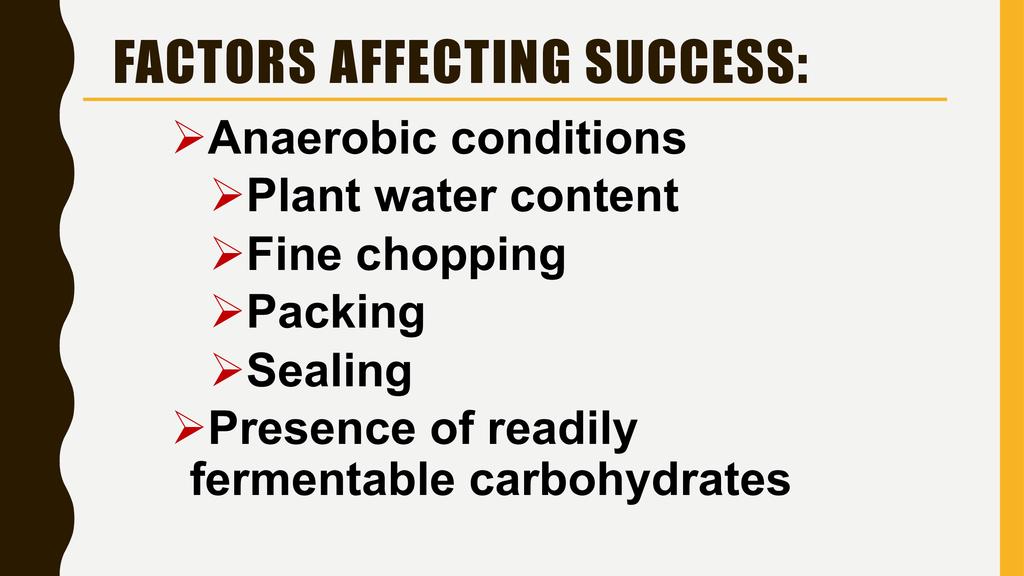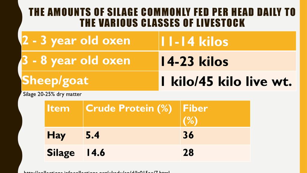 The goal of silage preservation is the conversion of moist, chopped forage with a short storage life to preserved forage that can be fed to livestock as needed. Most legume and grass crops can be ensiled successfully. The key to good silage management is air exclusion to obtain the best preservation of forage as silage. The production process of silage can be divided into four stages: forage harvesting, wilting, chopping, compacting and sealing (for air-tightness). The proper execution of these stages has a big impact on the success or failure of the fermentation and the quality of the silage. The silage concept is more prevalent in temperate regions, with their distinct seasons, than in the tropics. Nevertheless, silage production in the tropics has become more relevant to fulfill the forage needs of smallholder farmers (FAO, 2000).