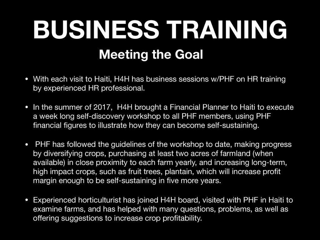 Session : Our goal is to help reduce poverty by assisting a Haitian agriculture initiative with financial and business resources until they have become self-sustaining. This talk will discuss the challenges and successes this program has had. They have been able to purchase additional farmland from sales of produce. Crops grown include black beans, cowpeas, plantain, mango, limes, and soursop.