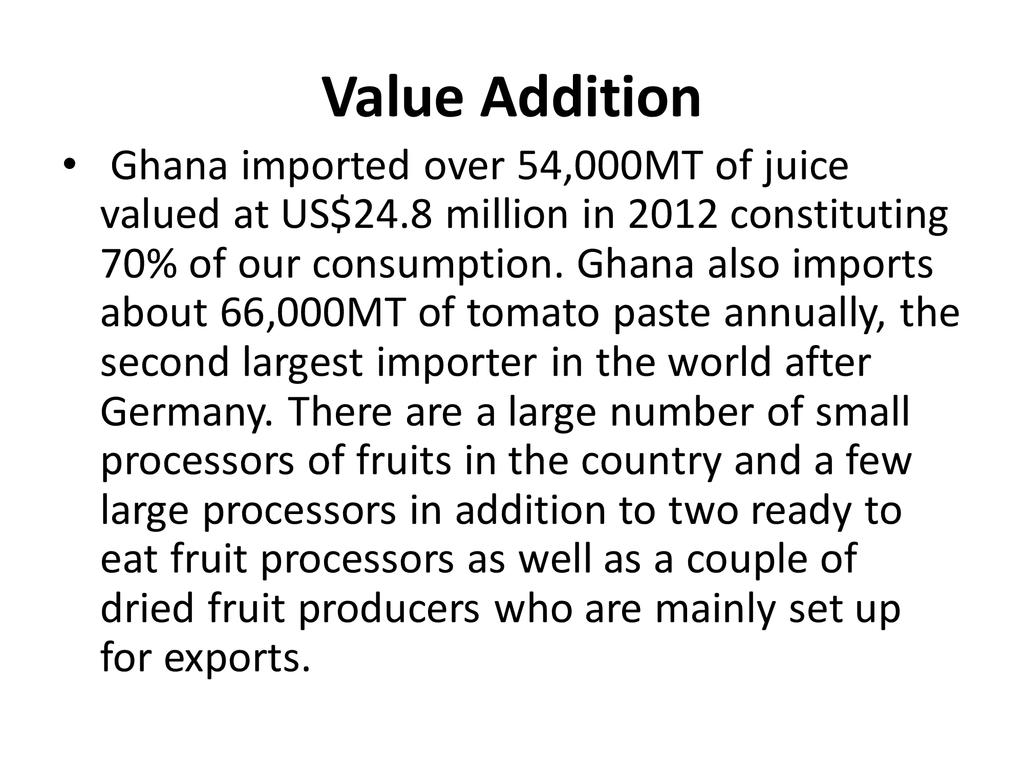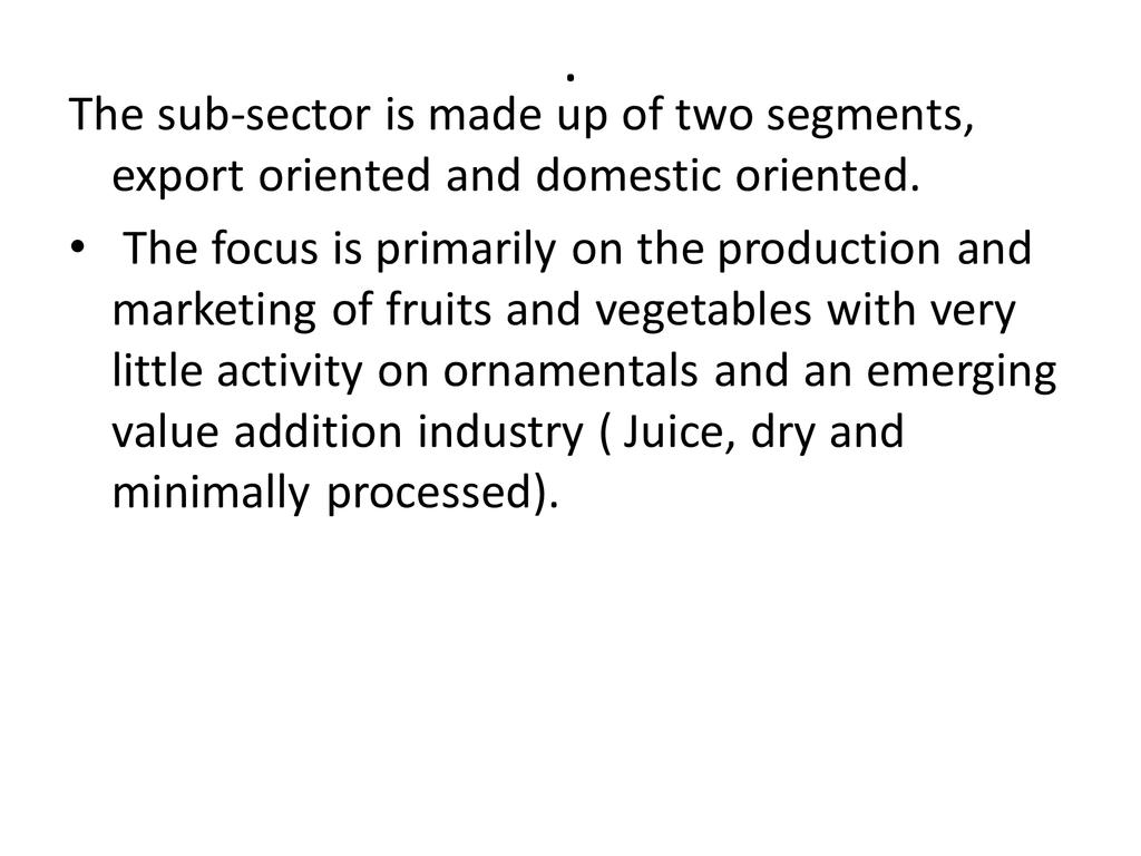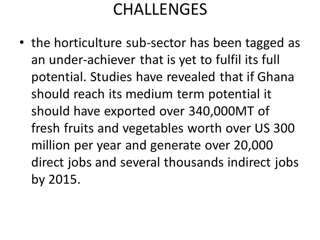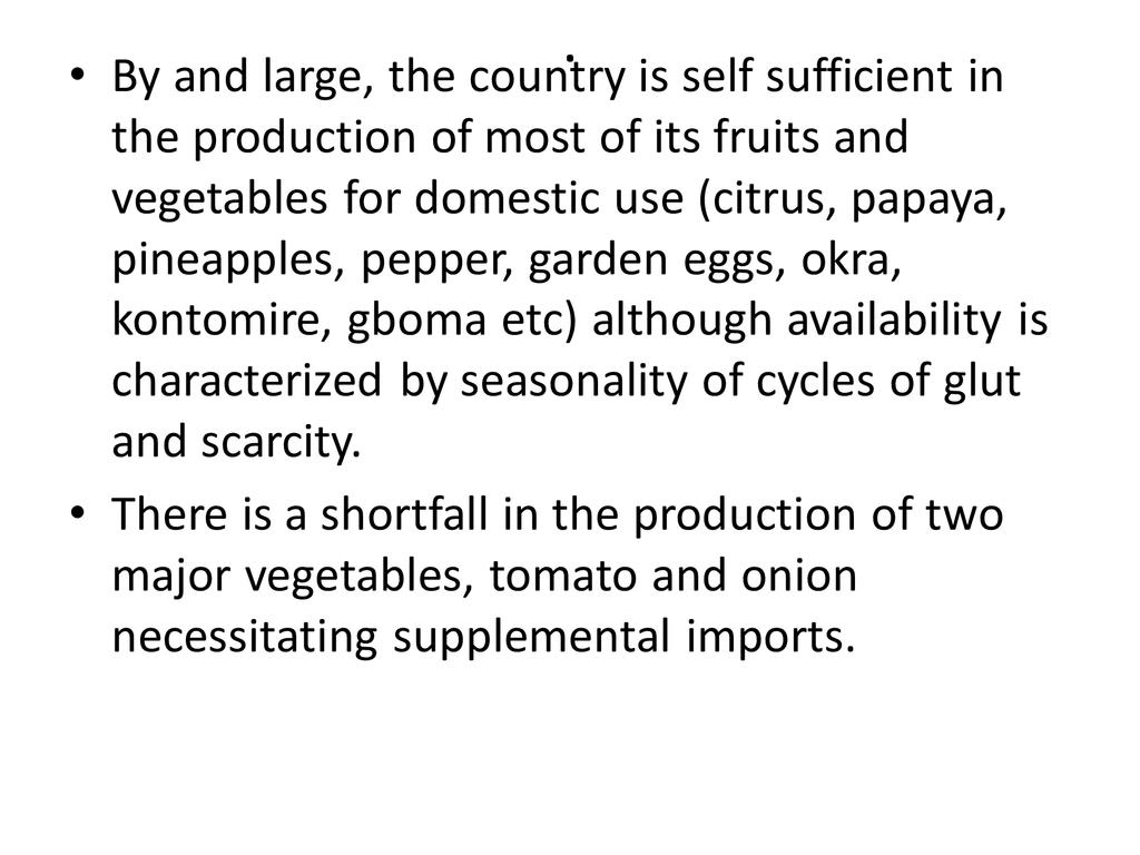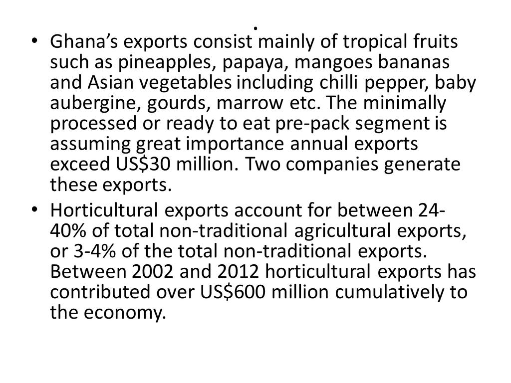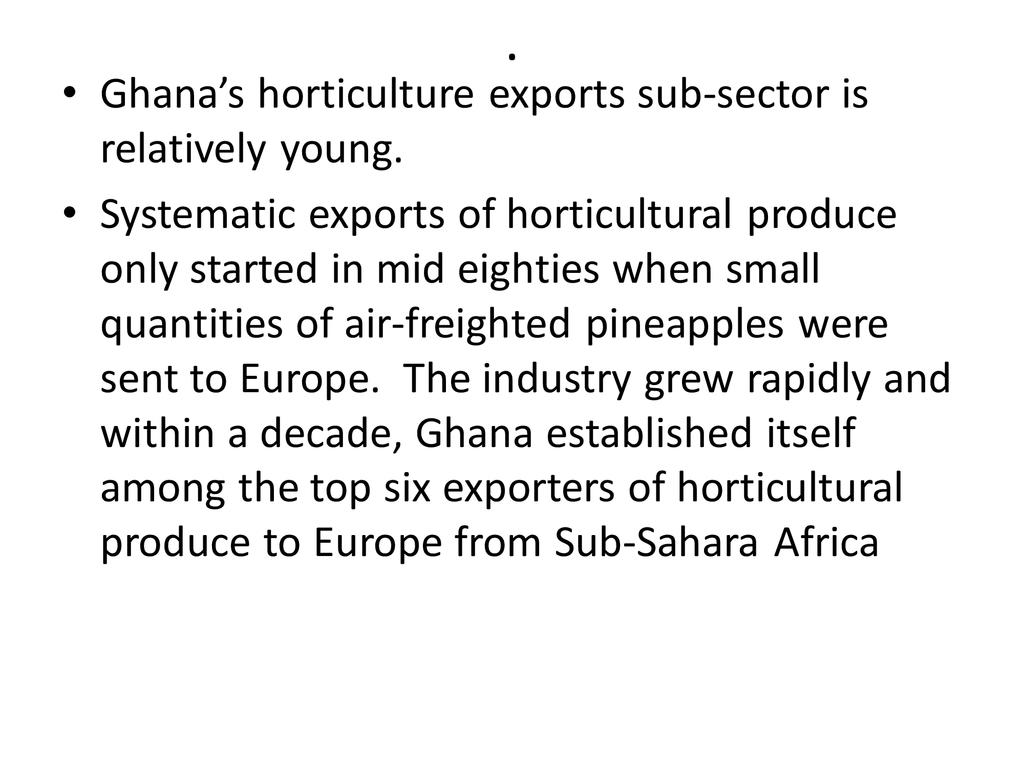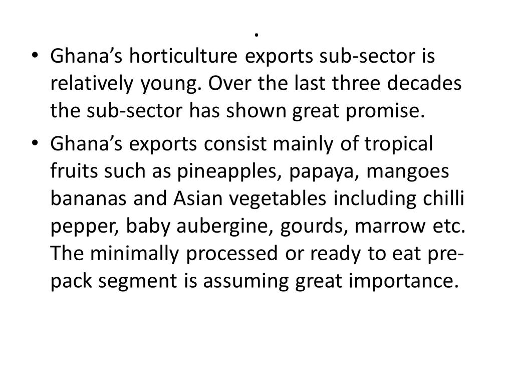 The horticulture sub-sector is a very important segment of Agriculture. It plays a vital role in income generation, foreign exchange earnings, employment and food security The horticulture sub-sector has the potential for the needed diversification of the exports base, modernization of agriculture, acceleration in economic growth and poverty reduction. The sub-sector is made up of two segments, export oriented and domestic oriented.The focus is primarily on the production and marketing of fruits and vegetables with very little activity on ornamentals. There is an emerging value addition industry as well. By and large, the country is self-sufficient in the production of most of its fruits and vegetables for domestic use (citrus, papaya, pineapples, pepper, garden eggs, okra, kontomire, gboma etc) although availability is characterized by seasonality of cycles of glut and scarcity. There is a shortfall in the production of two major vegetables, tomato and onion necessitating supplemental imports.