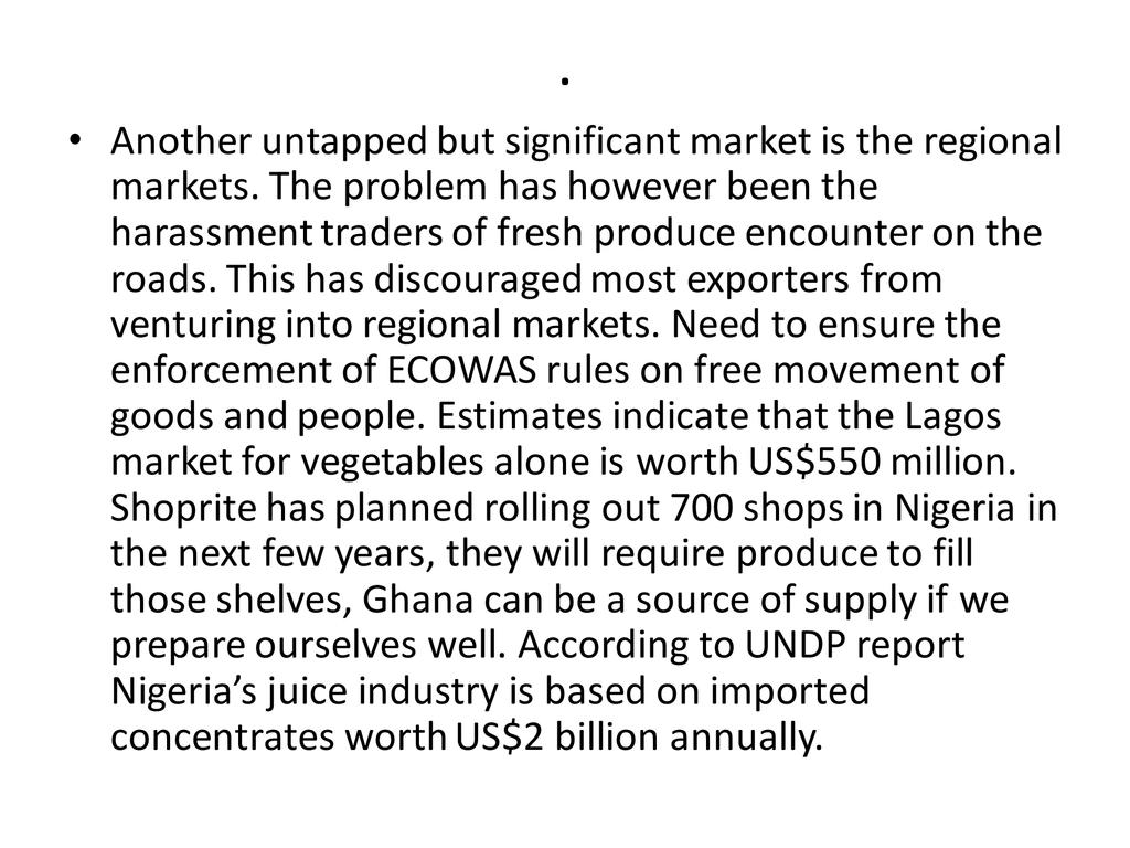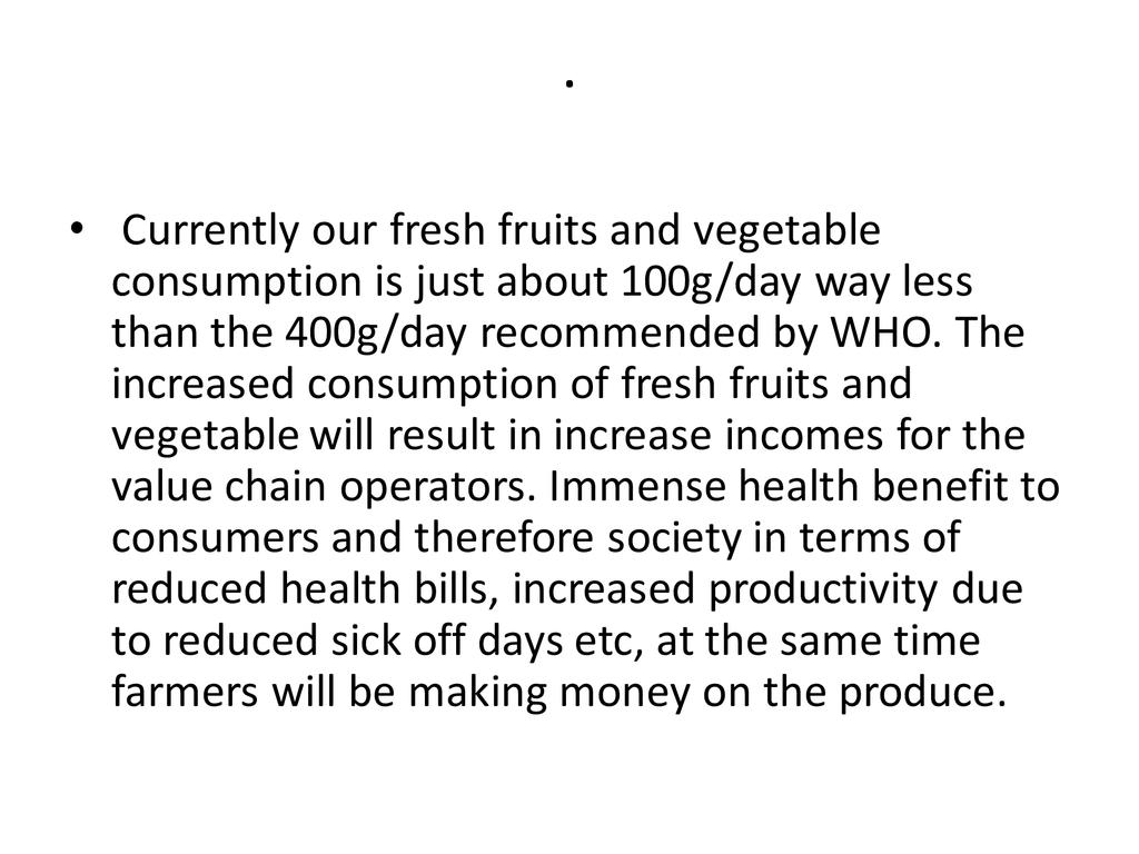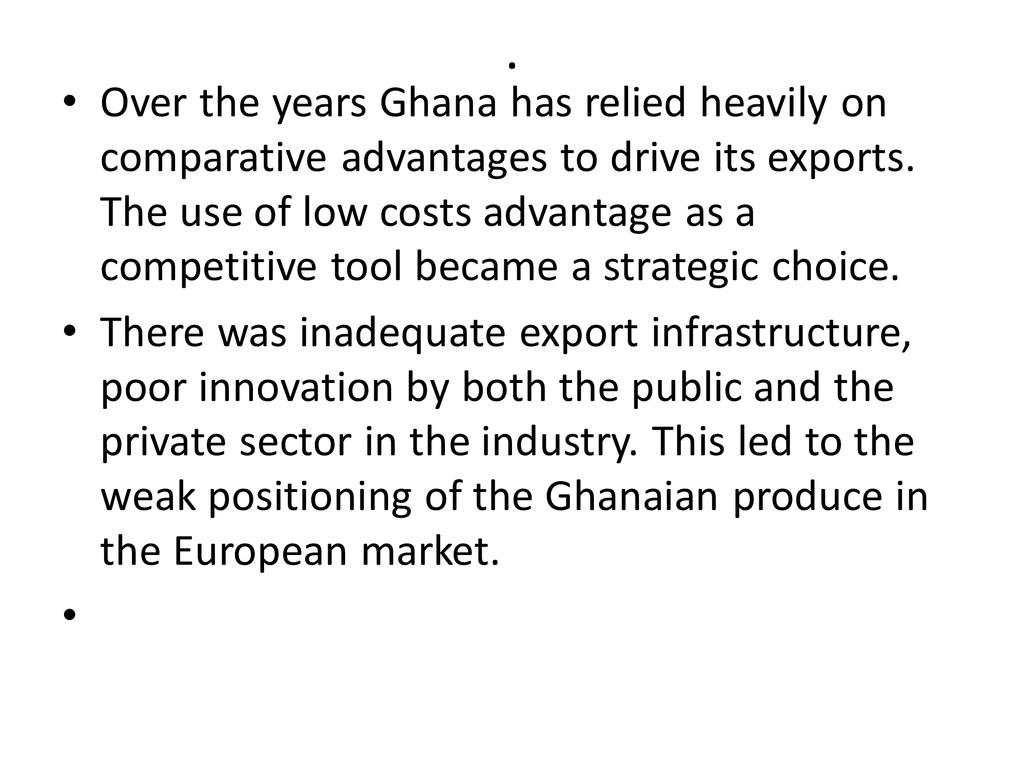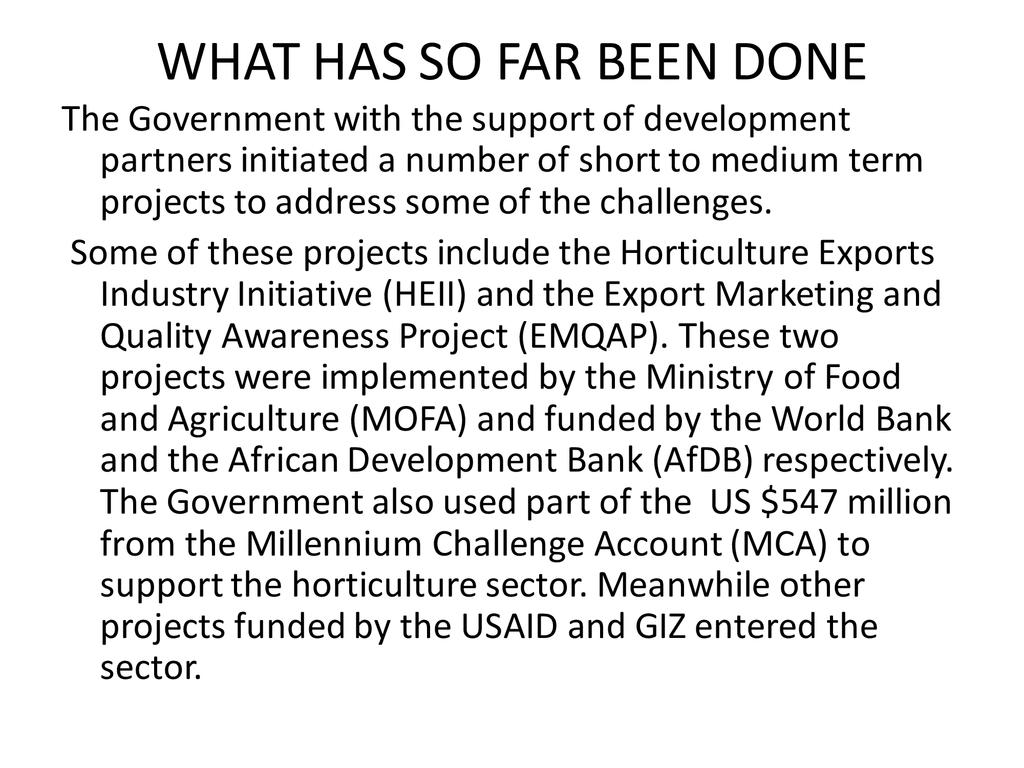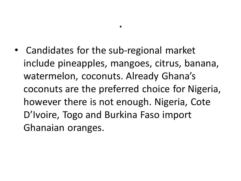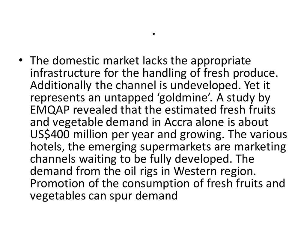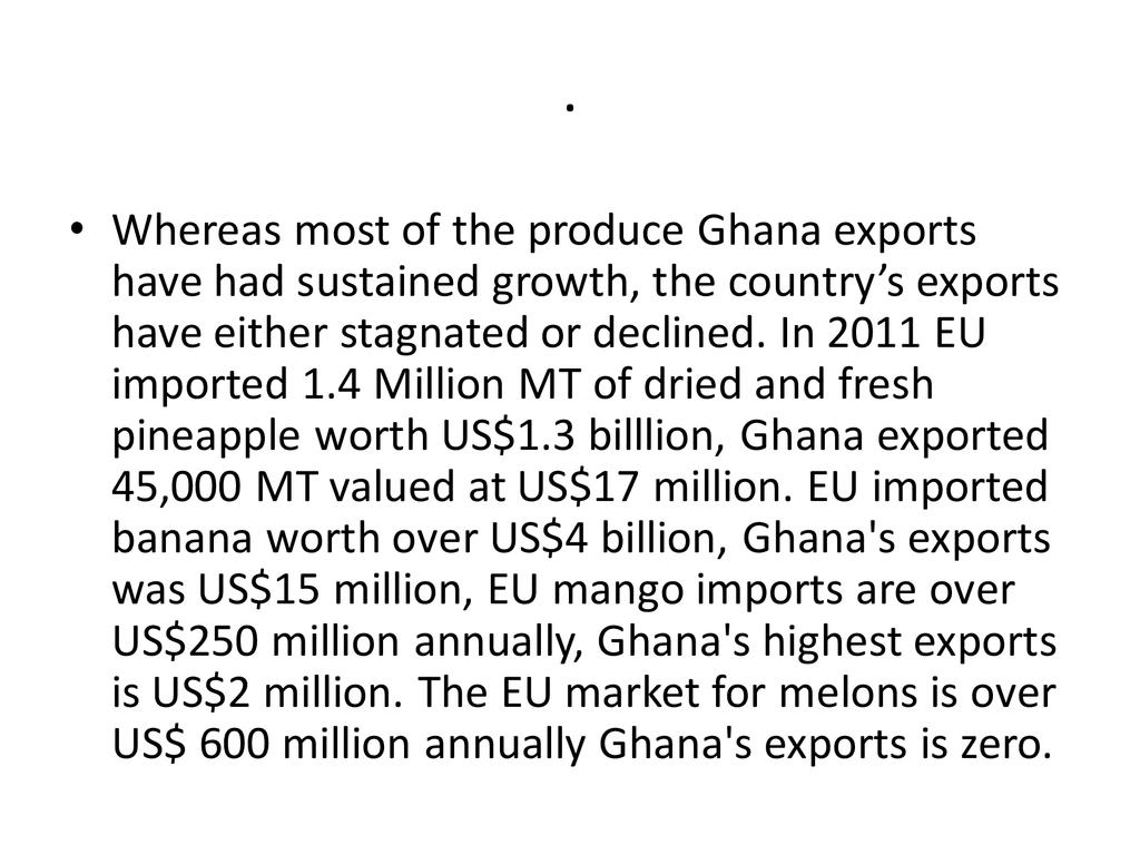 The horticulture sub-sector is a very important segment of Agriculture. It plays a vital role in income generation, foreign exchange earnings, employment and food security The horticulture sub-sector has the potential for the needed diversification of the exports base, modernization of agriculture, acceleration in economic growth and poverty reduction. The sub-sector is made up of two segments, export oriented and domestic oriented.The focus is primarily on the production and marketing of fruits and vegetables with very little activity on ornamentals. There is an emerging value addition industry as well. By and large, the country is self-sufficient in the production of most of its fruits and vegetables for domestic use (citrus, papaya, pineapples, pepper, garden eggs, okra, kontomire, gboma etc) although availability is characterized by seasonality of cycles of glut and scarcity. There is a shortfall in the production of two major vegetables, tomato and onion necessitating supplemental imports.