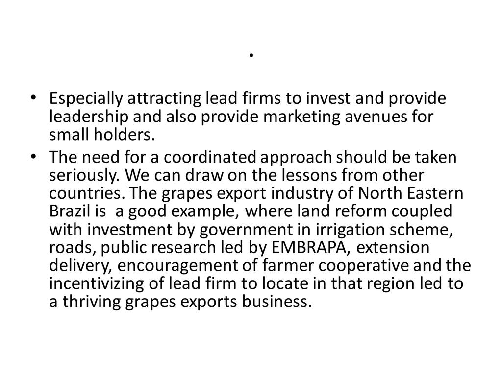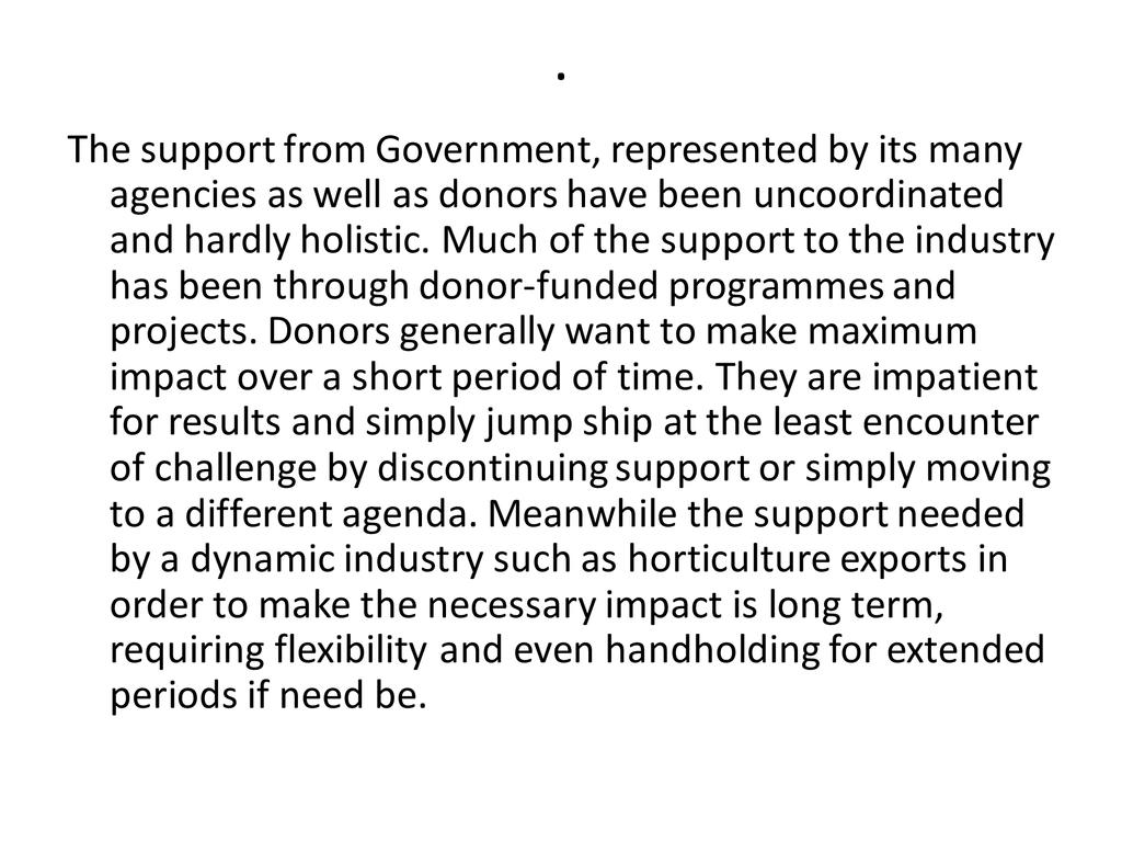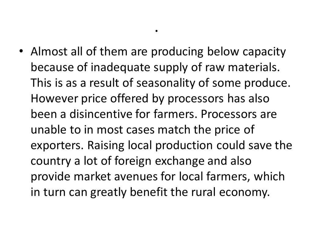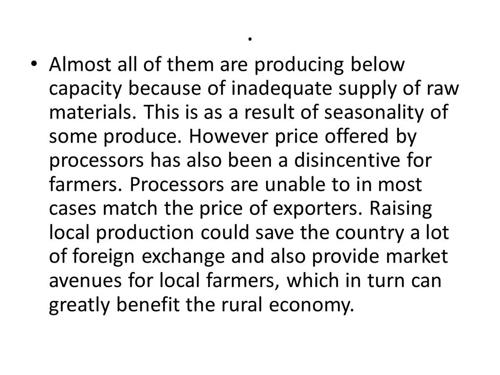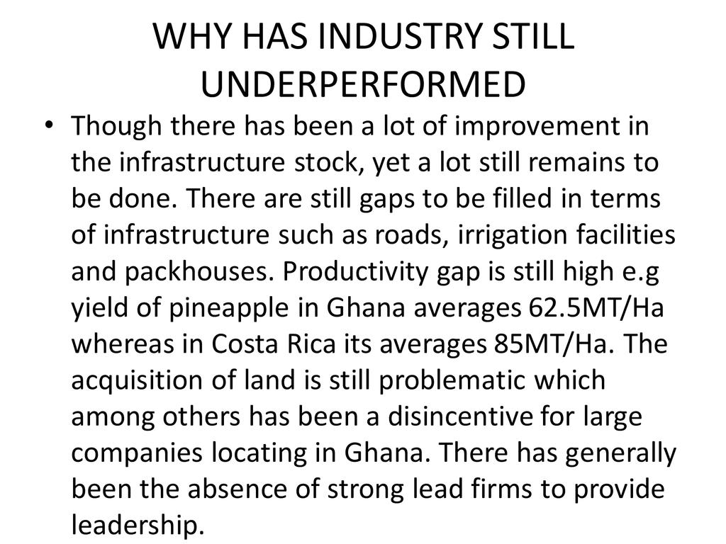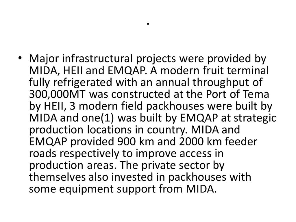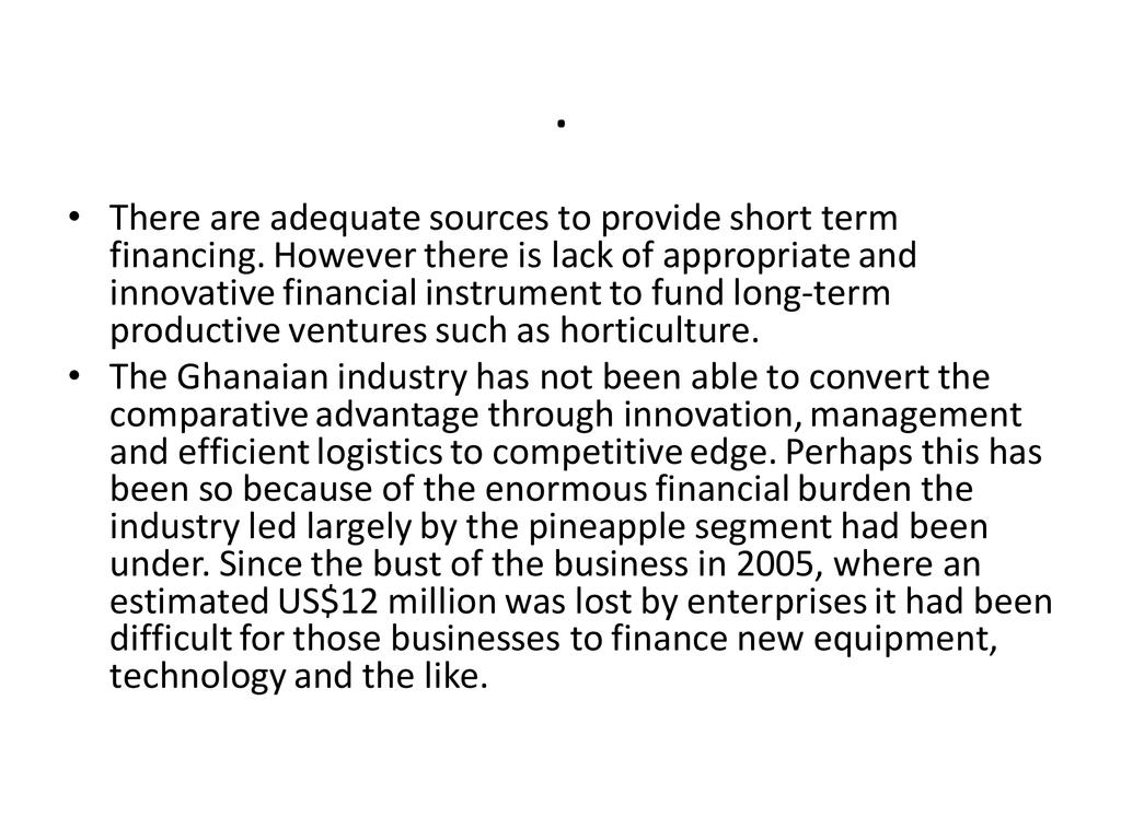 The horticulture sub-sector is a very important segment of Agriculture. It plays a vital role in income generation, foreign exchange earnings, employment and food security The horticulture sub-sector has the potential for the needed diversification of the exports base, modernization of agriculture, acceleration in economic growth and poverty reduction. The sub-sector is made up of two segments, export oriented and domestic oriented.The focus is primarily on the production and marketing of fruits and vegetables with very little activity on ornamentals. There is an emerging value addition industry as well. By and large, the country is self-sufficient in the production of most of its fruits and vegetables for domestic use (citrus, papaya, pineapples, pepper, garden eggs, okra, kontomire, gboma etc) although availability is characterized by seasonality of cycles of glut and scarcity. There is a shortfall in the production of two major vegetables, tomato and onion necessitating supplemental imports.
