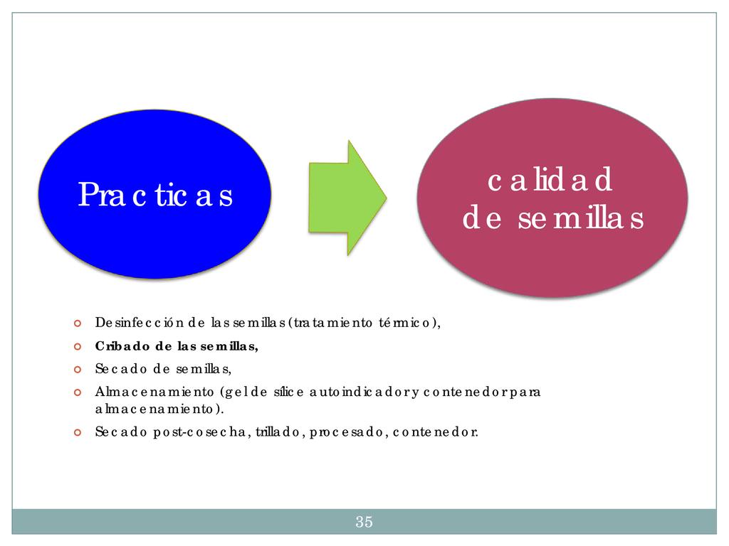 El tema de la calidad de semillas aborda mayor importancia cuando el área de producción es pequeña y gran parte de la obtención de alimentos depende de contar con semilla de buena calidad. Para ello es importante contar con protocolos sencillos para cosechar y almacenar la semilla en las mejores condiciones con bajo presupuesto, y tener las habilidades para medir la calidad de la semilla que se almacena.