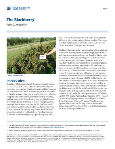 Blackberry (Rubus spp.), family Rosaceae (somatic number 21, 28, 35, 42, 56, 63, 70, 77, 84), is a deciduous crop that grows best in temperate climates. Several blackberry species are native to Florida. Wild blackberries are often harvested in Florida; however, they have several limitations, including comparatively small berries, lack of uniformity, low yield, and late maturation. The culture of improved blackberries in Florida is primarily limited to homeowner production, although there is some potential for “U-Pick” and local sales in north central and north Florida. Blackberry yields in many areas of the country may exceed 6,000 lbs/acre; however, quantitative yield data from Florida are scarce. In Florida, blackberries typically ripen during May and June. They are extremely perishable, and as such, are very difficult to ship satisfactorily to distant markets. The major blackberry production areas in the United States are the Pacific Northwest, Michigan, and Arkansas.