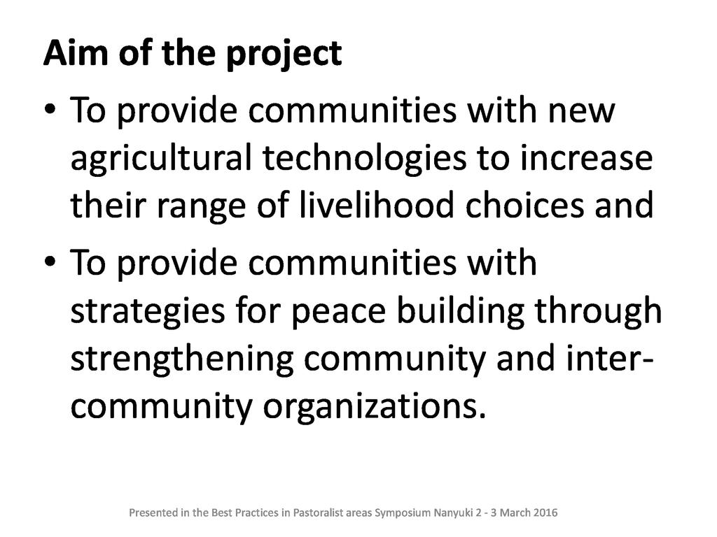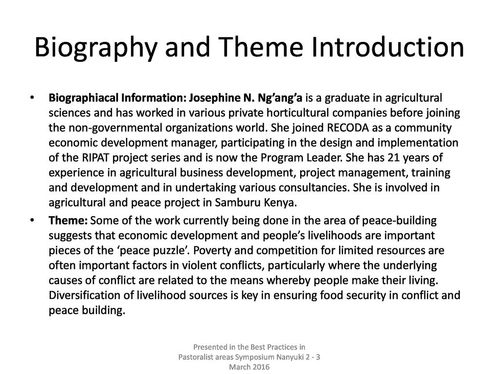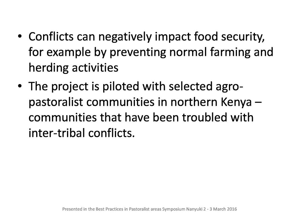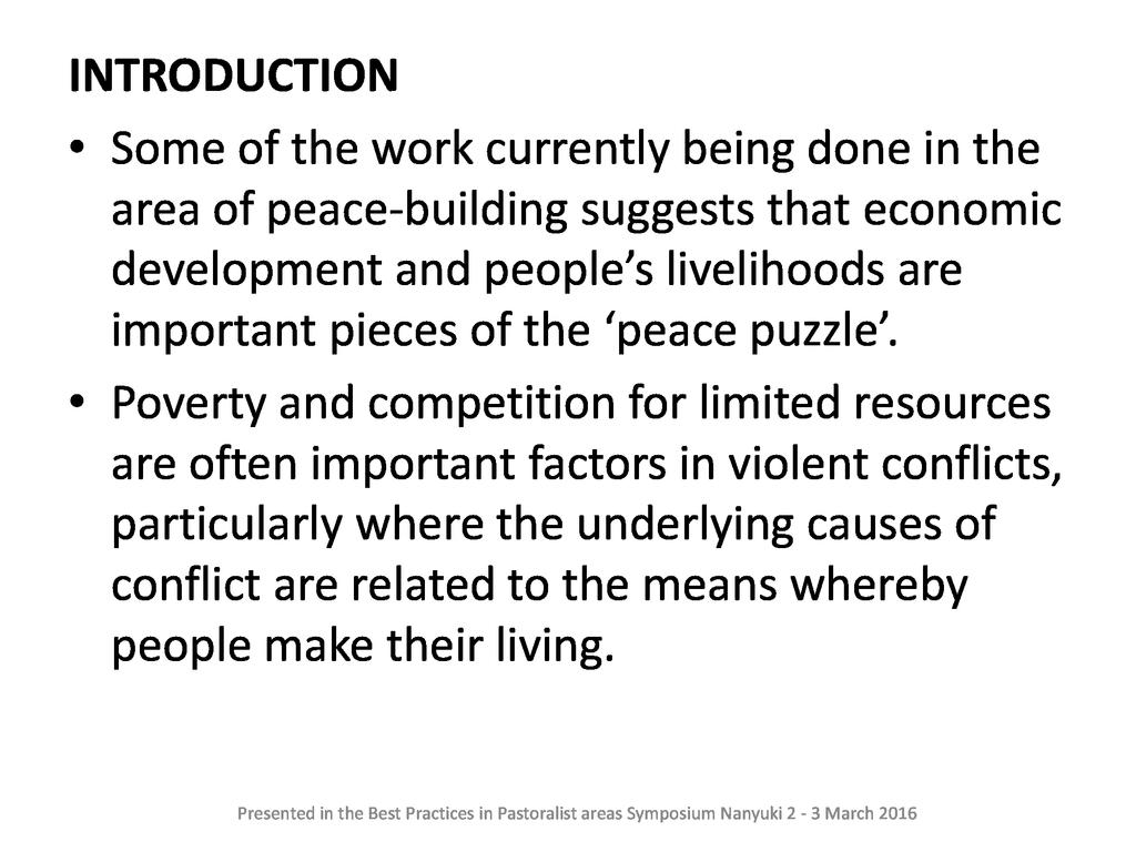 Session: RIPAT- Diversification in Pastoral areas for food security and improved livelihoods Some of the work currently being done in the area of peace-building suggests that economic development and people’s livelihoods are important pieces of the ‘peace puzzle’. Poverty and competition for limited resources are often important factors in violent conflicts, particularly where the underlying causes of conflict are related to the means whereby people make their living. Diversification of livelihood sources is key in ensuring food security in conflict and peace building.