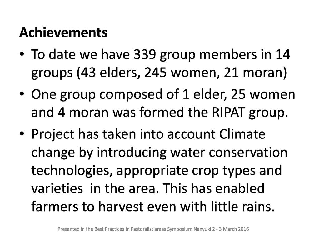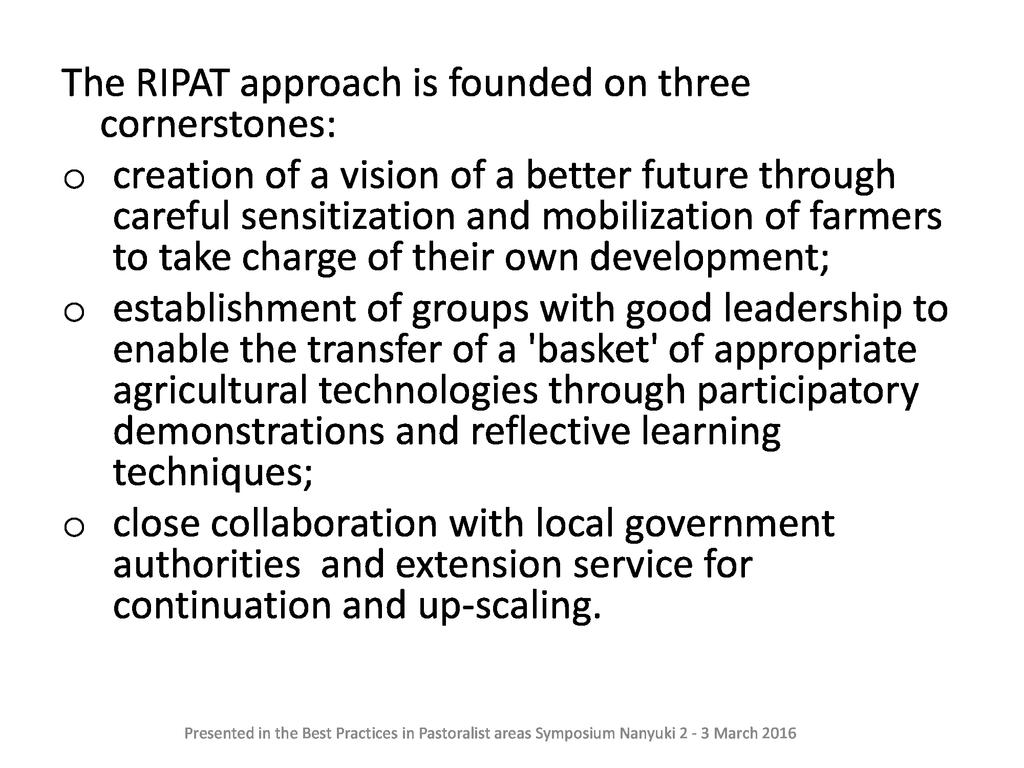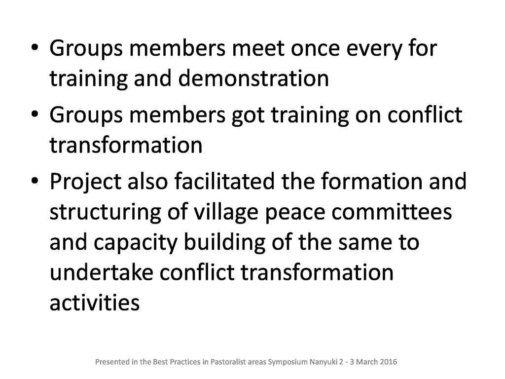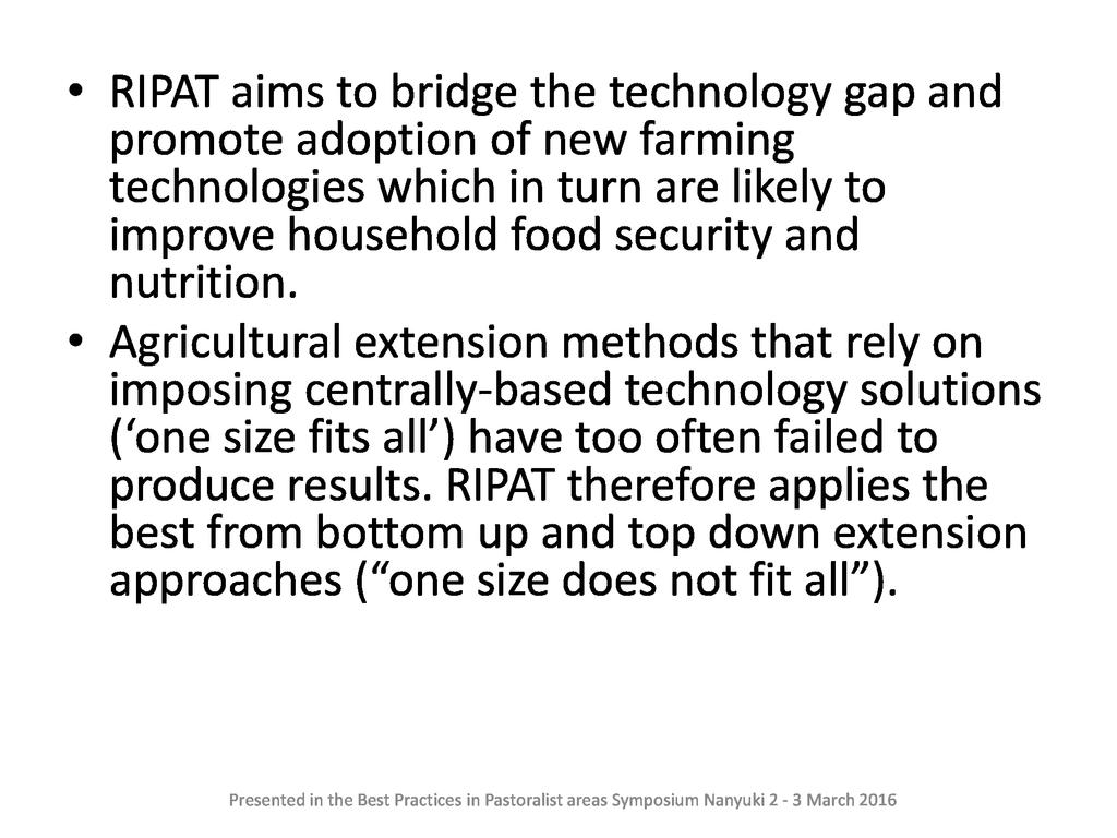 Session: RIPAT- Diversification in Pastoral areas for food security and improved livelihoods Some of the work currently being done in the area of peace-building suggests that economic development and people’s livelihoods are important pieces of the ‘peace puzzle’. Poverty and competition for limited resources are often important factors in violent conflicts, particularly where the underlying causes of conflict are related to the means whereby people make their living. Diversification of livelihood sources is key in ensuring food security in conflict and peace building.