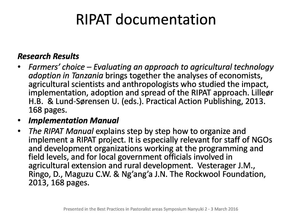 Biographical information: Josephine Nganga works for RECODA in Tanzania. She is a graduate in agricultural sciences and has worked in various private horticultural companies before joining the non-governmental organizations world. She joined RECODA as a community economic development manager, participating in the design and implementation of the RIPAT project series and is now the Program Leader. She has 21 years of experience in agricultural business development, project management, training and development and in undertaking various consultancies. She is involved in an agricultural and peace project in Samburu Kenya.