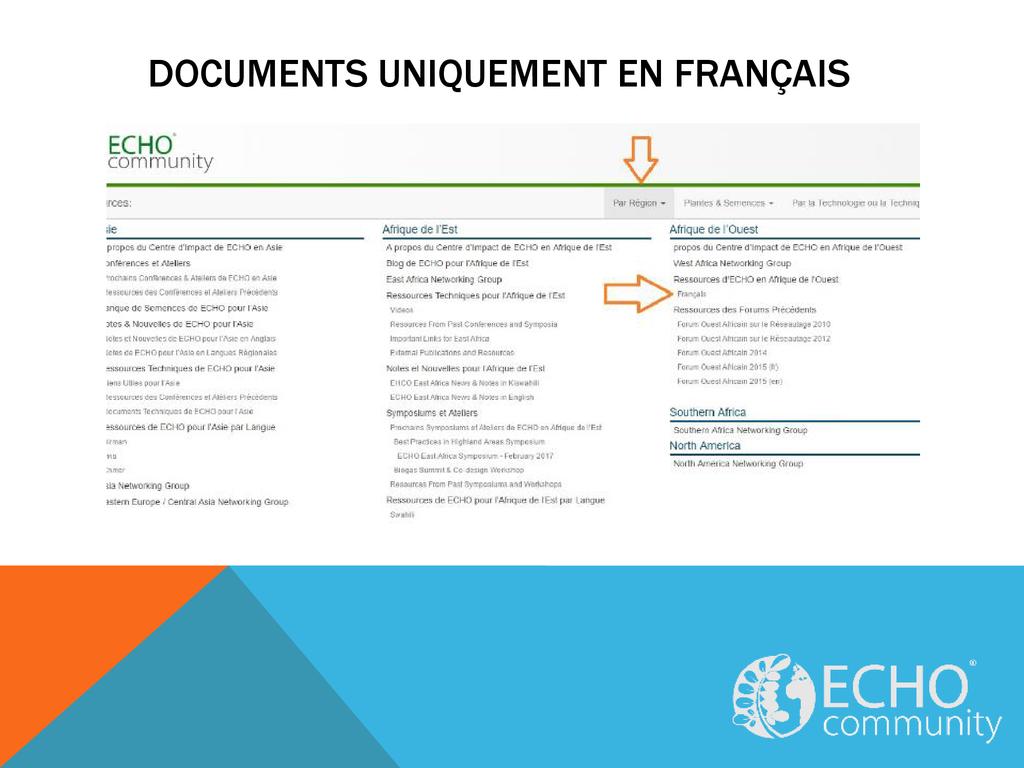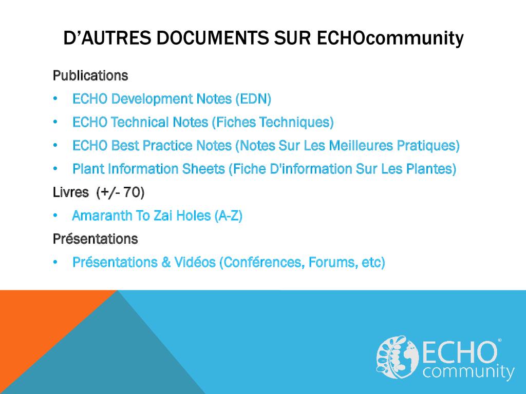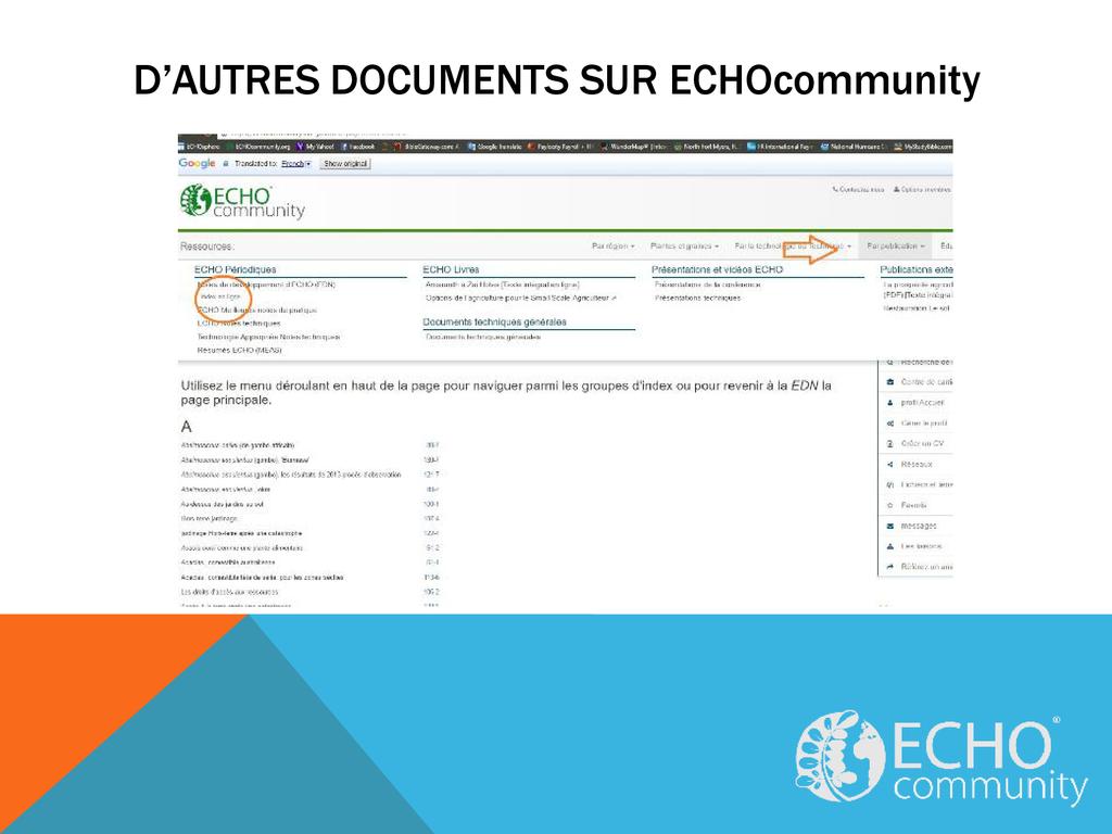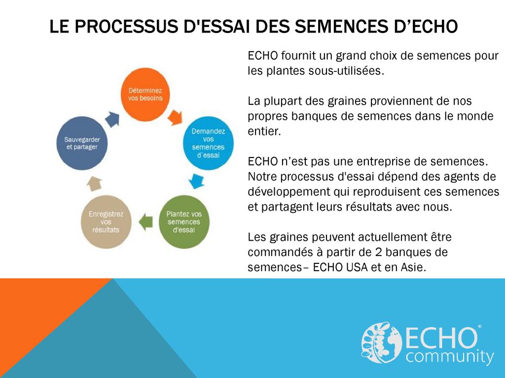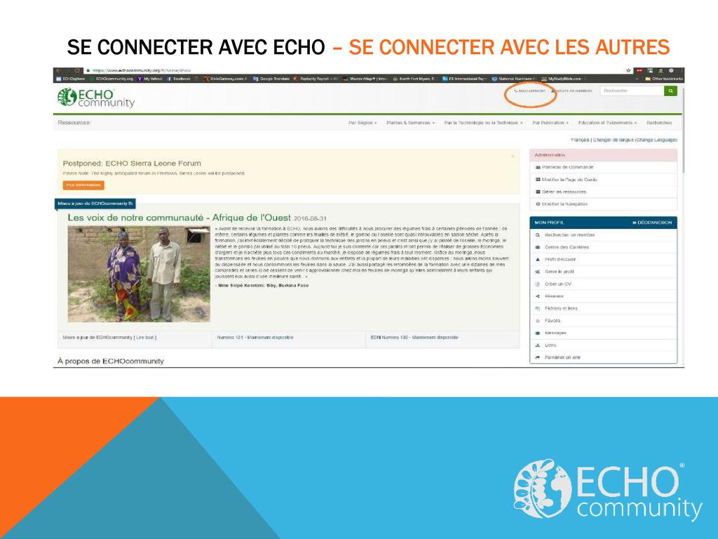 ECHO est surtout un vaste réseau de personnes qui échangent et partagent sur tous les sujets ayant trait à la réduction de la faim et à l’amélioration des conditions de vie à travers la formation et les ressources agricoles. Plus d’informations sur cette communauté vous permettra de vous joindre à elle et tirer tout le meilleur de cette merveilleuse mine de connaissances.
