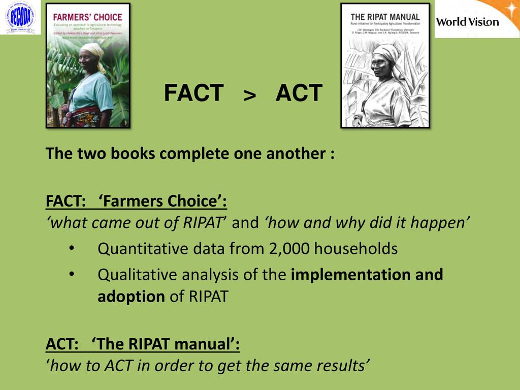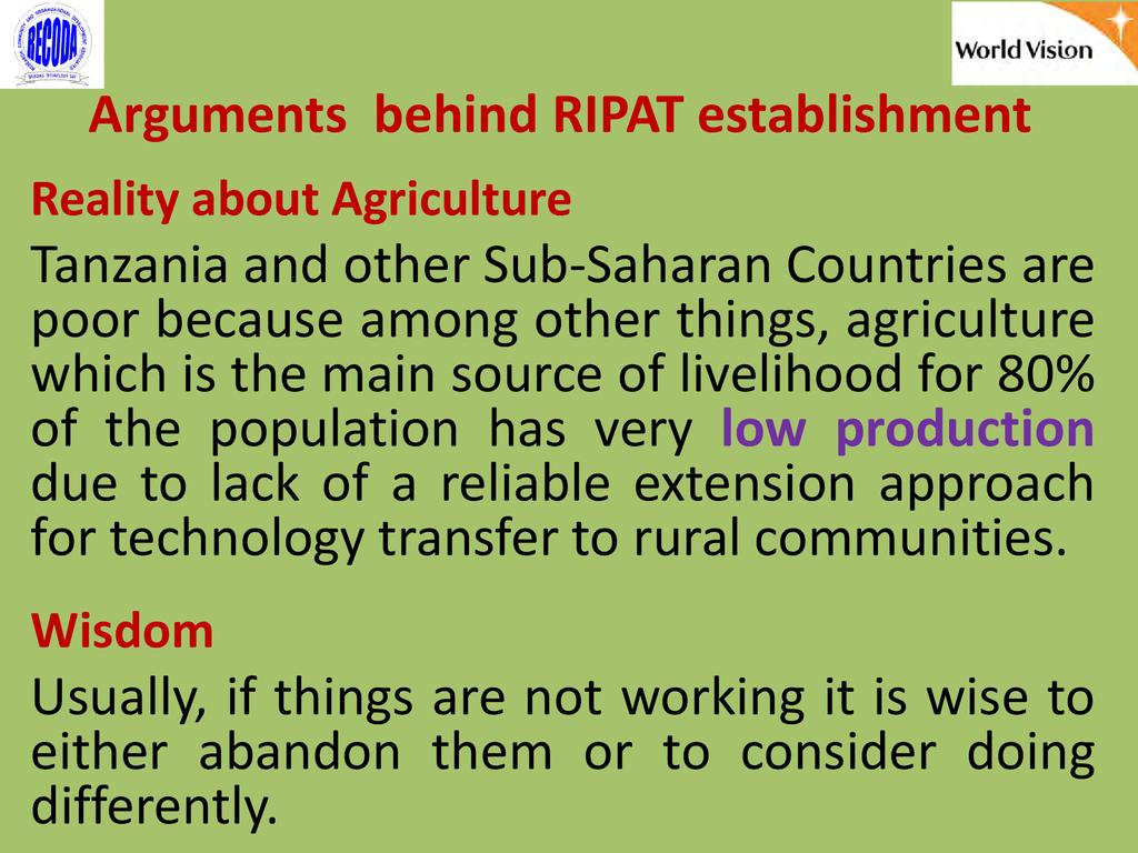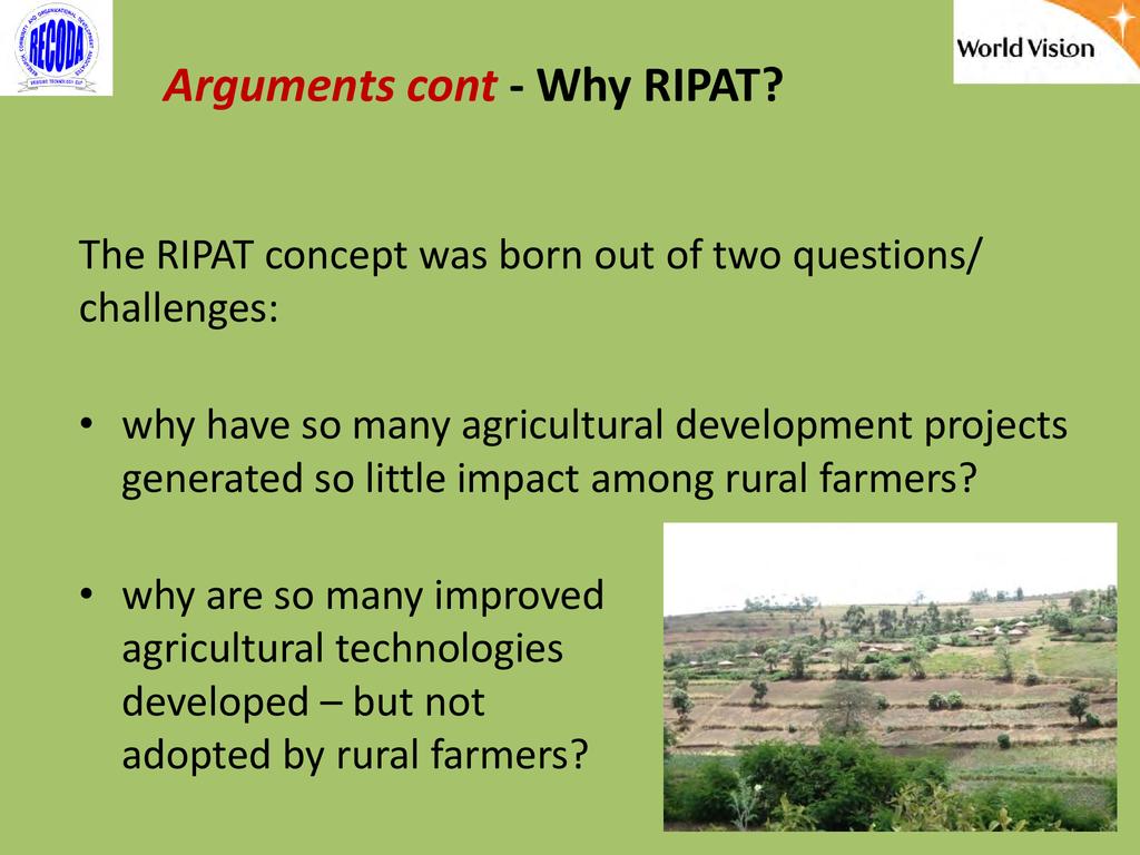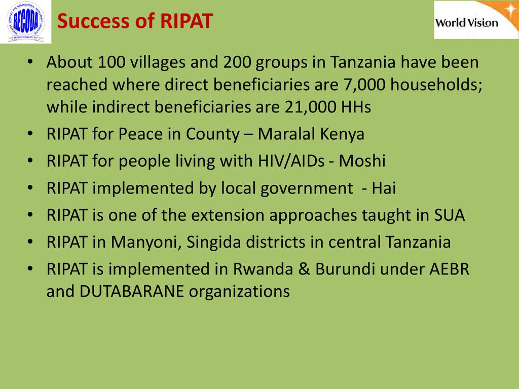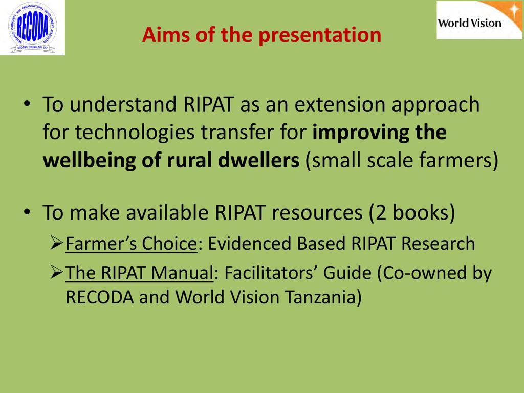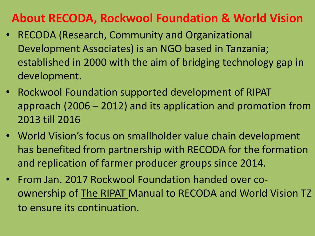 RIPAT (Rural Initiatives for Participatory Agricultural Transformation) is a participatory extension approach aims to close the agricultural technology gap as a means of improving livelihoods and self-support among rural small-scale farmers. The approach is as well a documented step-by-step guide on how organizations working with small-scale farmers can transfer various technologies aiming at improving the food and nutrition security and income of poor small scale farmers in the Global South. The approach provide solutions to why so many agricultural development projects have generated so little impact among rural farmers, and why so many improved agricultural technologies are developed – but not adopted by small scale farmers. The RIPAT was developed by RECODA in cooperation with the Rockwool Foundation (RF) and that process was funded by the RF; but of recently (2017), World Vision Tanzania (WVT) and RECODA have co-owned RIPAT – hence this is a joint presentation.