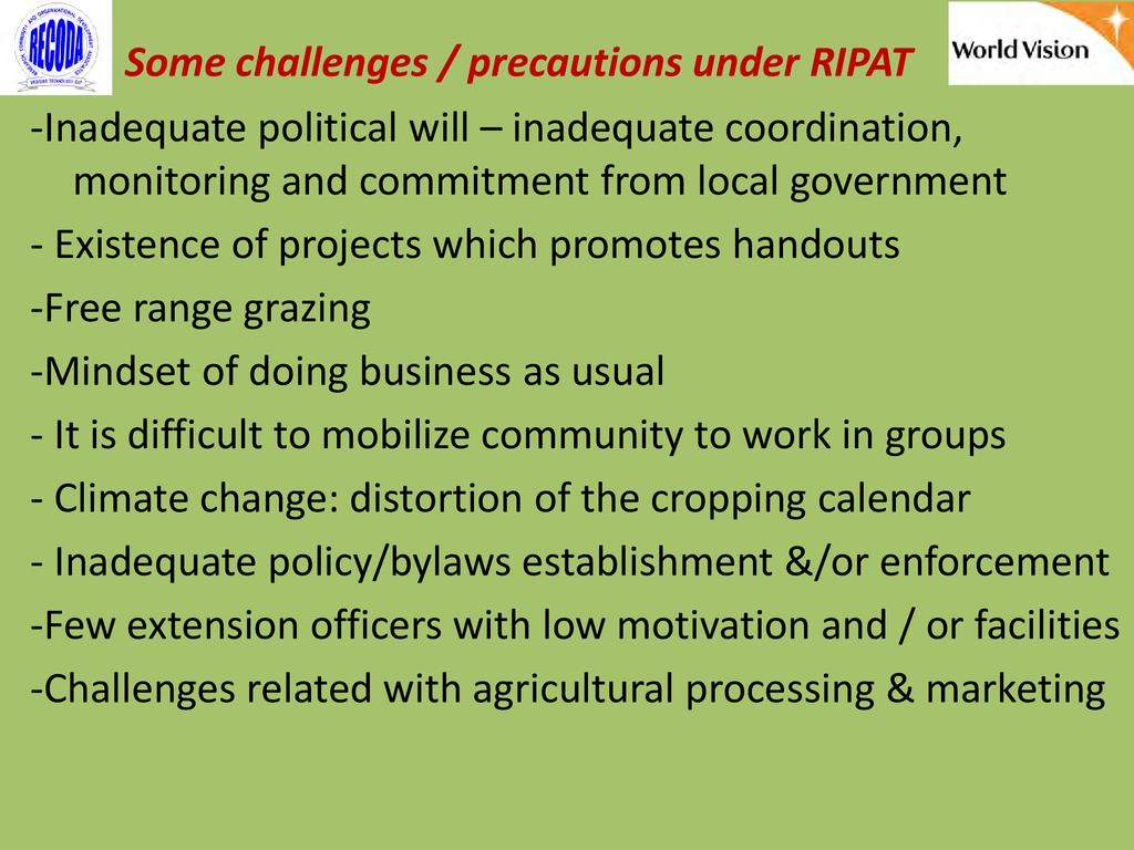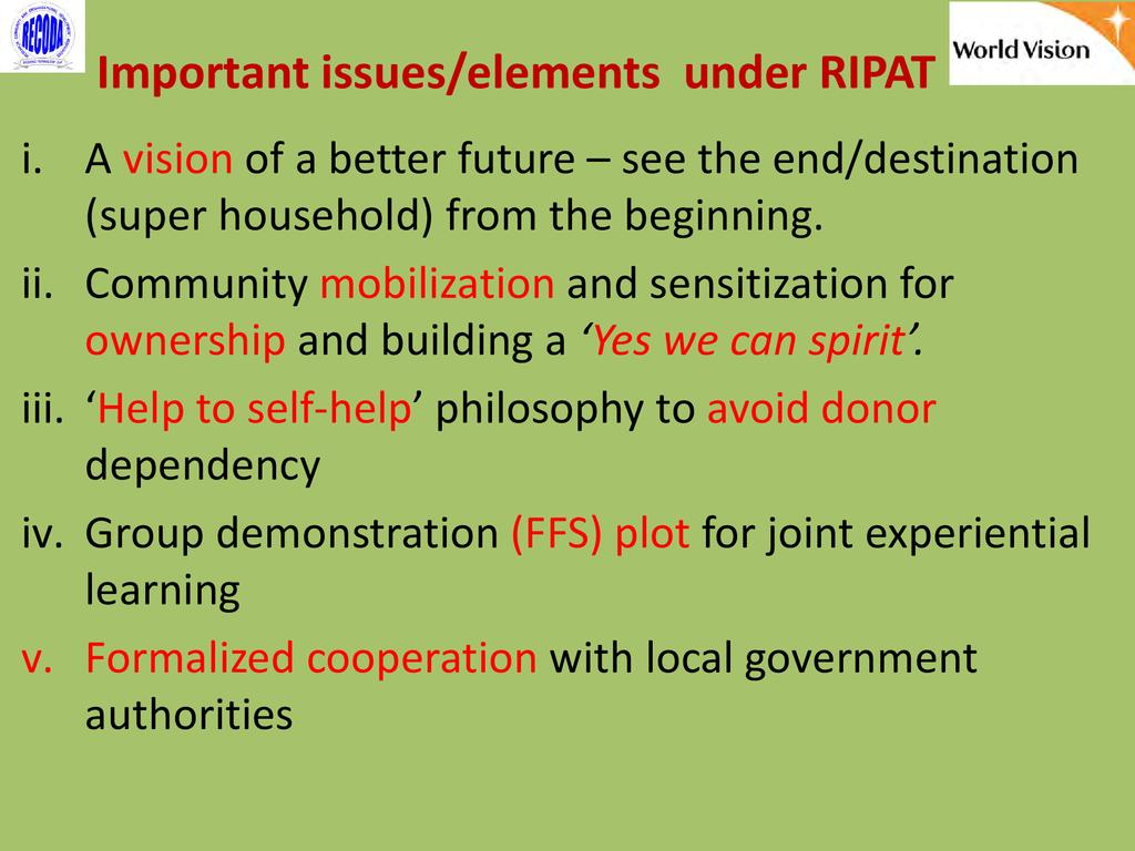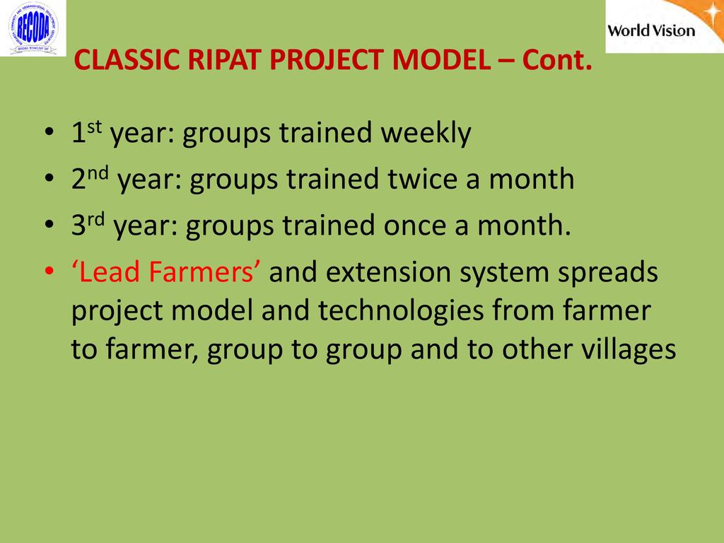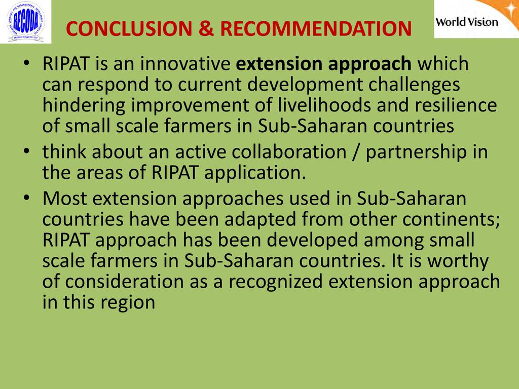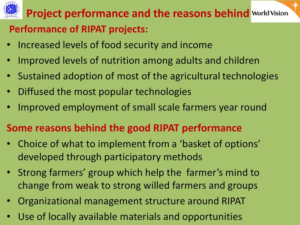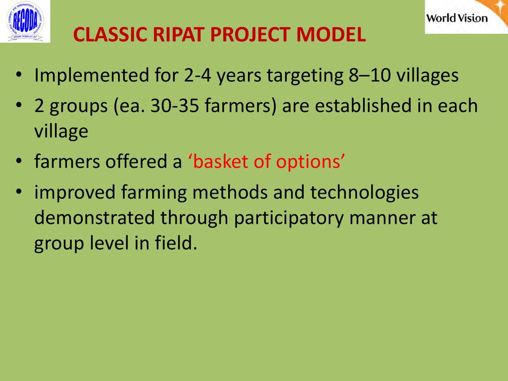 RIPAT (Rural Initiatives for Participatory Agricultural Transformation) is a participatory extension approach aims to close the agricultural technology gap as a means of improving livelihoods and self-support among rural small-scale farmers. The approach is as well a documented step-by-step guide on how organizations working with small-scale farmers can transfer various technologies aiming at improving the food and nutrition security and income of poor small scale farmers in the Global South. The approach provide solutions to why so many agricultural development projects have generated so little impact among rural farmers, and why so many improved agricultural technologies are developed – but not adopted by small scale farmers. The RIPAT was developed by RECODA in cooperation with the Rockwool Foundation (RF) and that process was funded by the RF; but of recently (2017), World Vision Tanzania (WVT) and RECODA have co-owned RIPAT – hence this is a joint presentation.