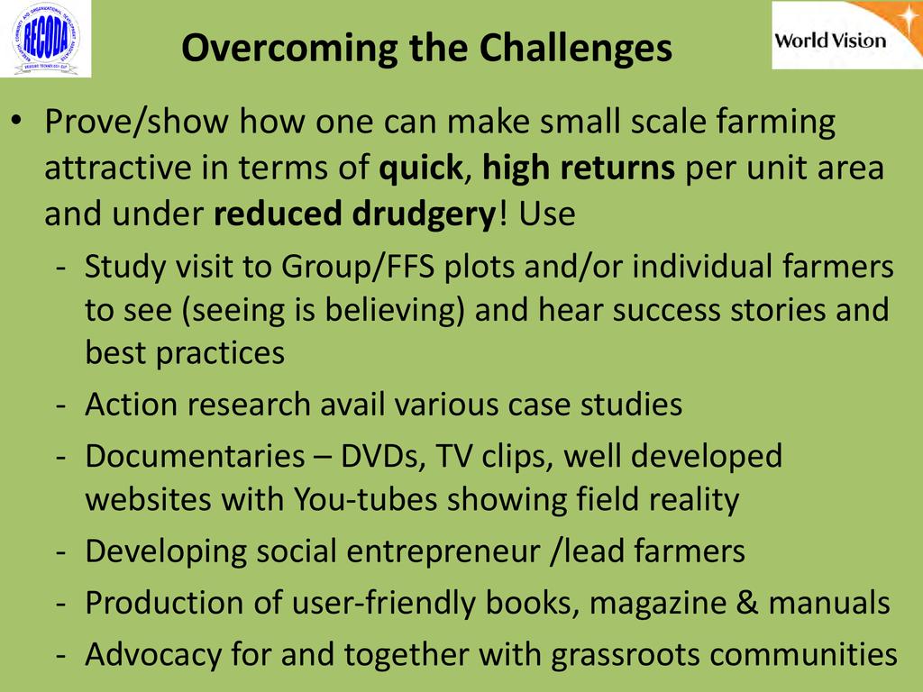 Presenter : Dominick Ringo is the Executive Director of RECODA, where he has worked for 14 years. Formerly, he worked under the Ministry of Agriculture in Tanzania as a research officer in the Soil Science Department at Uyole (Southern Highland zone) and then Selian (Northern zone) Agricultural Research Institutes. At RECODA, he has worked as a consultant in agricultural project design, implementation, and evaluation; in organizational capacity building; in policy analysis; and in advocacy. He has contributed to design RIPAT approach and supervises its implementation and is a co- author of RIPAT manual. He authored a case study publication entitled Conservation agriculture as practised in Tanzania: Karatu district in 2007, and was a contributor to the book Conservation agriculture: A manual for farmers and extension workers in Africa.