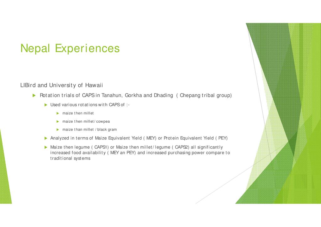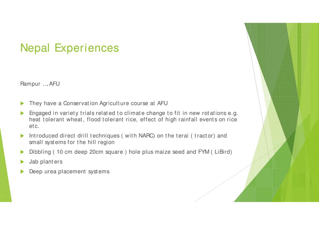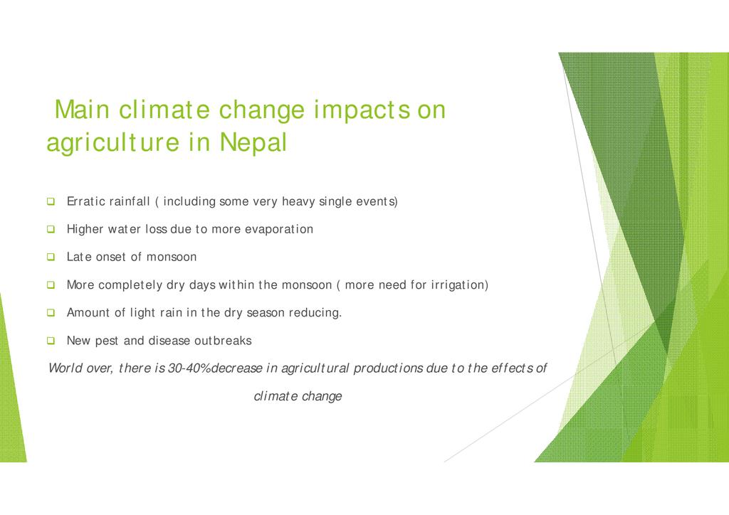 This presentation discusses climate change, including impacts specific to agriculture in Nepal, and approaches to mediate its effects.