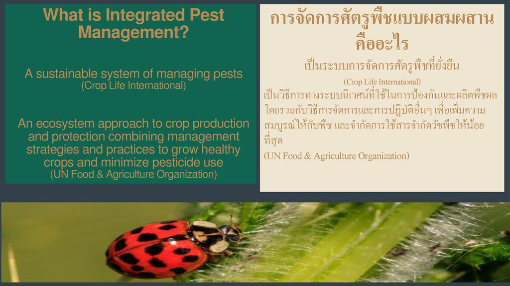 This is an introductory overview of Integrated Pest Management as a management system and includes a summary of prevention, cultural, physical, biological, and chemical controls.