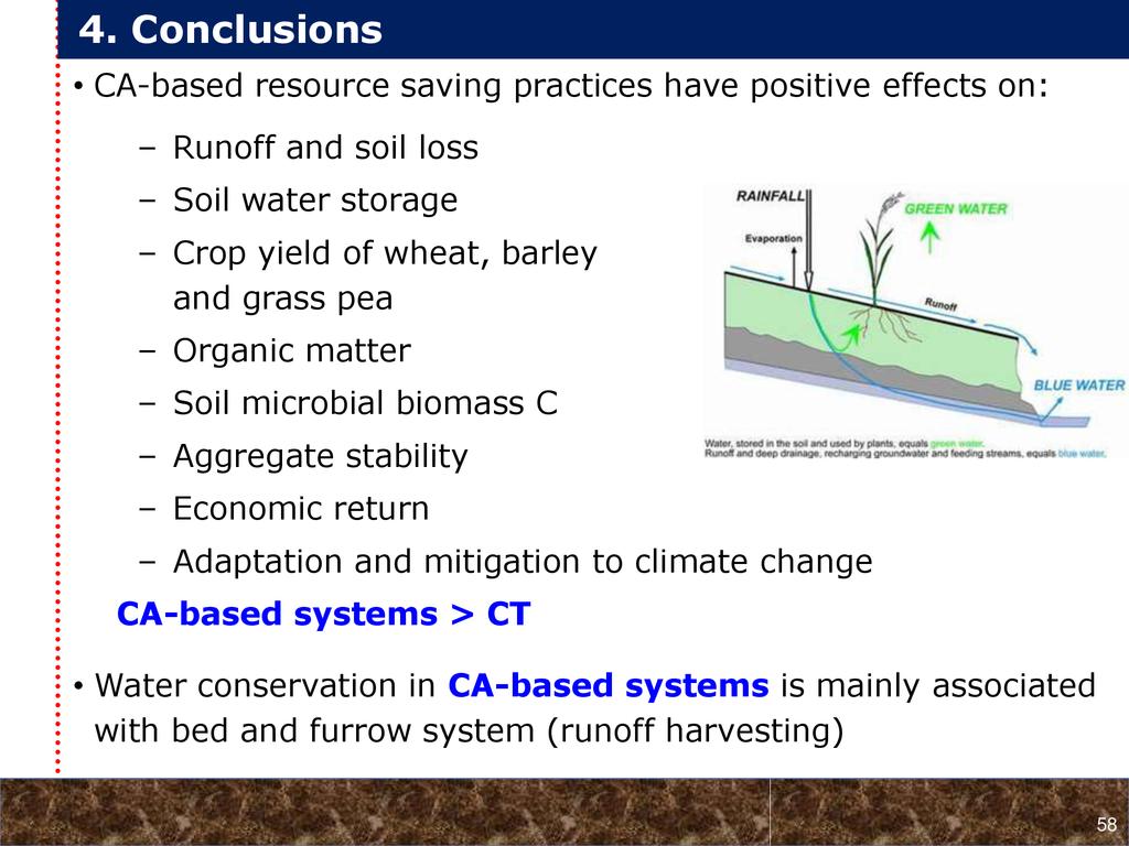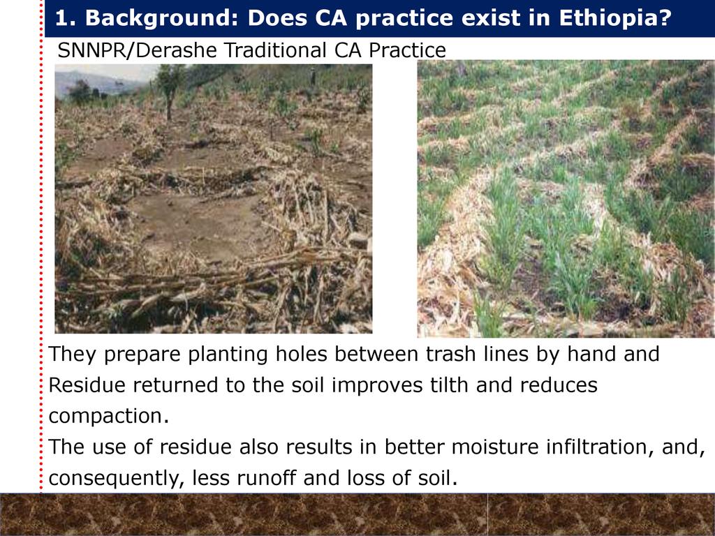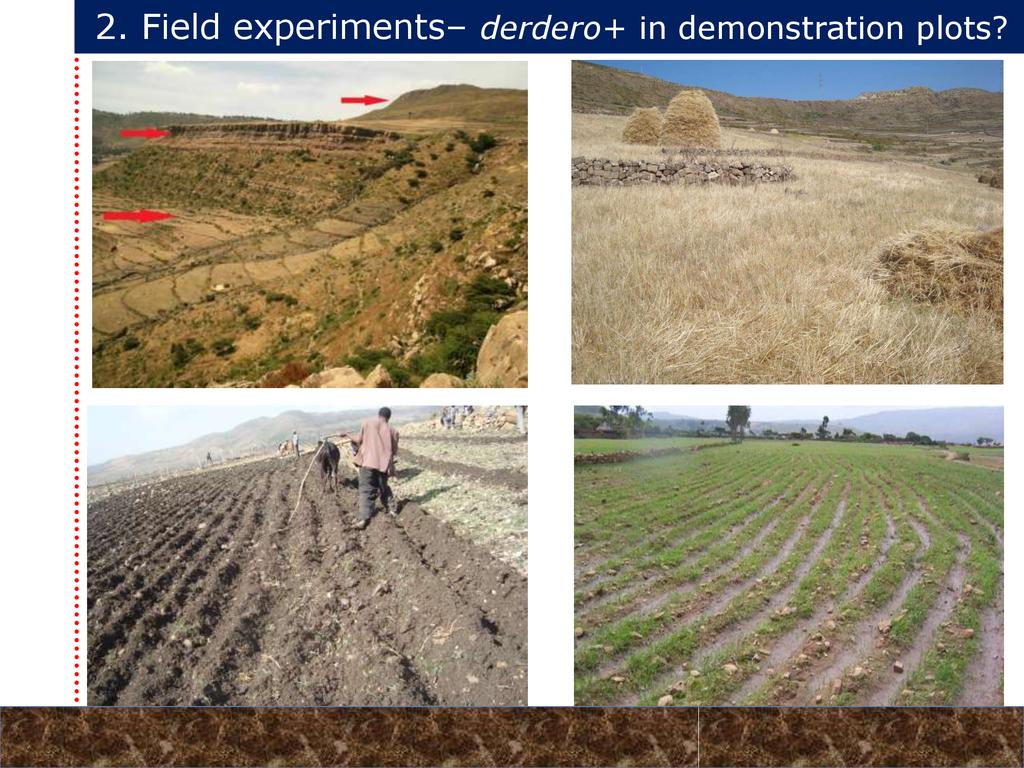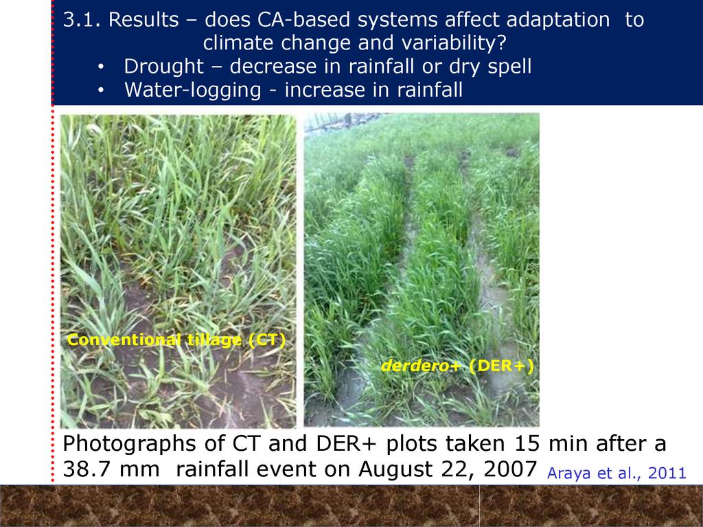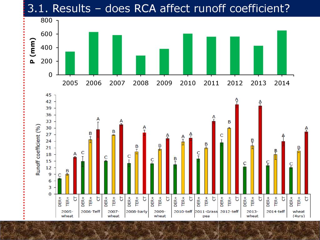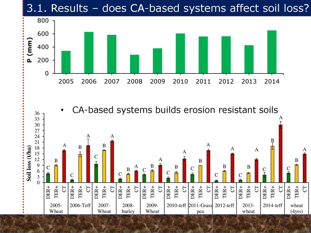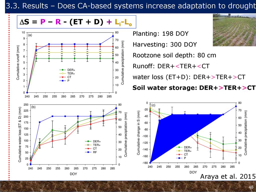On average, crop yields under DER+ and TER+ increased by 30% and 16%, respectively, as compared to CT. Our study demonstrates that field water conservation tillage practices that incorporate CA principles are effectively increasing green water in the root zone available for crops. RCA systems constitute an in-situ soil and rainwater conservation strategy in northern Ethiopia that increase agro-ecosystem.