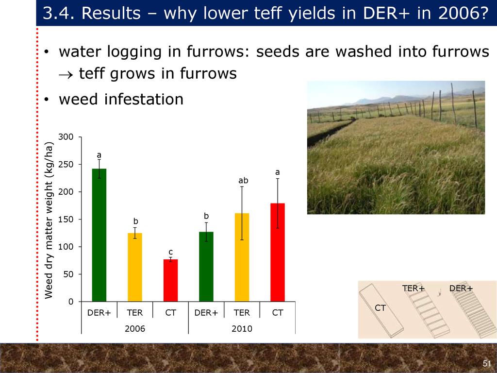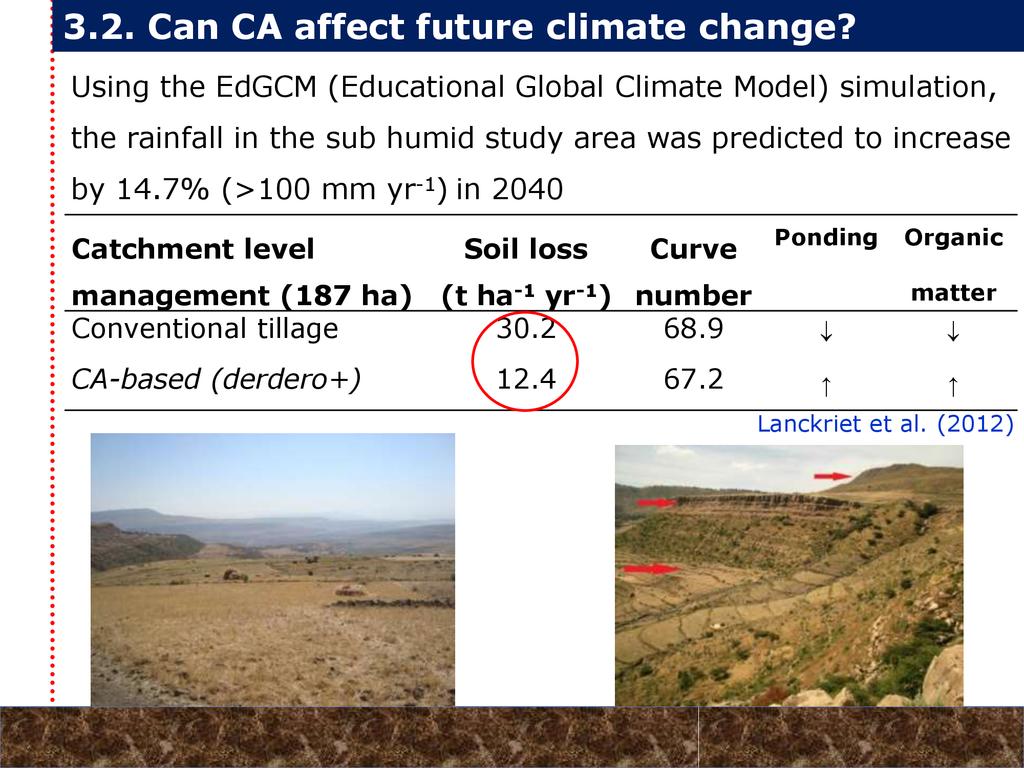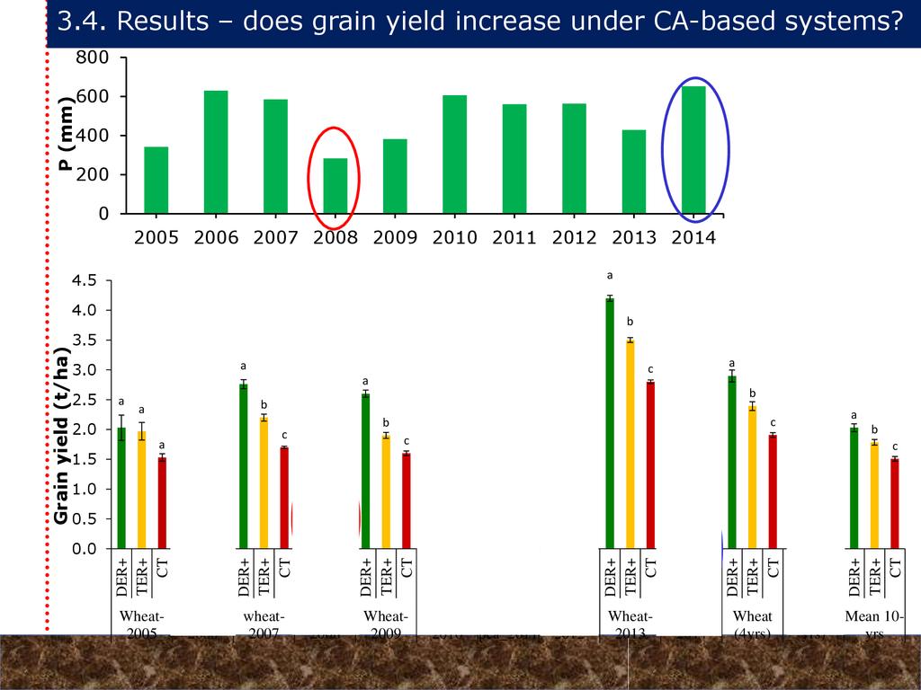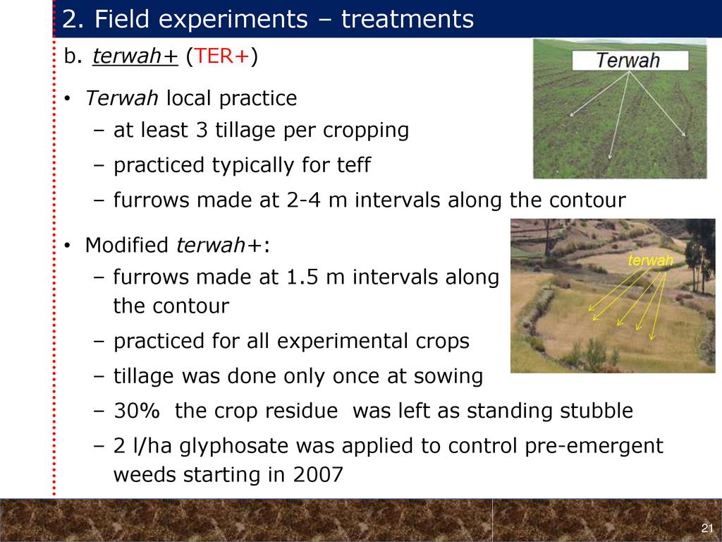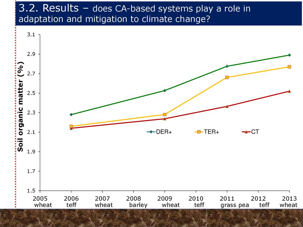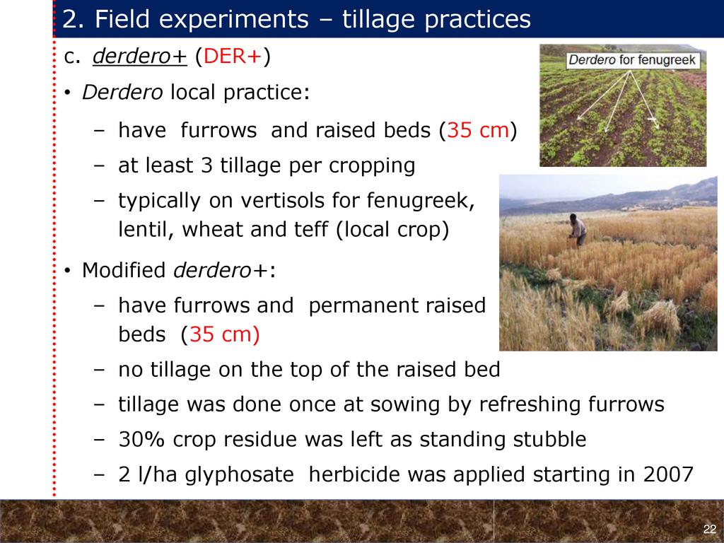 On average, crop yields under DER+ and TER+ increased by 30% and 16%, respectively, as compared to CT. Our study demonstrates that field water conservation tillage practices that incorporate CA principles are effectively increasing green water in the root zone available for crops. RCA systems constitute an in-situ soil and rainwater conservation strategy in northern Ethiopia that increase agro-ecosystem.