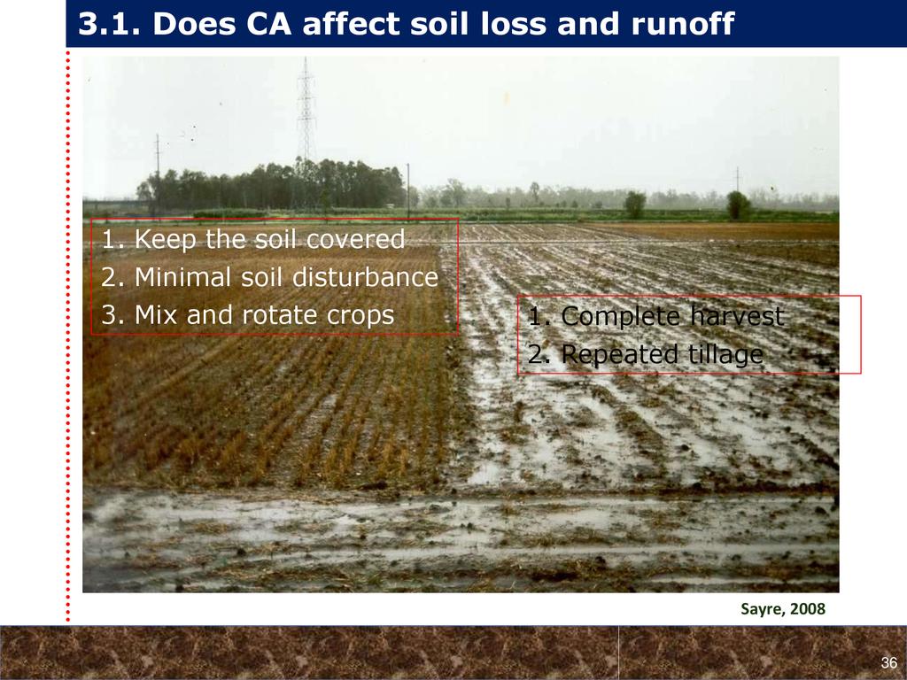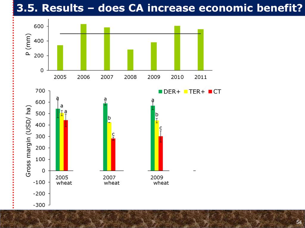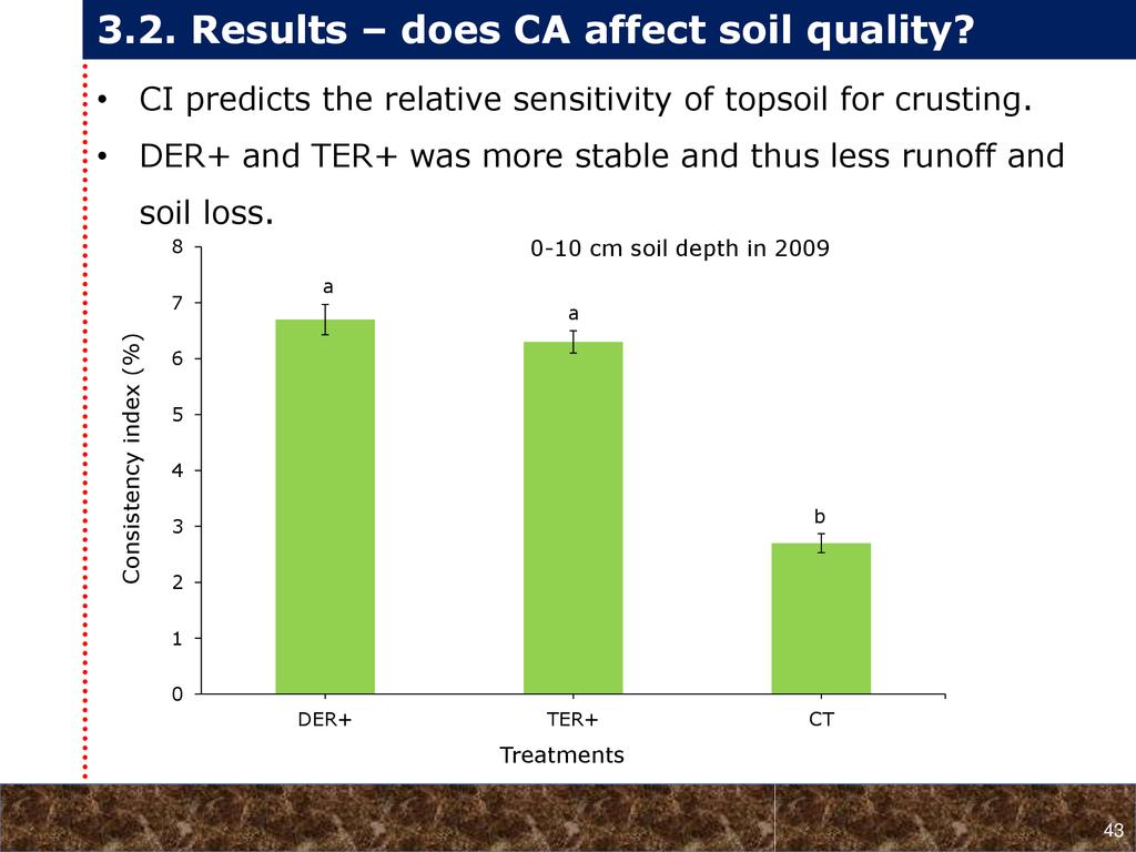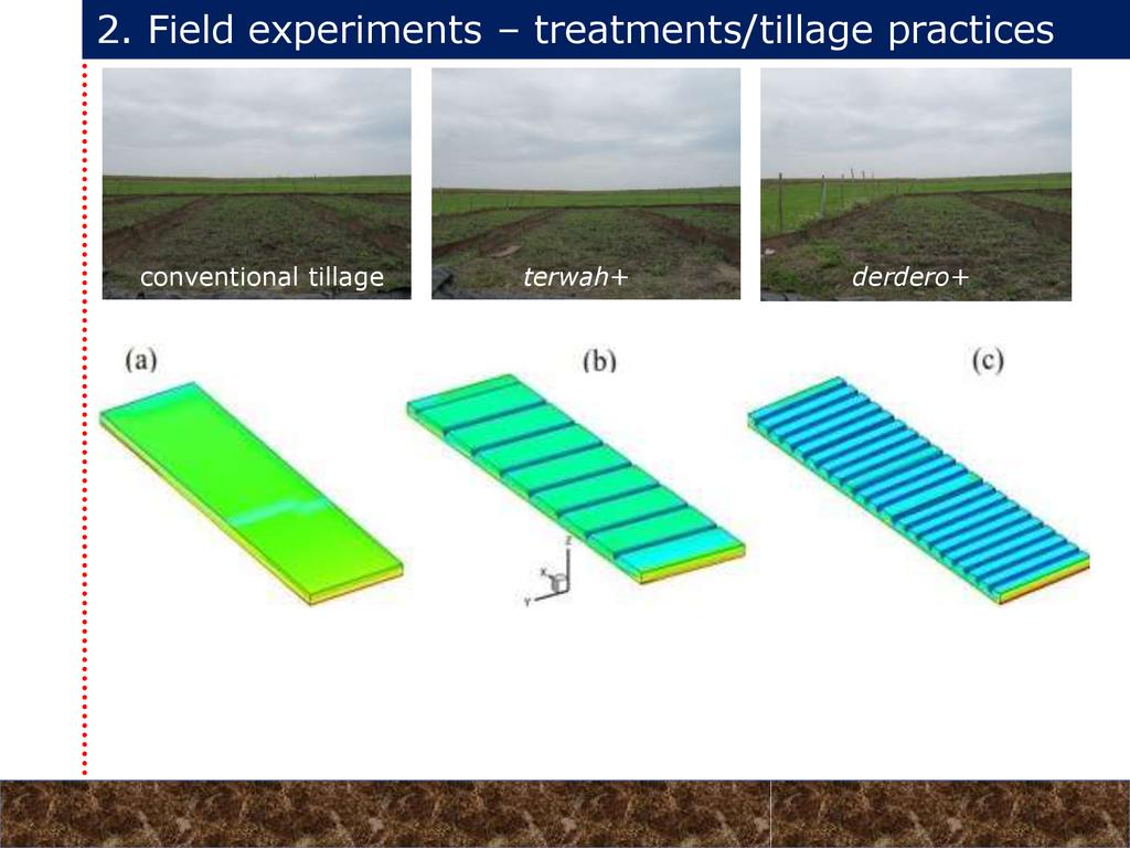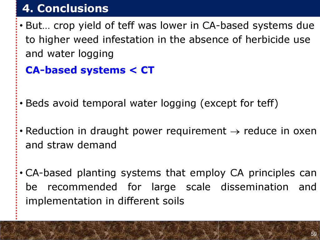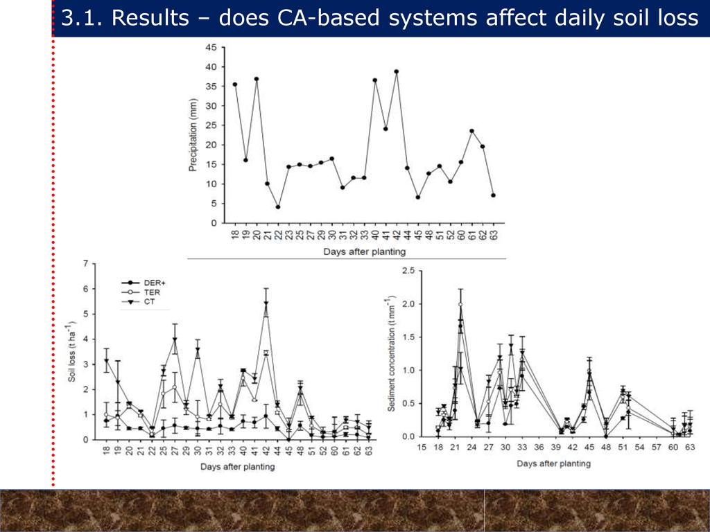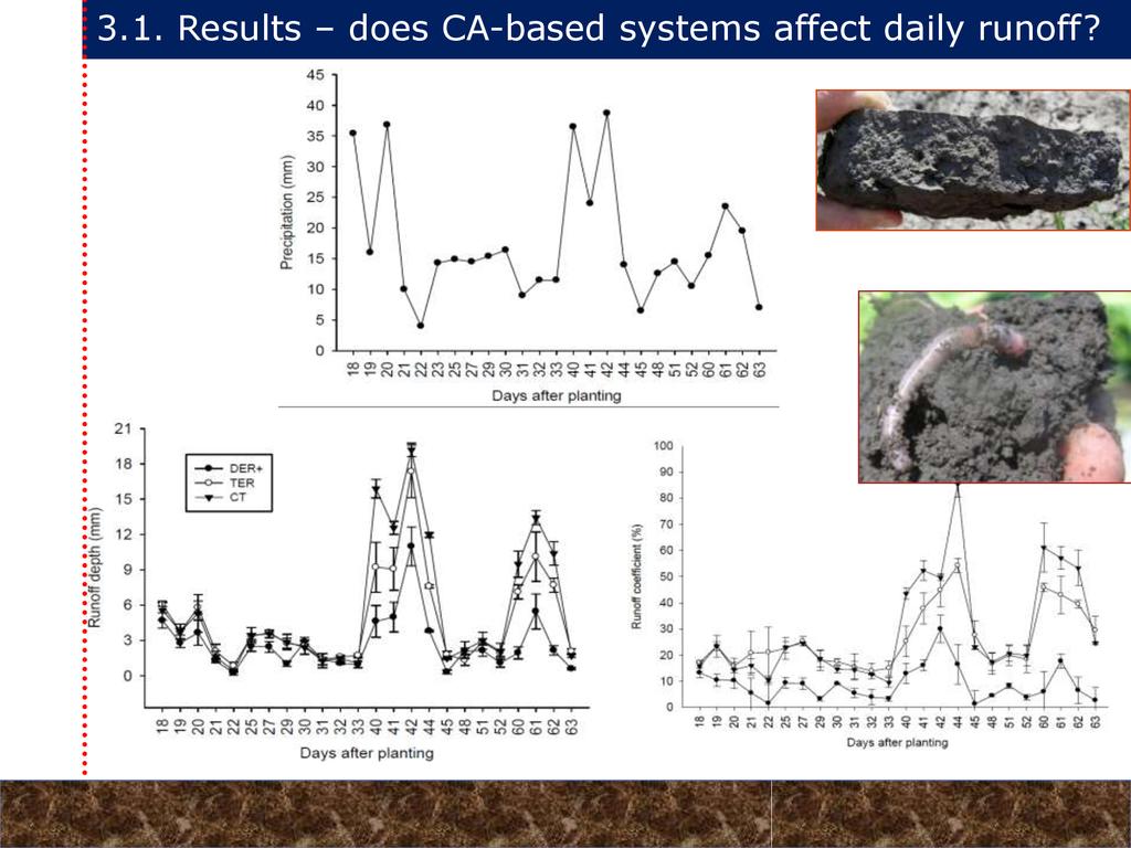 On average, crop yields under DER+ and TER+ increased by 30% and 16%, respectively, as compared to CT. Our study demonstrates that field water conservation tillage practices that incorporate CA principles are effectively increasing green water in the root zone available for crops. RCA systems constitute an in-situ soil and rainwater conservation strategy in northern Ethiopia that increase agro-ecosystem.