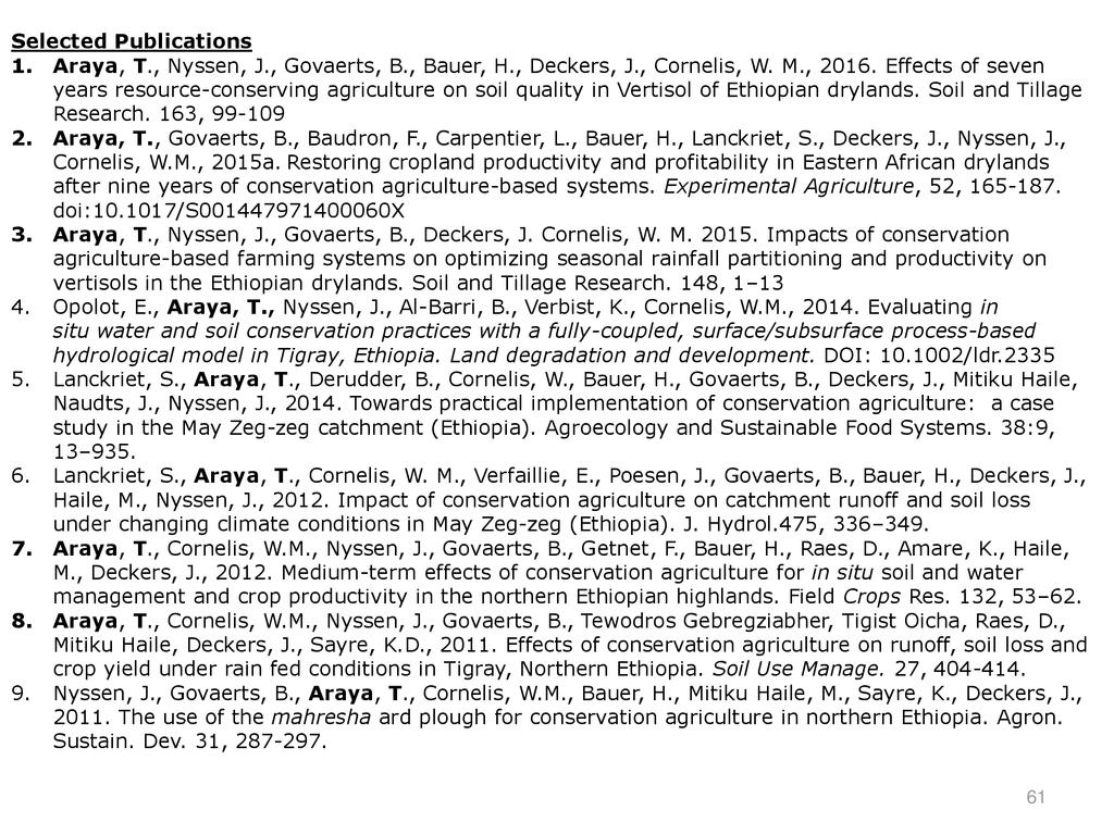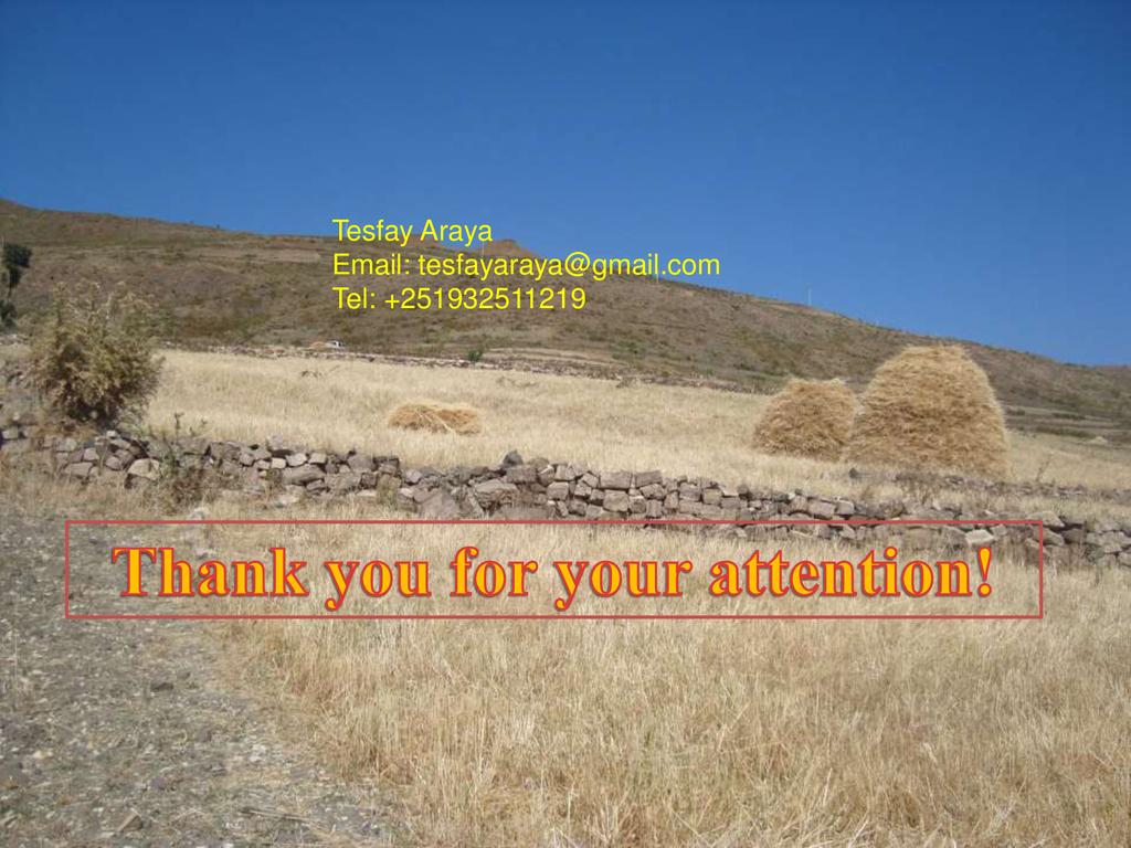 Presenter: Tesfay Araya is the Associate Professor of Soil Science in the Department of Dryland Crop and Horticultural Science in Mekelle University, Ethiopia. (September 2014-August 2015) in the Department of Agronomy in University of Fort Hare, South Africa. Tesfay completed his PhD study in Applied Biological Sciences: Land and Forest Management, Ghent University, Belgium (from 2008-2012). His PhD thesis title was "Conservation Agriculture (CA)-based resource saving technology for land resilience in northern Ethiopia". He obtained a MSc. in Crop production from Hebrew University of Jerusalem, Israel, and BSc in Dryland Crop Science from Mekelle University, Ethiopia.